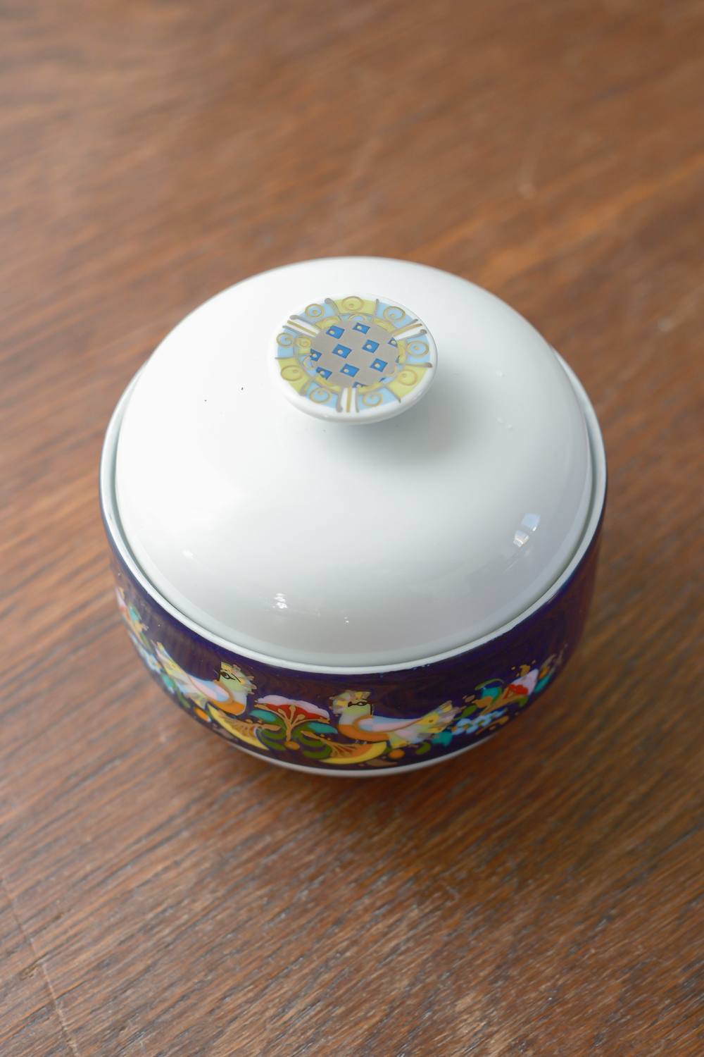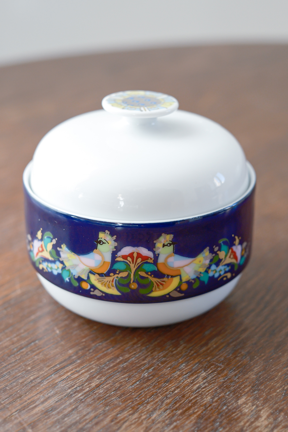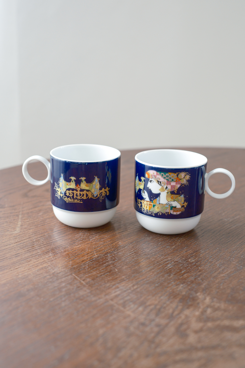 Sada na kávu v kobaltově modré barvě s výrazným barevným dekorem od německé porcelánky Rosenthal dle návrhu dánského malíře a designéra Bjørn Wiinblada. K charakteristickým rysům jeho tvorby patří rozmarní lidé s kulatými tvářemi, oblečení v nejasném kostýmu z 19. století. Často jsou obklopeny přírodními prvky: vinnou révou, květinovými věnci a fantastickými stromy. Jeho barvy jsou syté a výrazné – někdy až psychedelické – a často je doplňuje kovová zlatá nebo stříbrná.