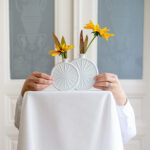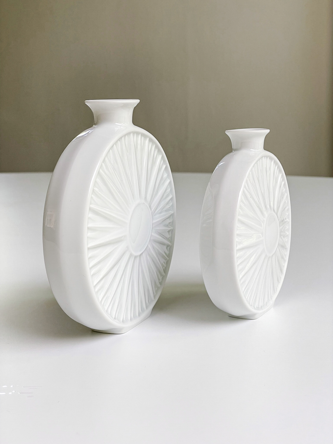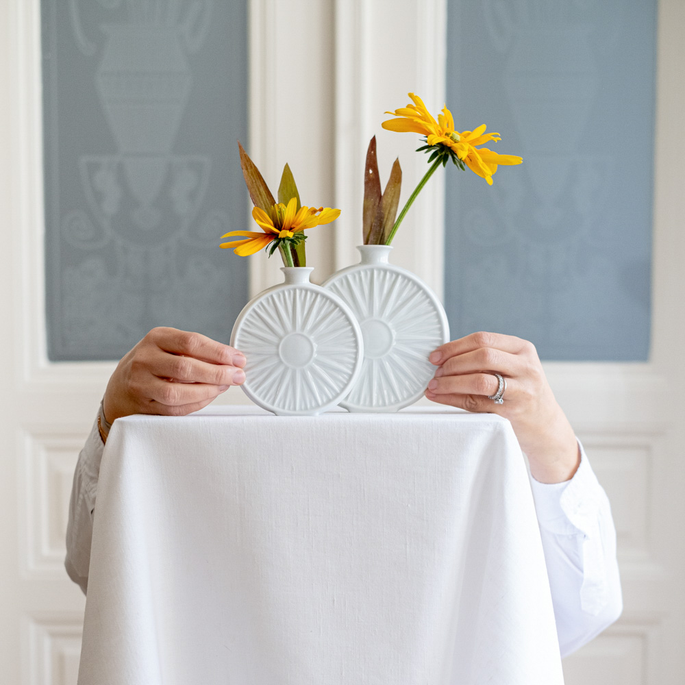 Dvojice menších váziček od německé porcelánky Hutschenreuther, které mají originální tvar připomínající slunce. Vhodné na jednu květinu.