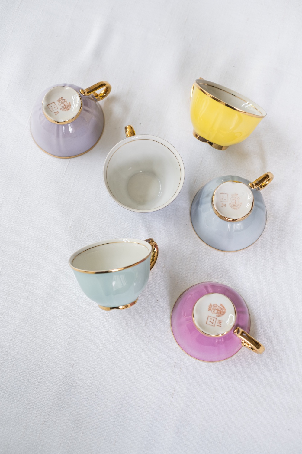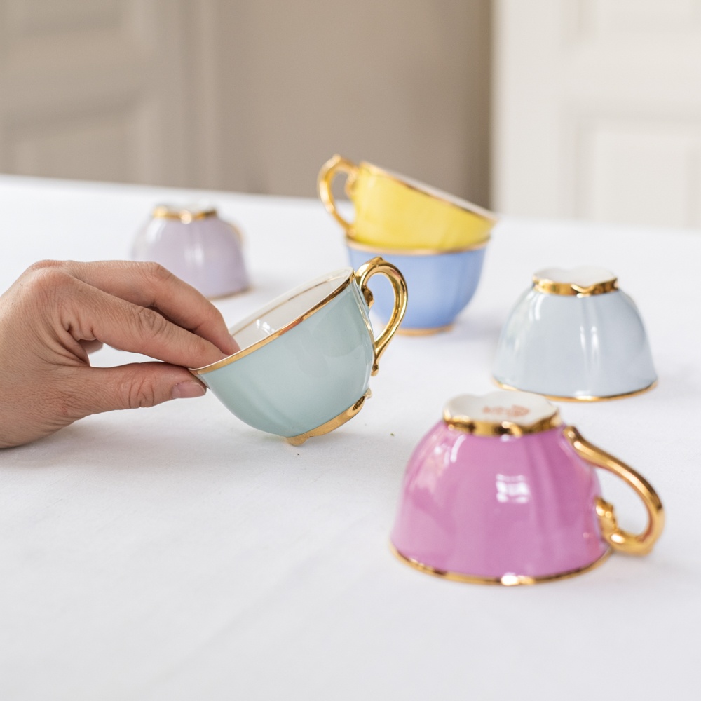 Kávová či mocca souprava z českého porcelánu. Luxusní výrobek karlovarské továrny na porcelán v Božíčanech, značeno MSB. Sada je ideálních pro návštěvu, každý má totiž jinou barvu a tak si dobře zapamatujete, komu patří.