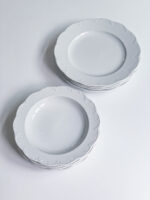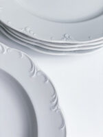 Sada bílých jídelních (mělké a hluboké) talířů pro 4 osoby od německé porcelányk Rosenthal, z řady Classic rose monbijou. Talíře mají silnější střep a jsou po okraji zdobeny plastickou vlnou.