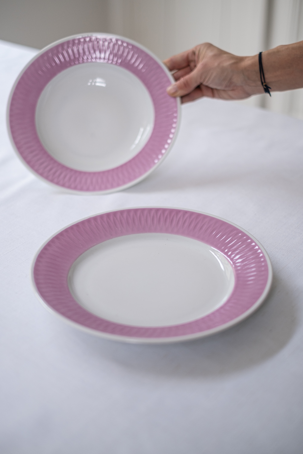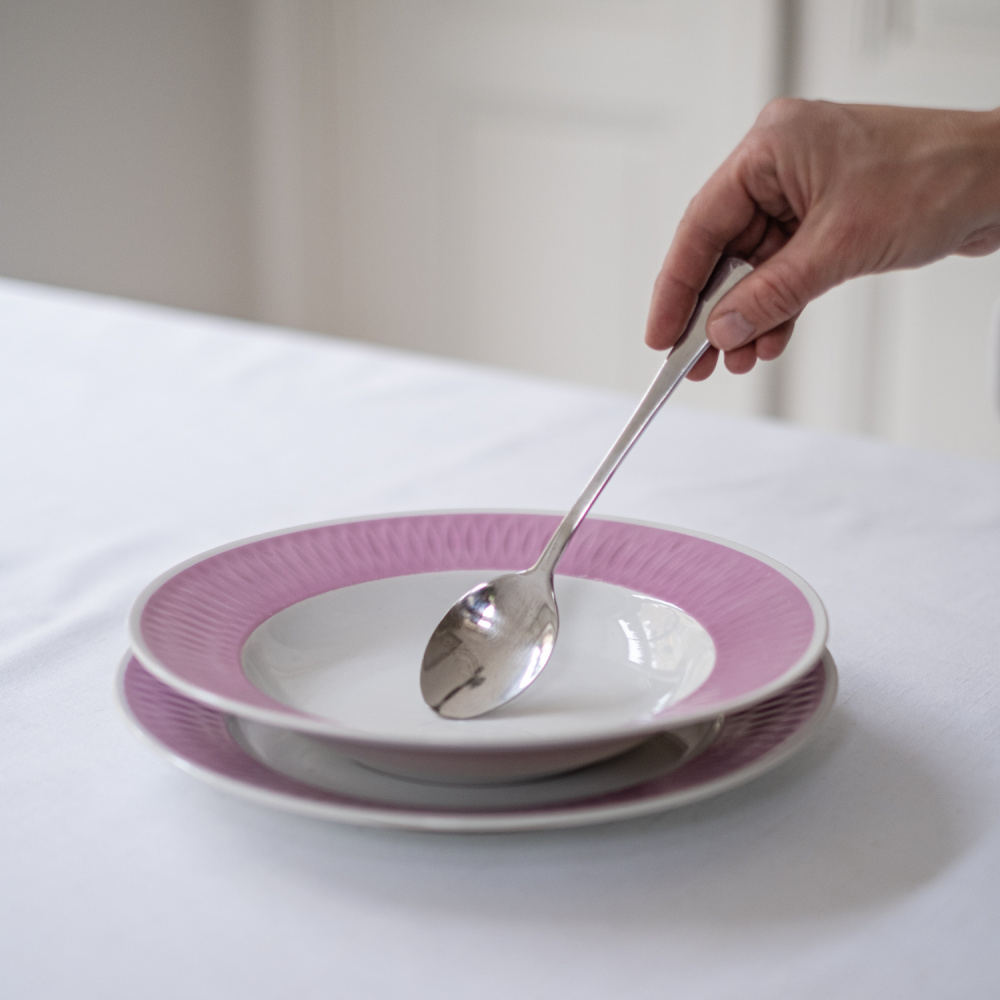 Souprava mělkého a hlubokého talíře se širokým růžovým pruhem působí velmi svěže. Lem je navíc krásně perforovaný. V hlubokém talíři vidím vývar s nudličkami a jako druhé jídlo ovocné knedlíky.Ovšem pokud holdujete spíše masu, takové pečené kuře s bramborem a pažitkou se bude na pastelovém talíři také krásně vyjímat. Soupravu máme k dispozici také ve žlutém provedení.