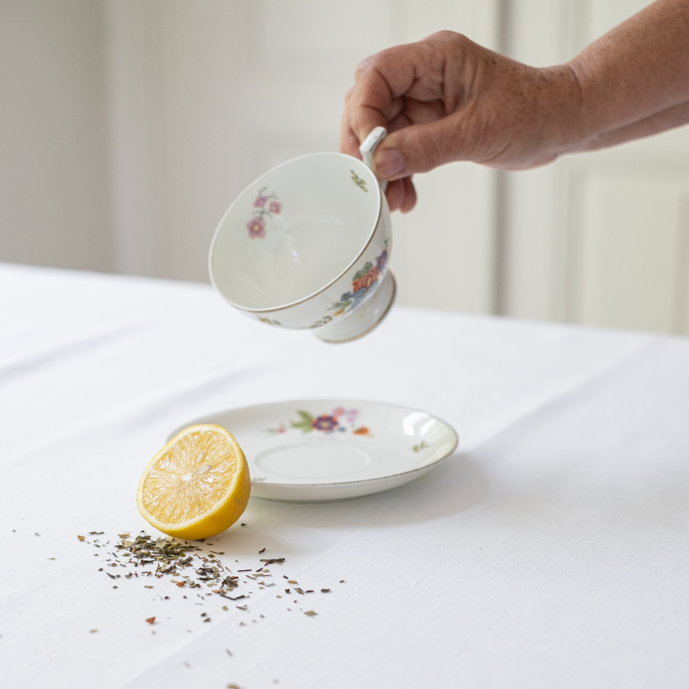 Starožitný hrneček na čaj zdoben něžnými květinami uvnitř a zvenku většími pugéty. Secesní ouško se zlatou linkou nese známky patiny, hrneček byl u někoho asi velmi oblíbený. Podšálek je zdoben stejně bohatě jako samotný hrneček. Střep je tenký.