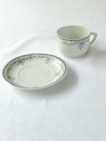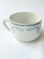 Klasický vintage šálek na čaj zdobený zlatou linkou a ručně malovanými kvítky v petrolejové barvě. Jsou buclatého tvaru, který může evokovat mohutnost, ve skutečnosti jsou ale z tenkého porcelánu.