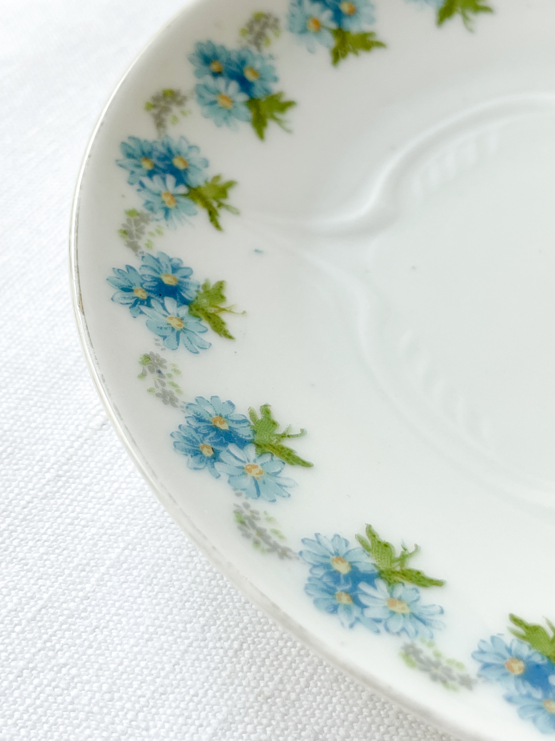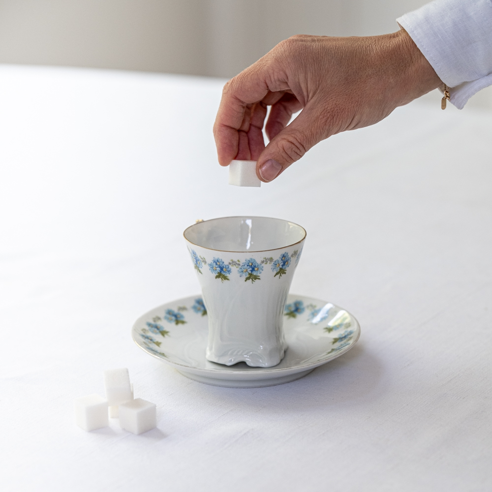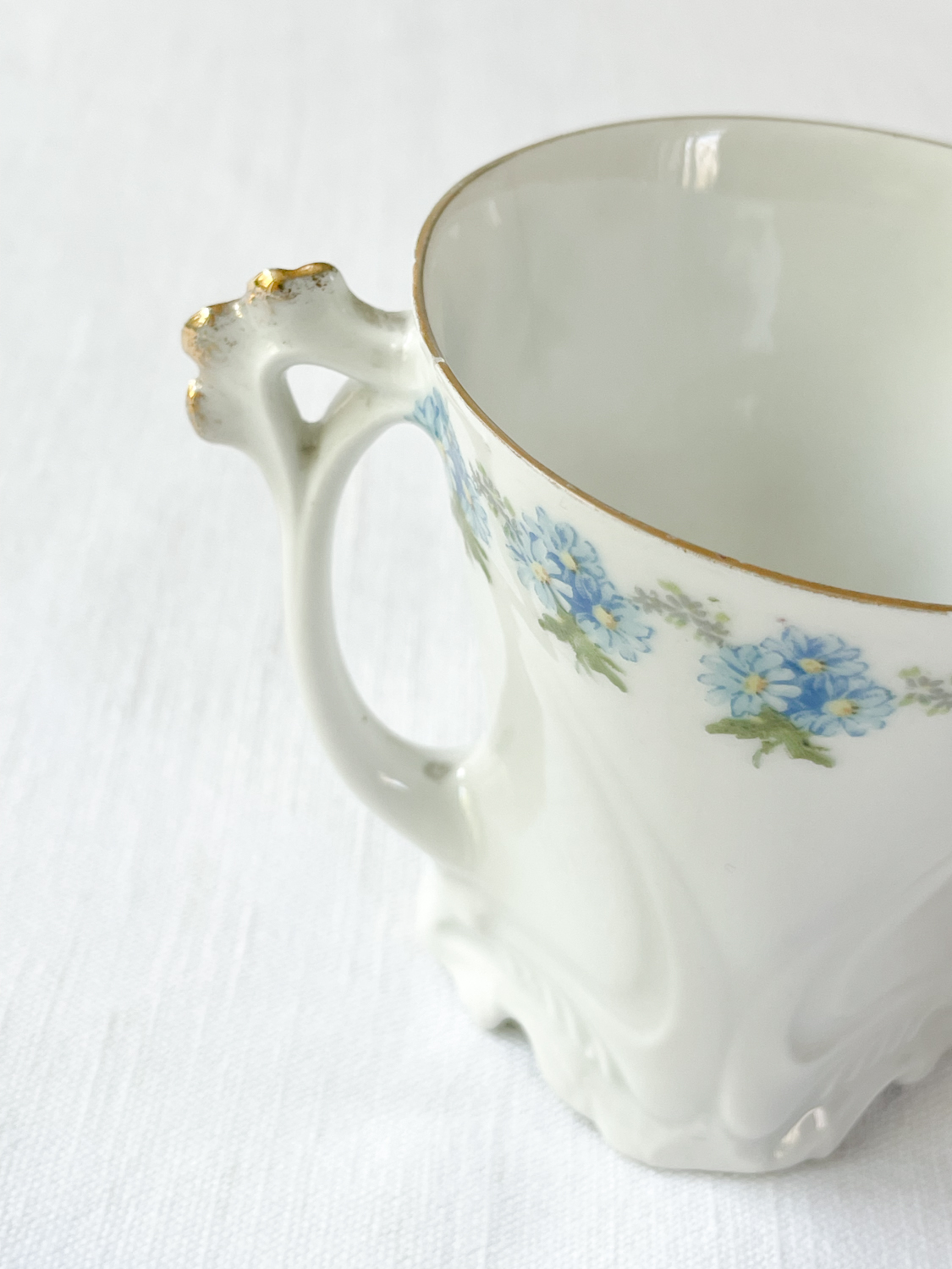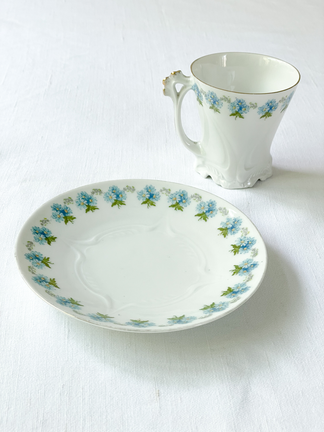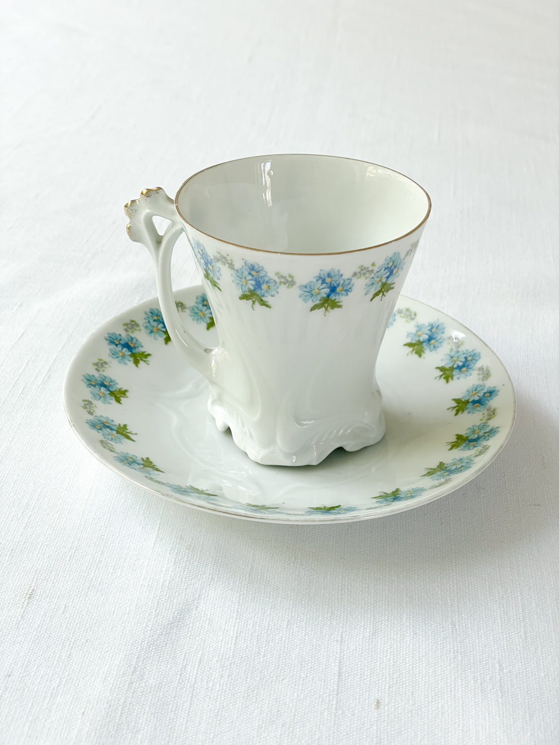Starožitné secesní šálky na čaj s velmi žádaným motivem ručně malovaných pomněnek. Hrnečky mají atipický tvar s reliéfně zdobenou spodní částí a krásně tavrovaným uchem. Při pití čaje si budete připadat jak na zámku.