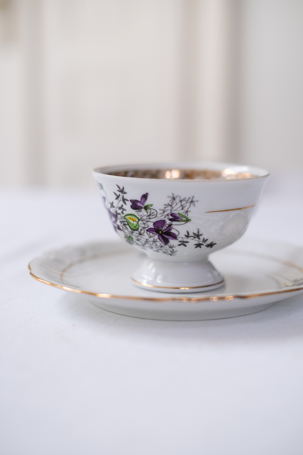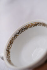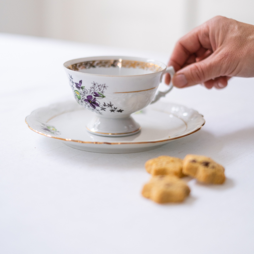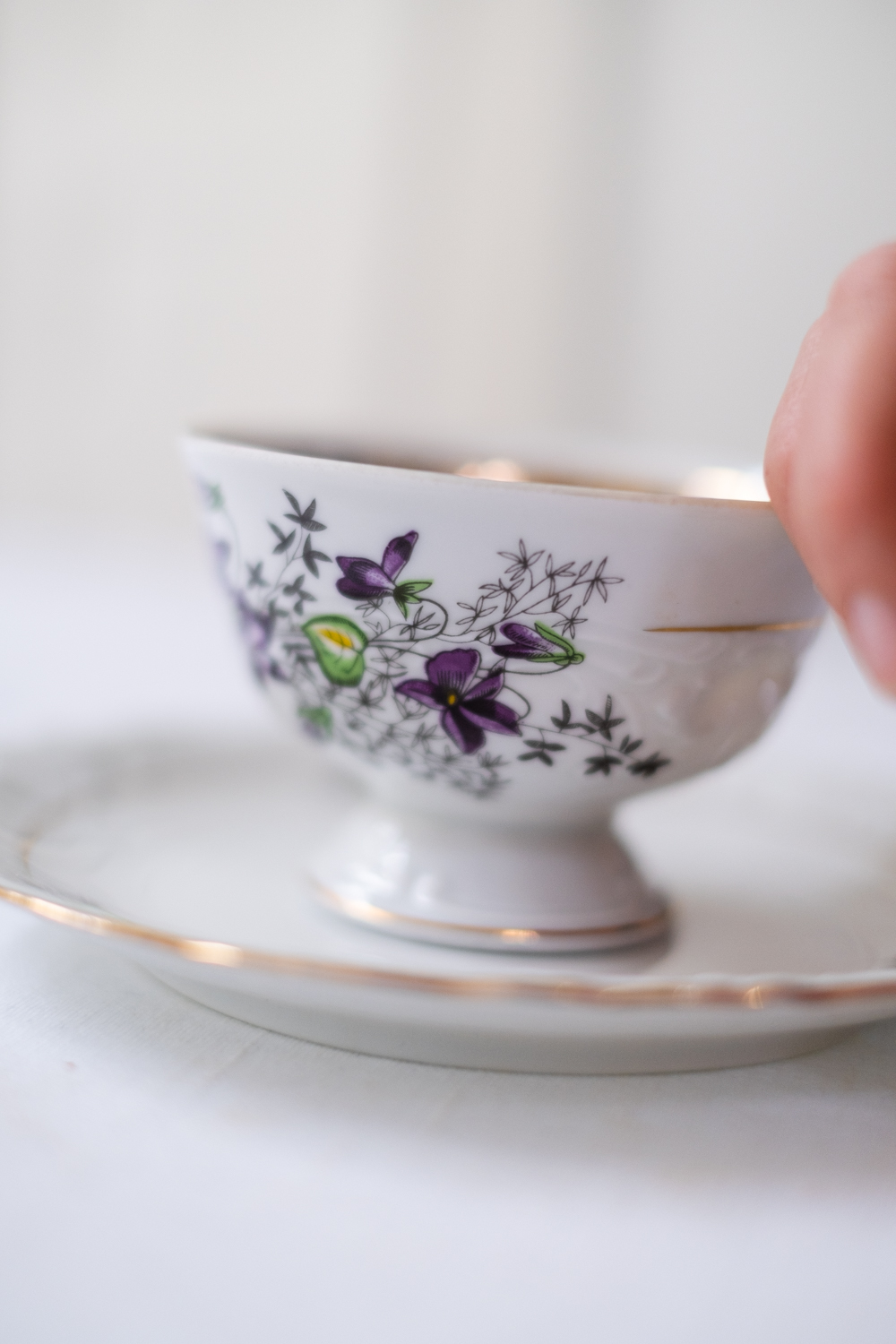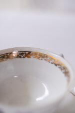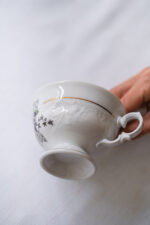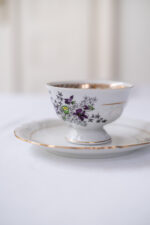 Opět zde máme jeden motiv fialek. Velmi zdobný hrneček, který v sobě skrývá snad všechny možné způsoby dekoru. Atipický tvar, tvarované ouško, zlaté zdobení vně a dokonce i uvnitř hrnečku, reliefní dekor a navíc barevný motiv fialek. Jste-li zastánci hesla „čím víc, tím líp“ (nicméně s vkusem), našli jste ten pravý hrneček na čaj.
