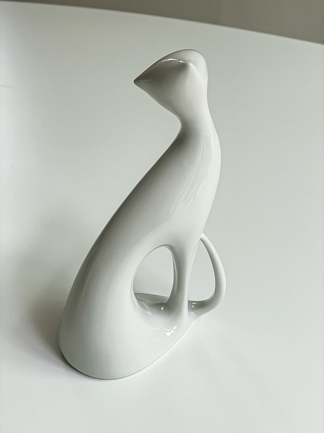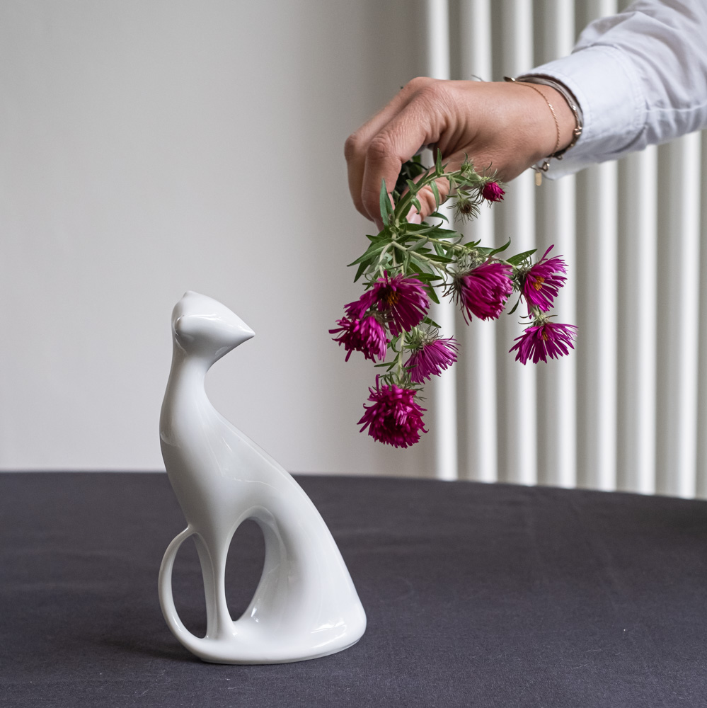 Soška sedící kočky od výtvarníka Jaroslava Ježka pro Dux. Návrh pochází z konce 50. let minulého stoletít, kdy jsou těla tvořena soustavou křivek a záměrně jsou potlačeny nepodstatné detaily. Kočka není zachycena v pohybu, ale v elegantní póze v sedě.