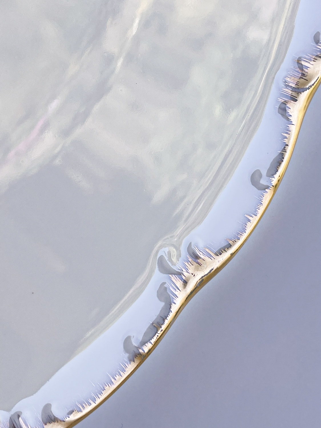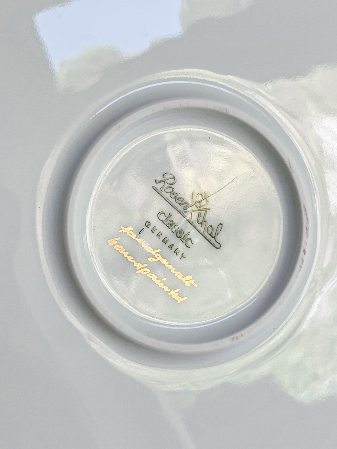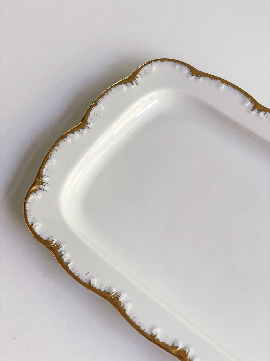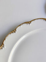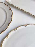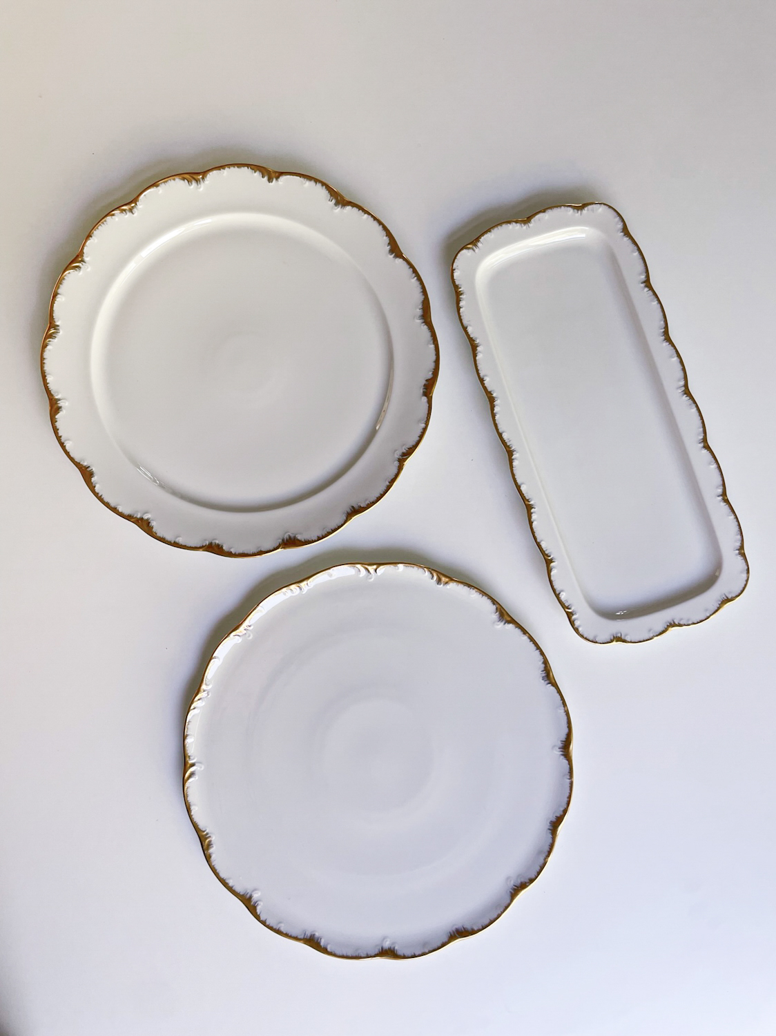 Krásná slavnostní sevírovací sada od německé porcelányk Rosenthalm tvořená mísou na cukroví či chlebíčky, podkladovým talířem na dort a kulatým tácem na koláč nebo jednohubky. Zajímavá je kombinace klasického plastického zdobení po obvodu a moderním pojetím zlaté linky, která jakoby z okrajů stýká.