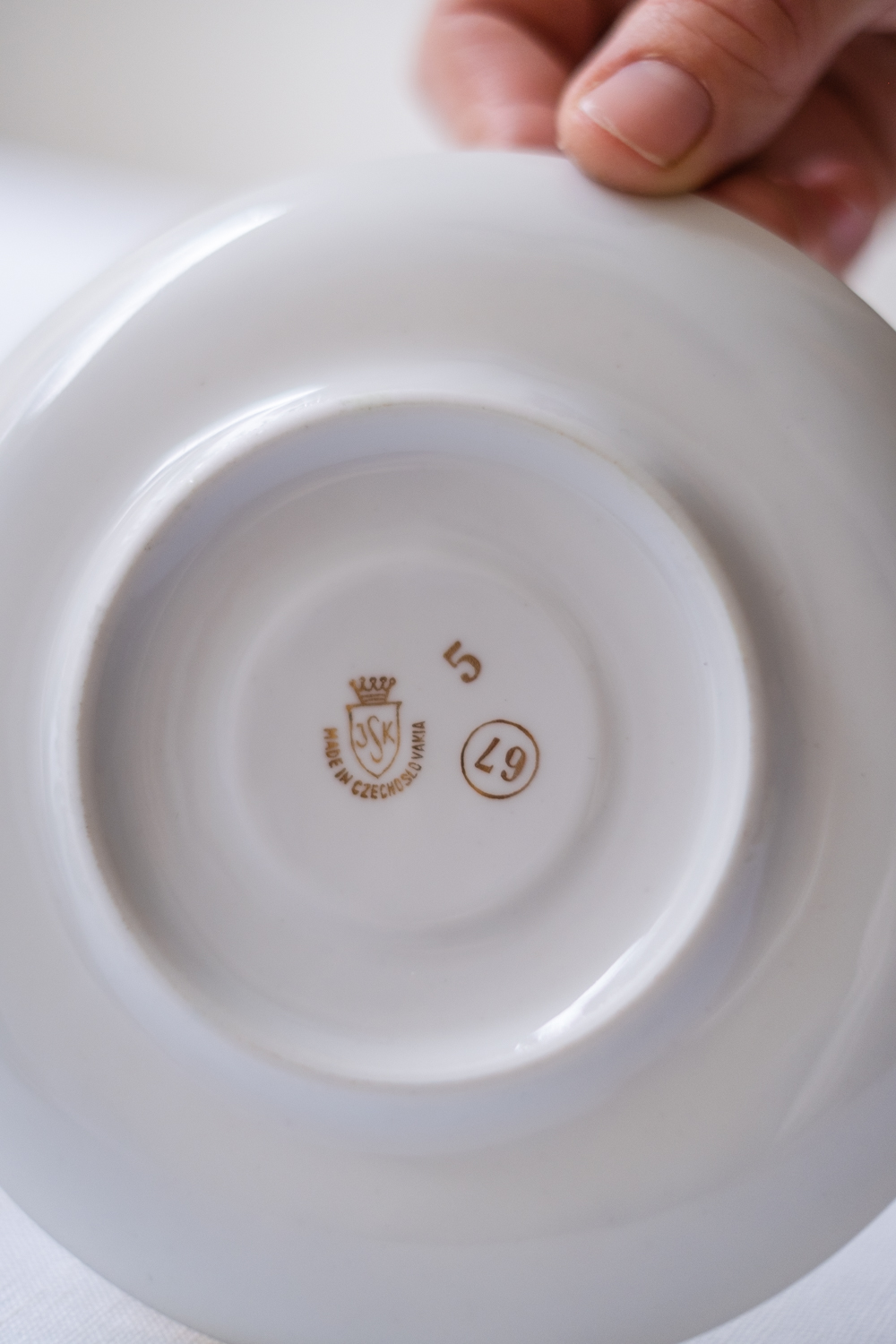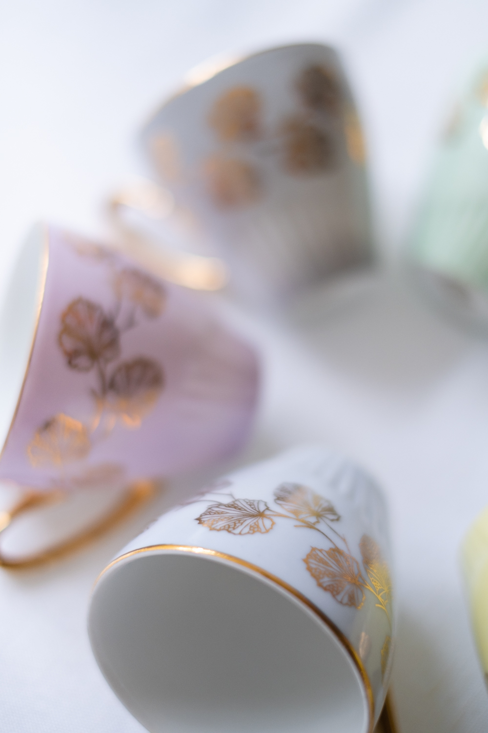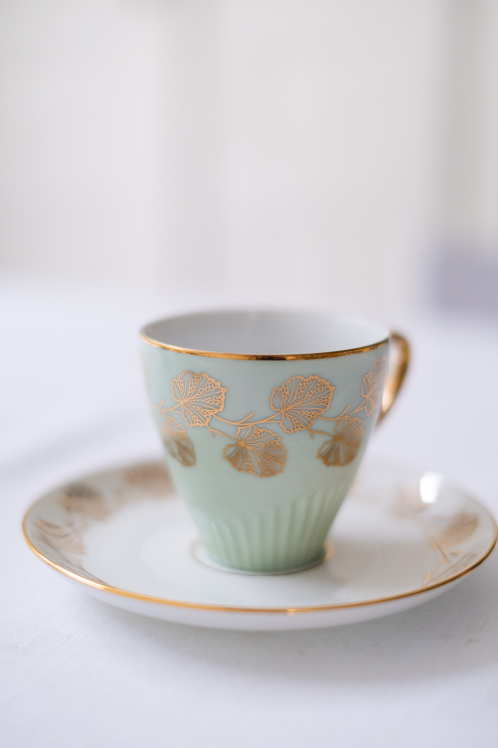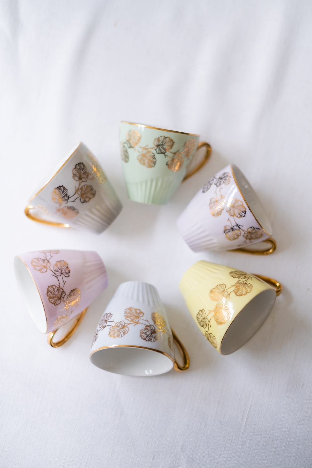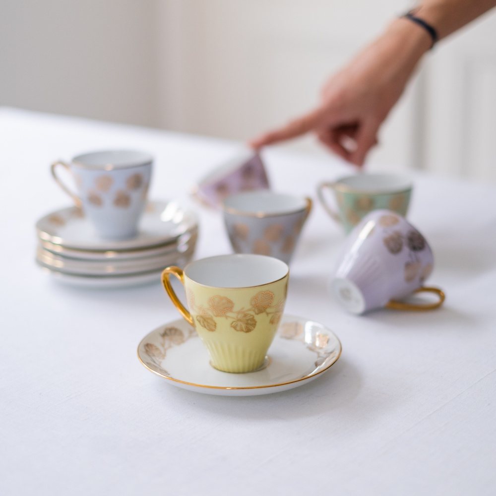 Šest šálků s podšálky v nyní tolik žádaném bruselském stylu jsou zdobeny zlatými motivy listů namalovanými na jemně pastelové barevné glazuře. Zlatá barva se opakuje i na oušku a tenké lince po obvodu. Hrnečky pocházejí z porcelánky JSK Stružná, Kysibl (Gieshüebel), založené roku 1803 a fungující dodnes. Sada obsahuje mix barev – vanilková, mintová, 2x světle růžová, světle šedá a světloulilince šedá.