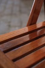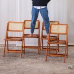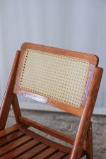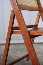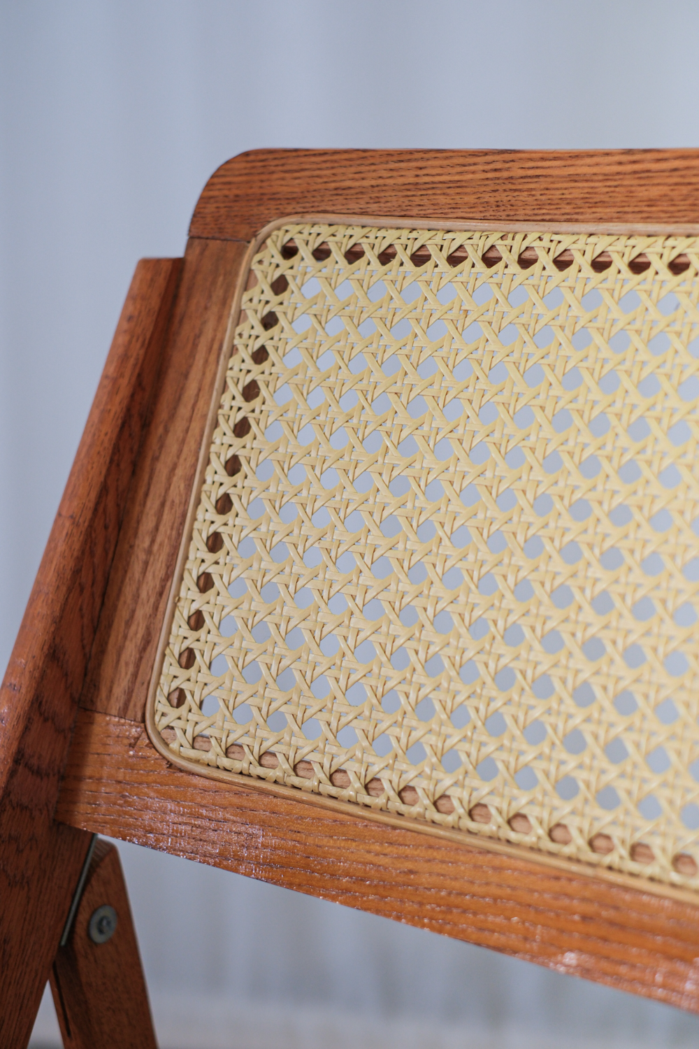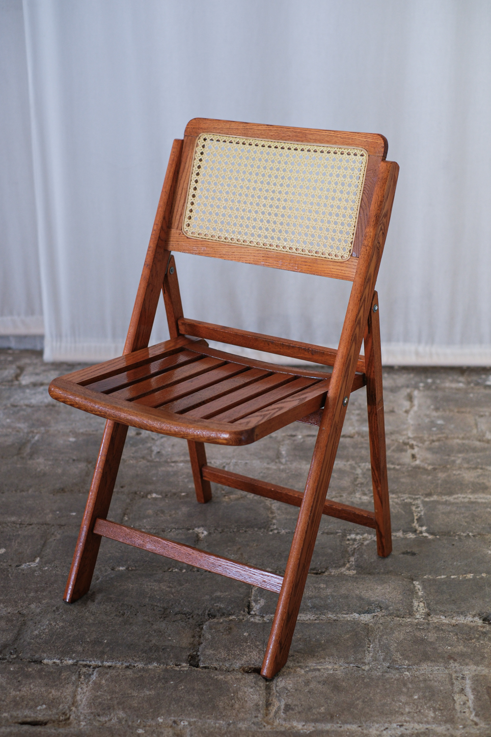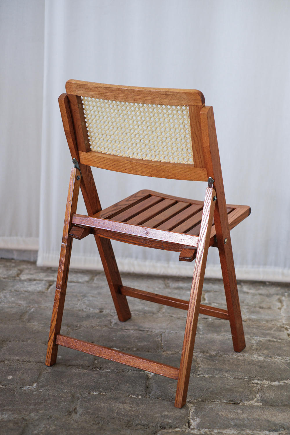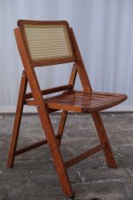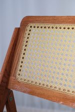 Praktická skládací židle z ohýbaného dřeva s lakovaným sedákem z latěk a opěrkou s ručně vyplétaným rákosovým výpletem. Spojuje jednoduchost, funkčnost a jemné retro kouzlo. Díky skládacímu mechanismu se snadno skladuje a hodí se jako doplňkové sezení do interiéru i na krytou terasu.