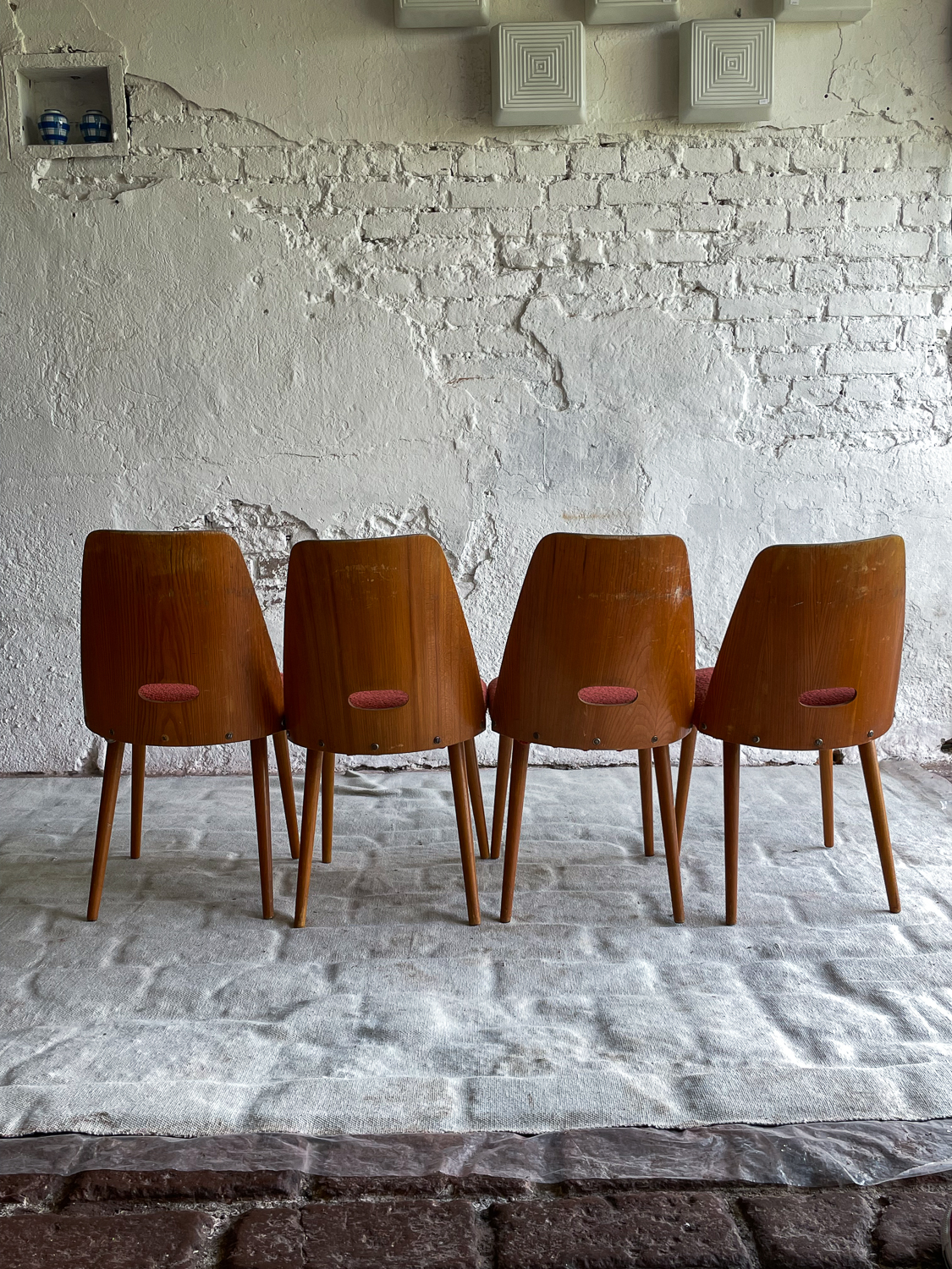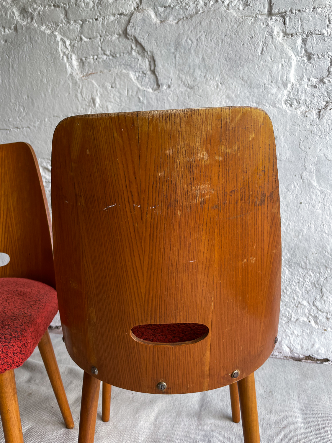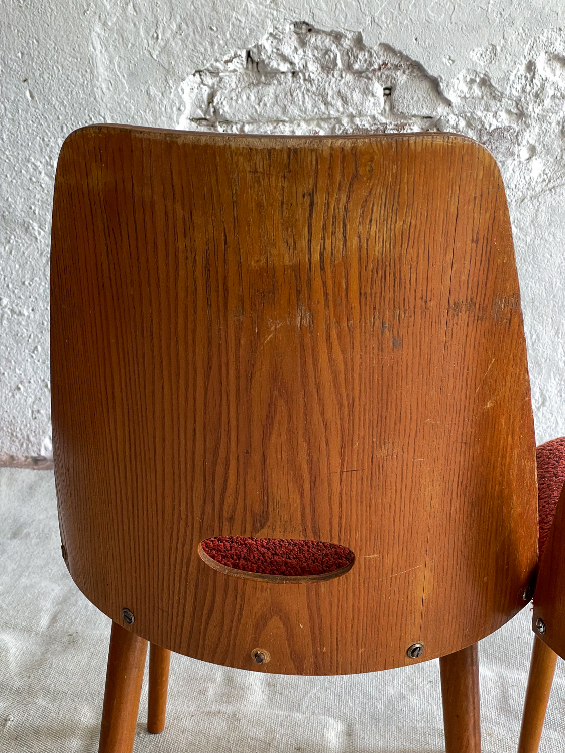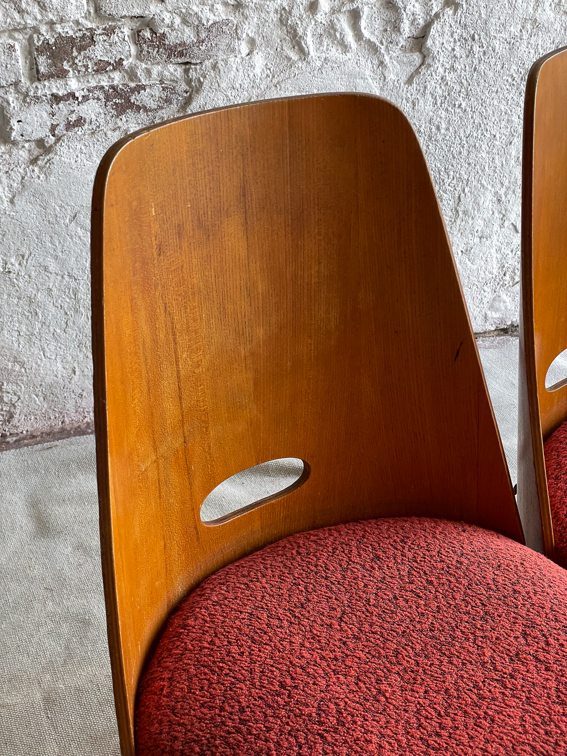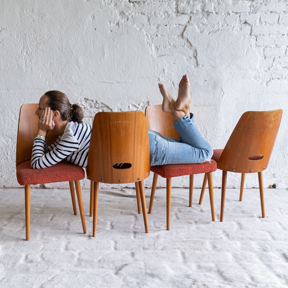Set oblíbených židlí s „dírou“ , které jsou vyrobeny z ohýbané dýhované překližky. Židlí v tomto stylu se vyrábělo velké množství a liší se především tvarem a velikostí otovru