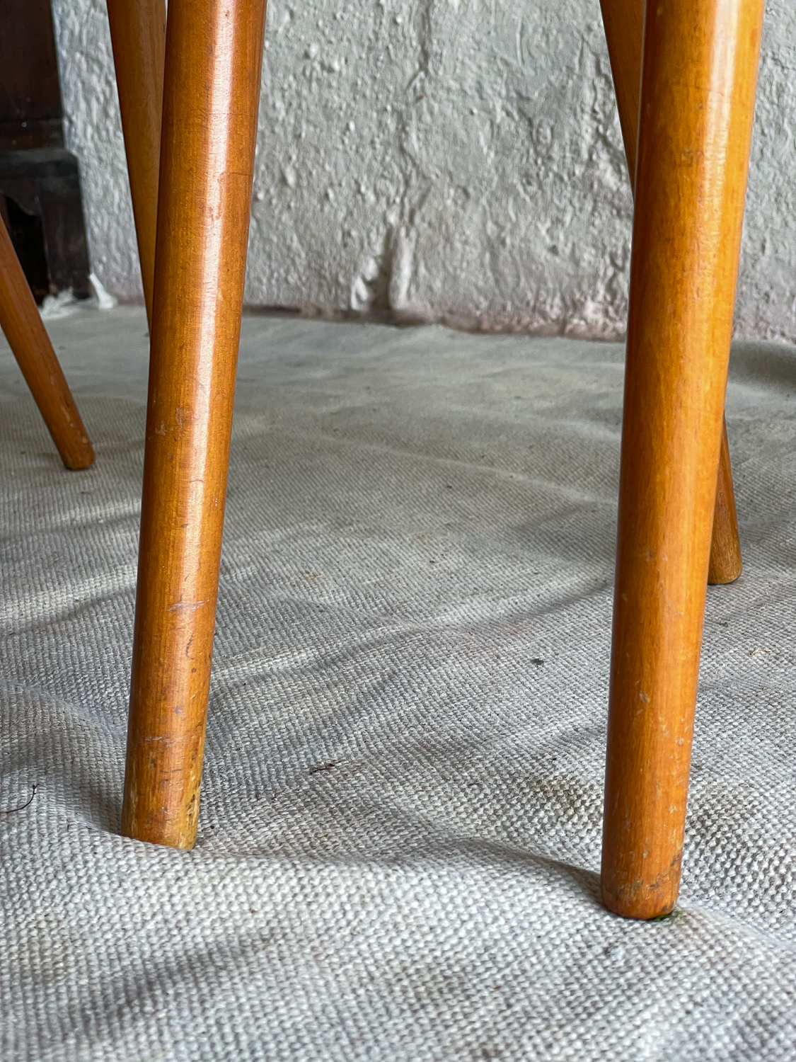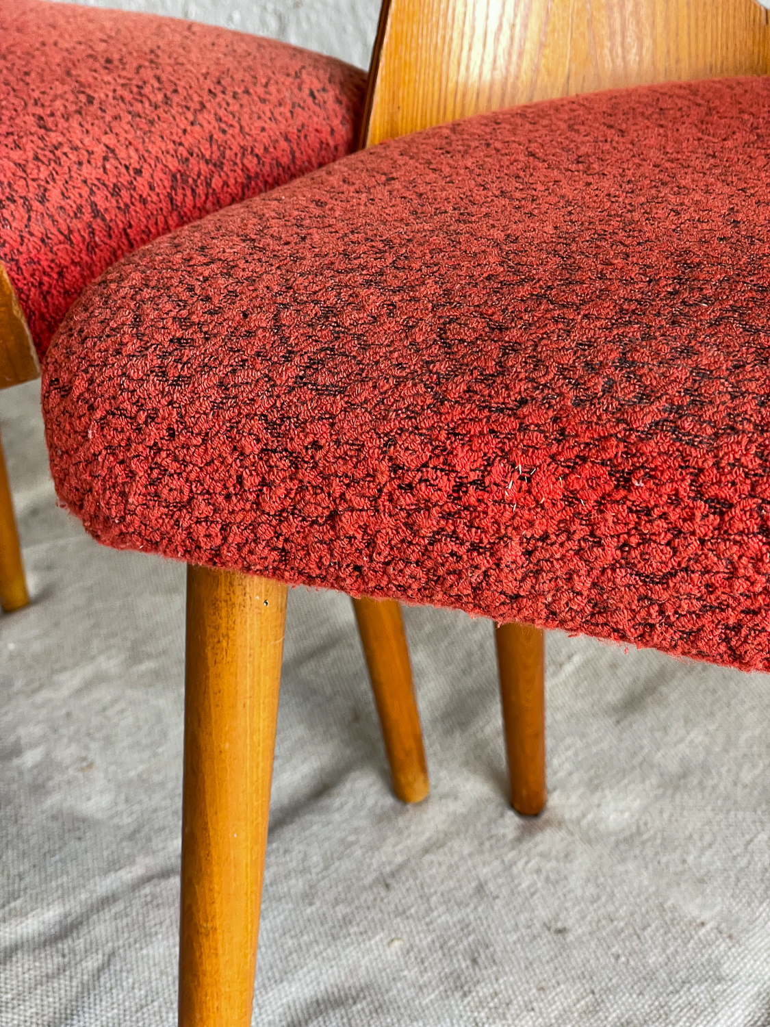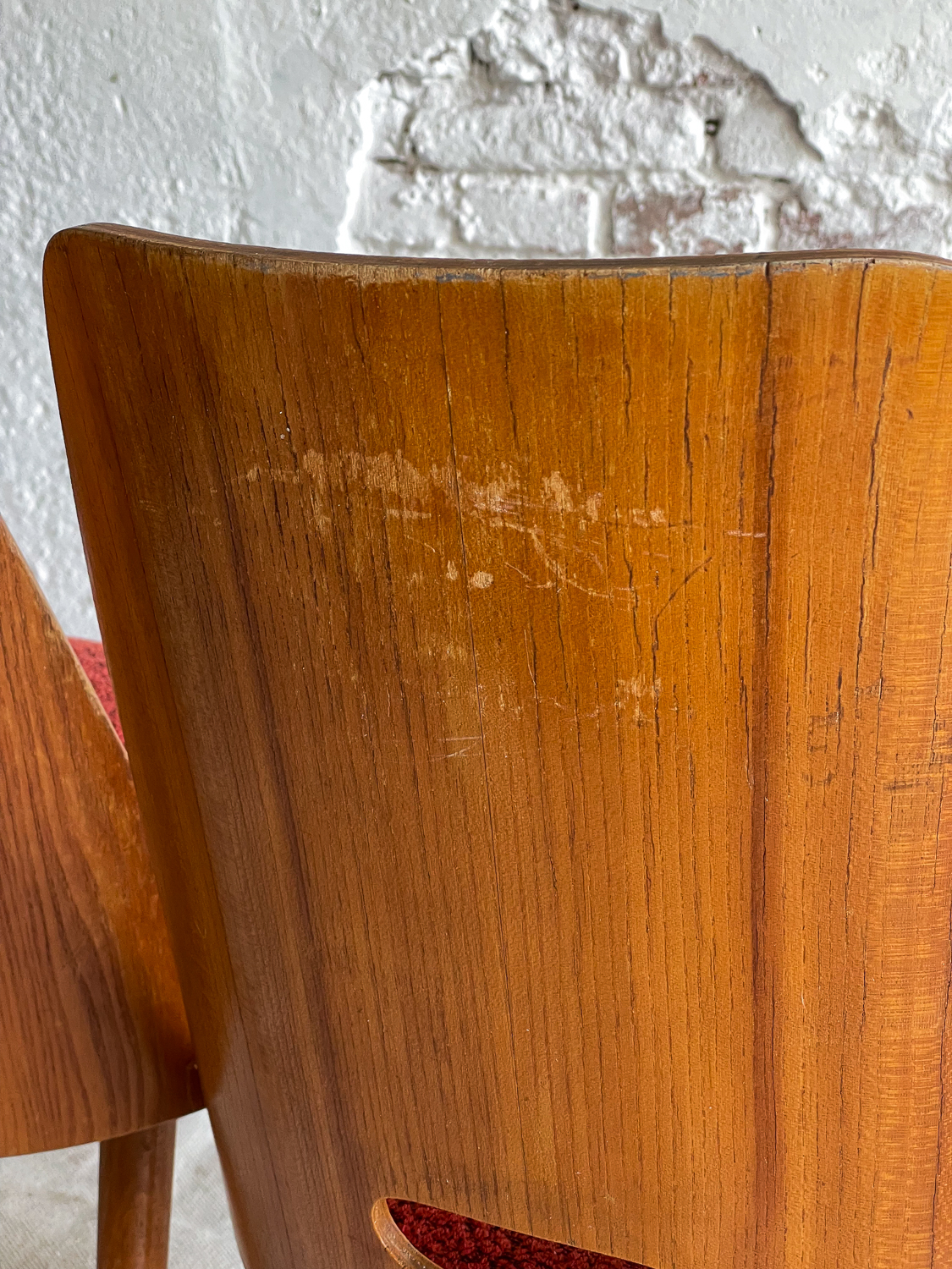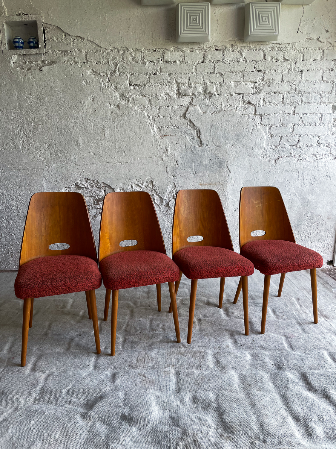 Set oblíbených židlí s „dírou“ , které jsou vyrobeny z ohýbané dýhované překližky. Židlí v tomto stylu se vyrábělo velké množství a liší se především tvarem a velikostí otovru