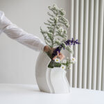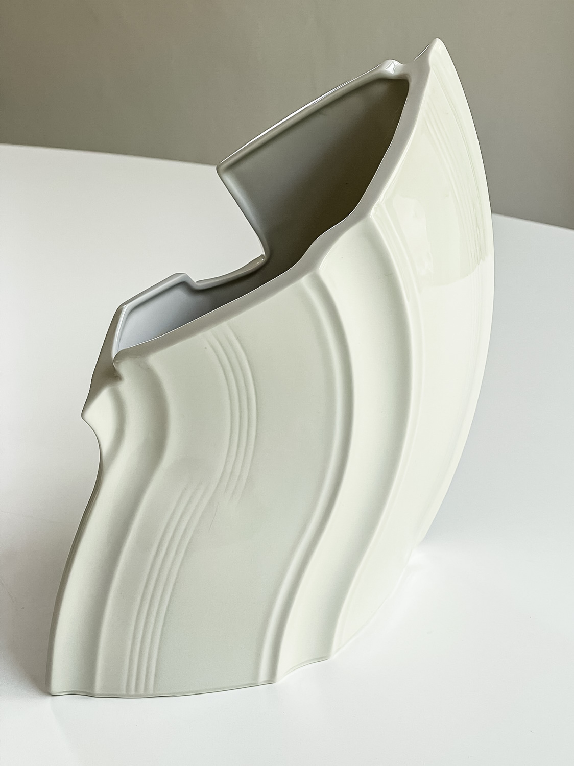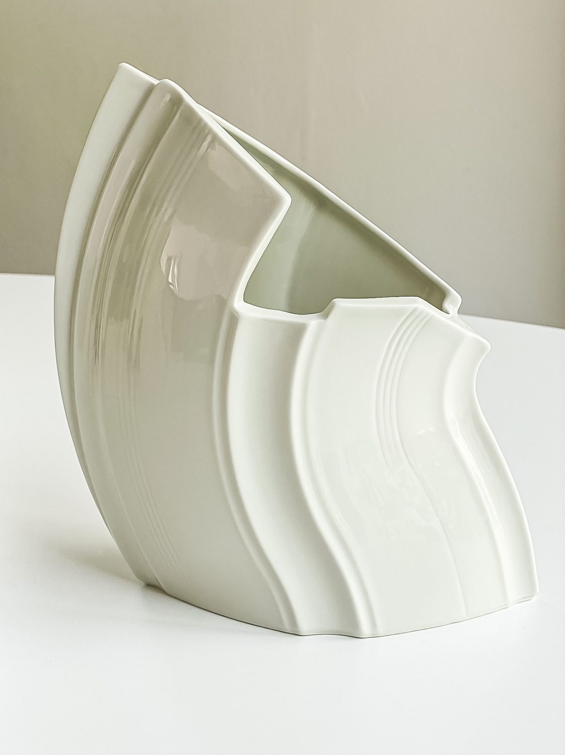 Zajímavě tvarovaná váza od prof. ak. soch. Václav Šeráka. Jeho produkty mají dynamický tvar a velkorysé proporce, což je vidět i na této váze.