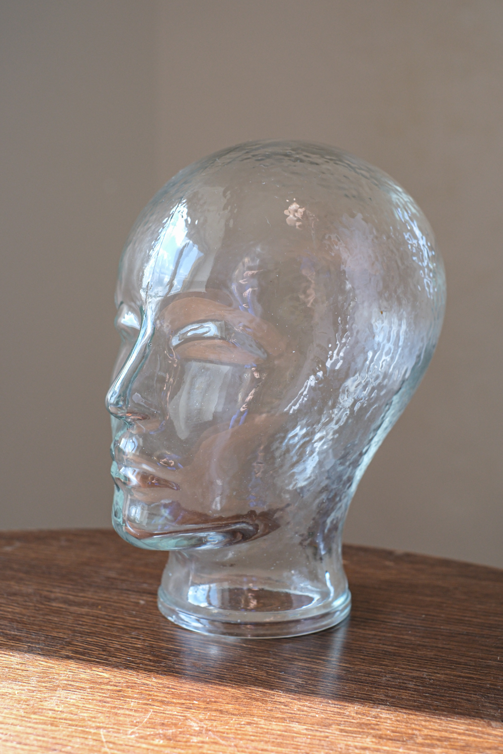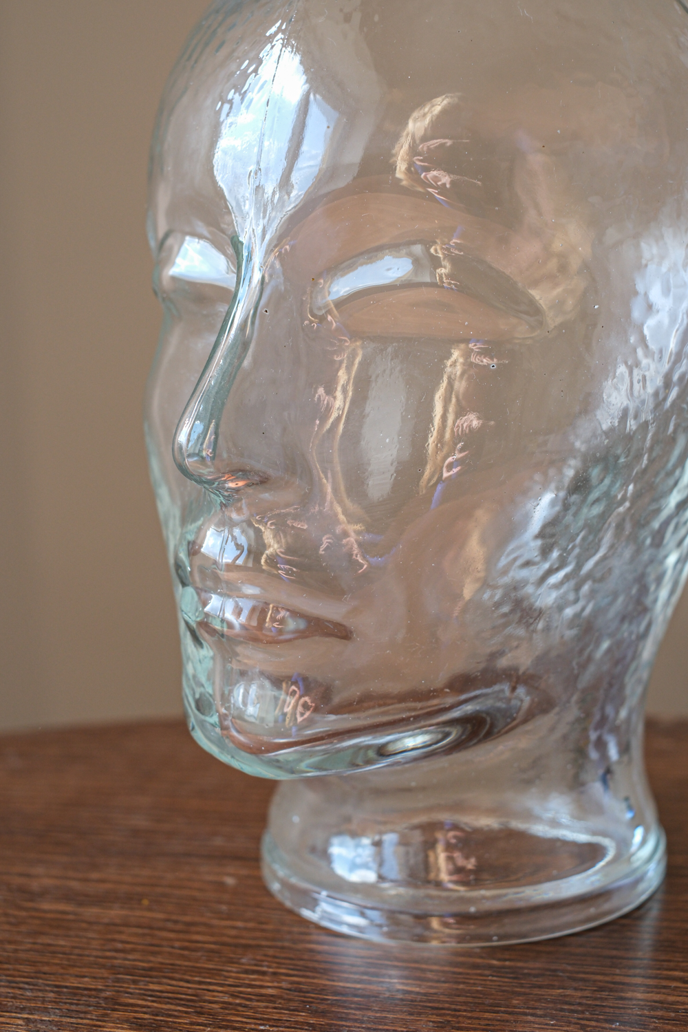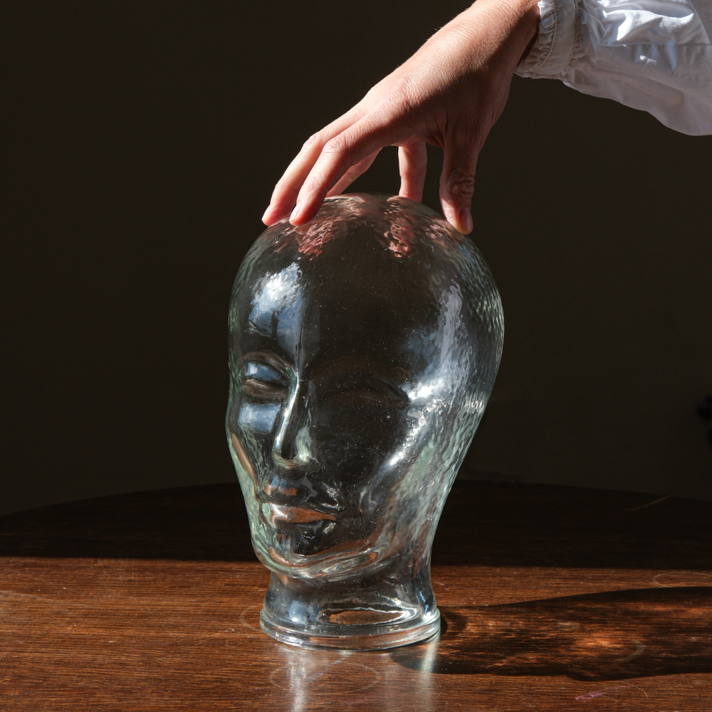 Skleněná hlava lze použít volně jako dekorace nebo ji prakticky využít na odložení klobouku či sluchátek.