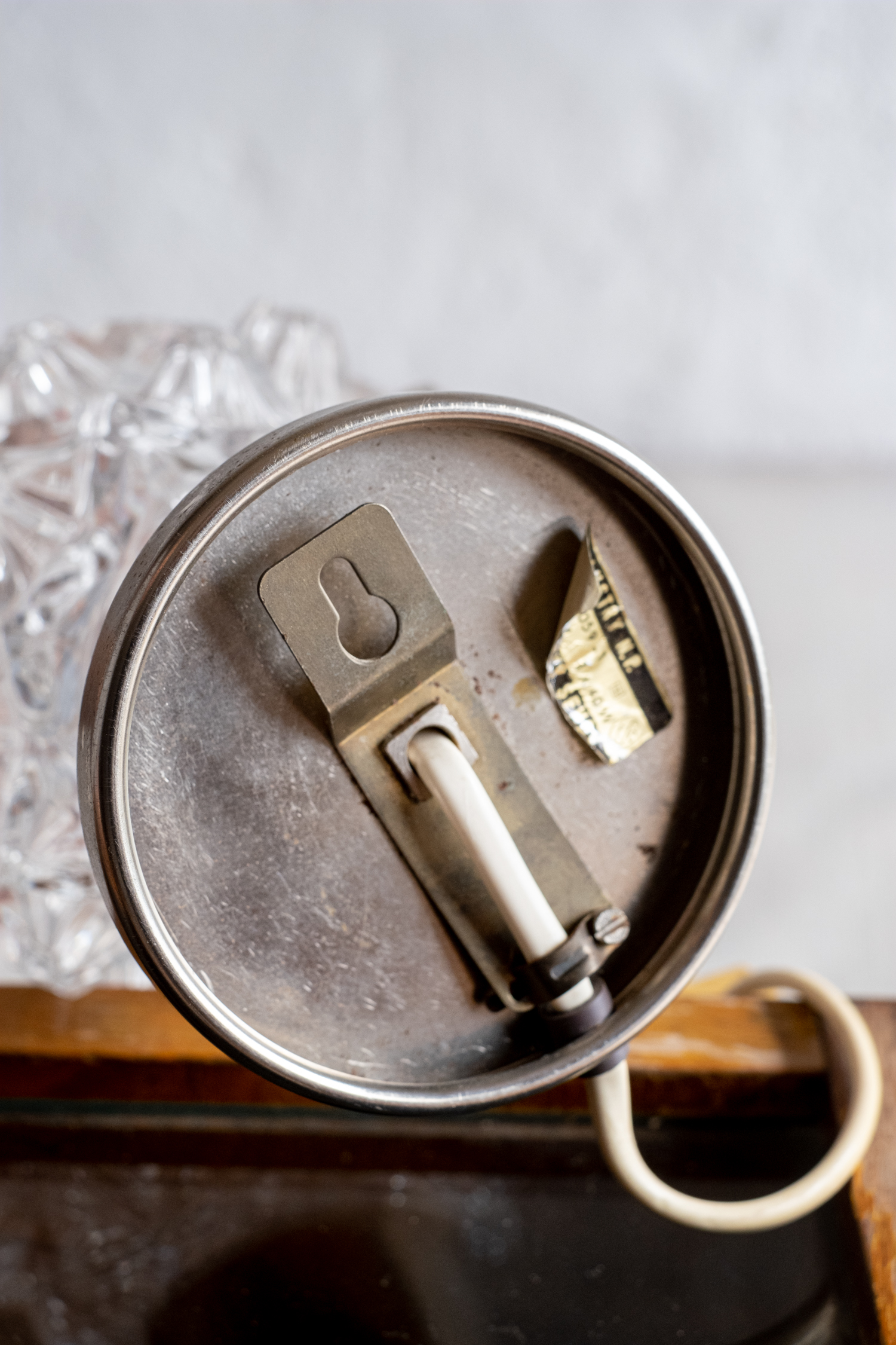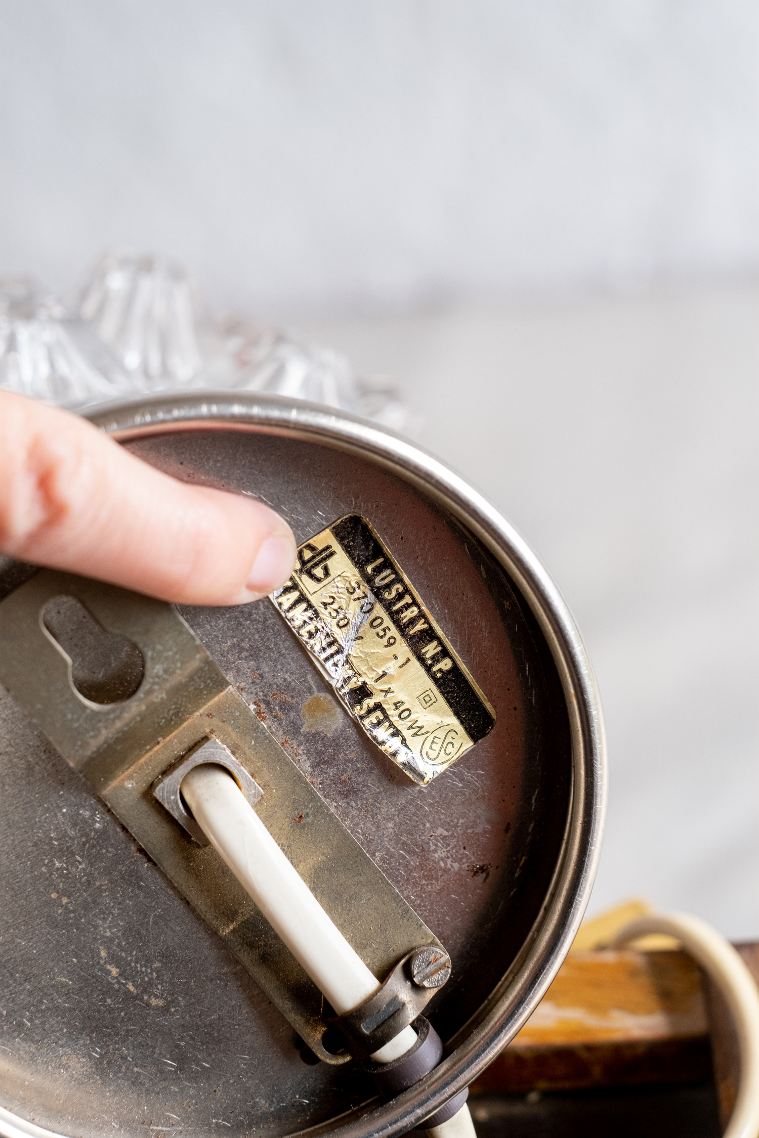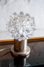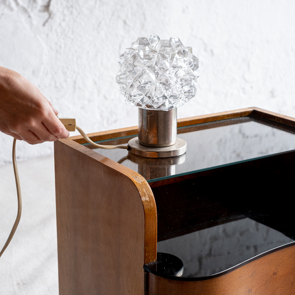 Stolní lampička přezdívaná vzhledem k tvaru křišťálového stínidla „ježek“. Lampička se dá díky oku vespod stojanu připevnit i na zeď. Vyrobena v Kamenickém Šenově v období 60.-70. let minulého století. 370059-1, 250 V, 40 W