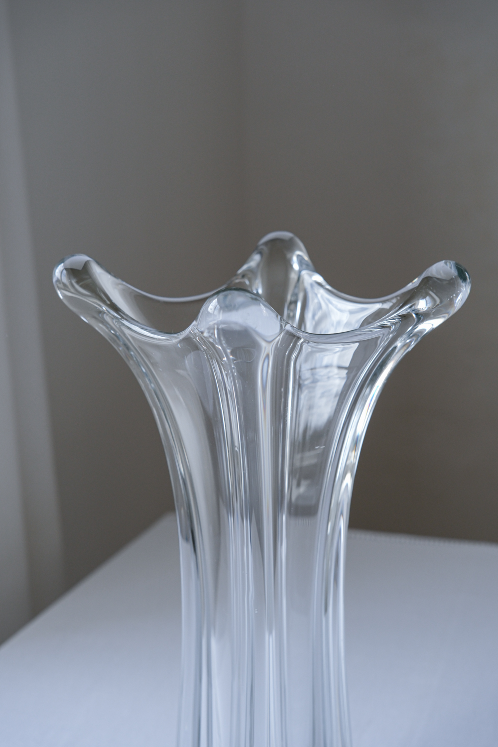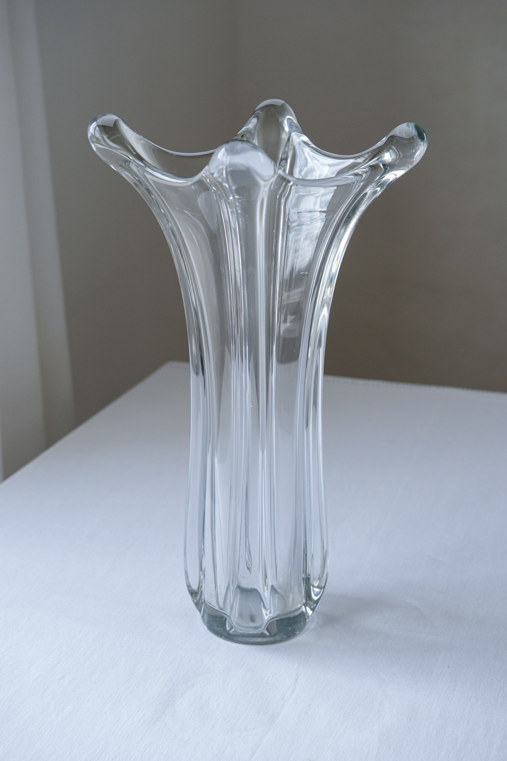 Váza z hutního čirého skla s výrazně tvarovaným, rozevřeným hrdlem. Organická silueta s měkce modelovanými okraji působí živě a dobře pracuje se světlem i odlesky.