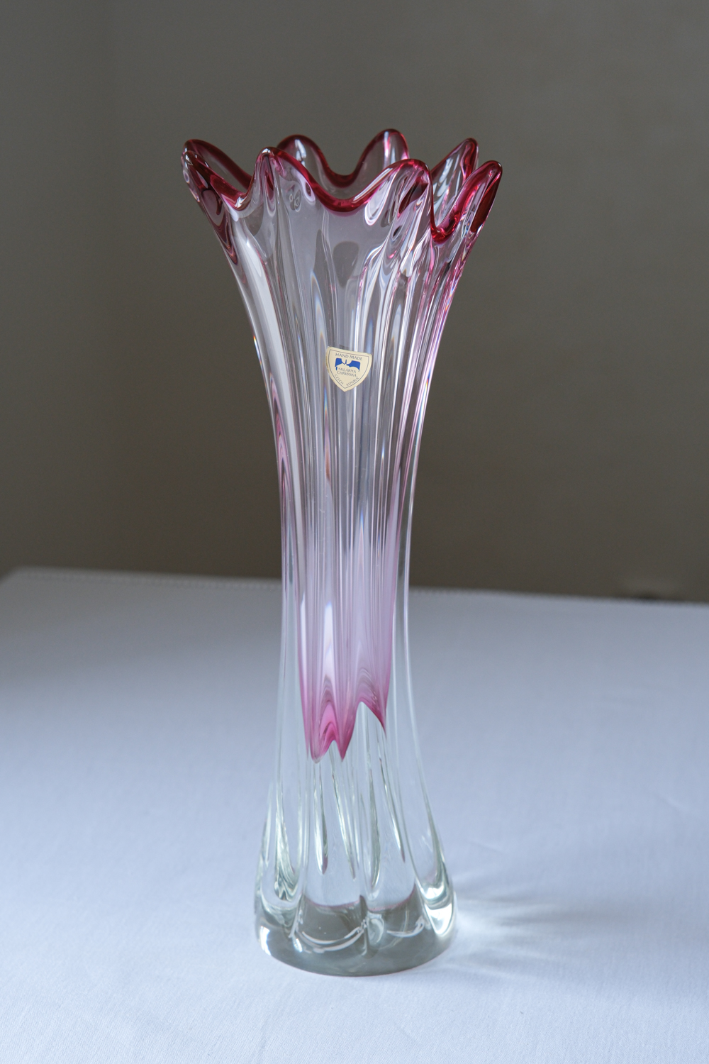Čiré sklo je doplněno jemným růžovo až vínově fialovým zabarvením, které je zintenzivněno v horní části. Při dopadu světla dodává váze hloubku. Plastické tvarování navíc vytváří výraznou hru odlesků a světla.