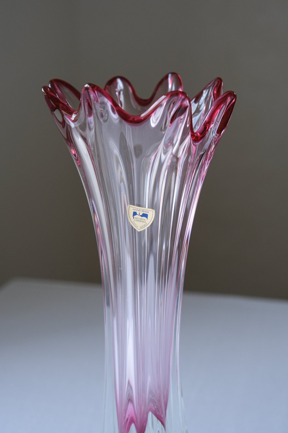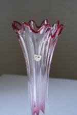 Skleněná váza z produkce sklárny Chřibská s dynamicky se rozšiřující siluetou zakončenou zvlněným okrajem. Typický příklad práce s hutním sklem, kde tvar i barevnost vznikají přímo při formování materiálu.