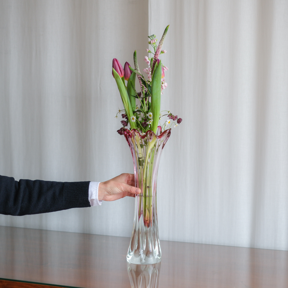 Váza je vhodná spíše pro vyšší, subtilnější aranžmá. Zároveň jde o kus, který ocení i sběratelé hutního skla, kde právě kombinace tvaru, techniky a barevnosti hraje zásadní roli.