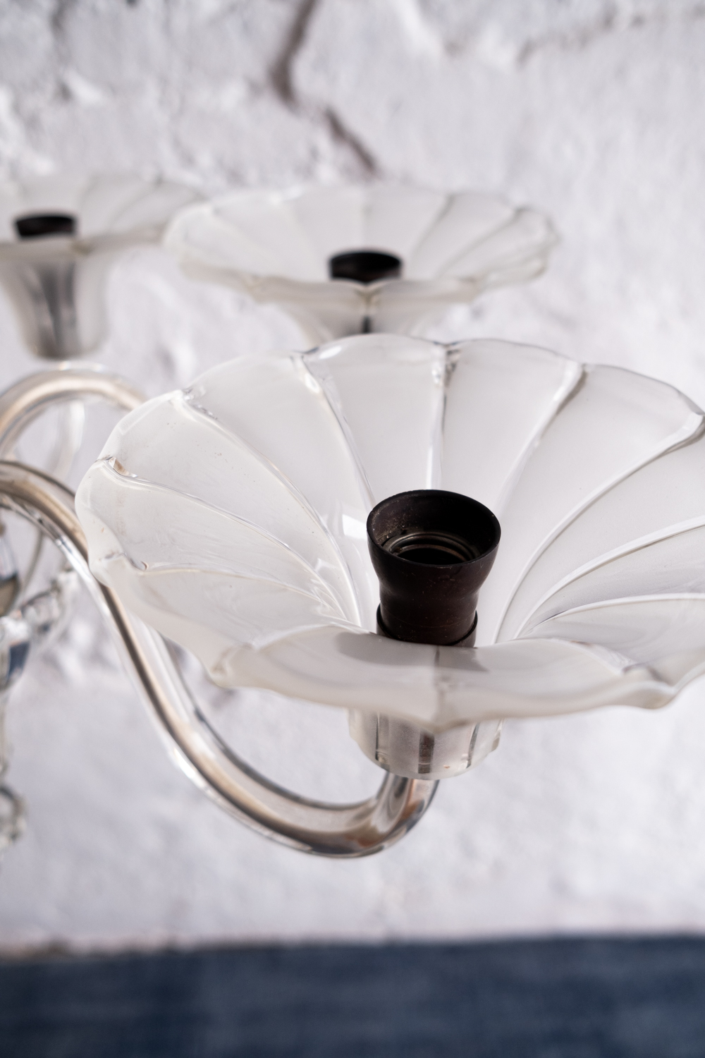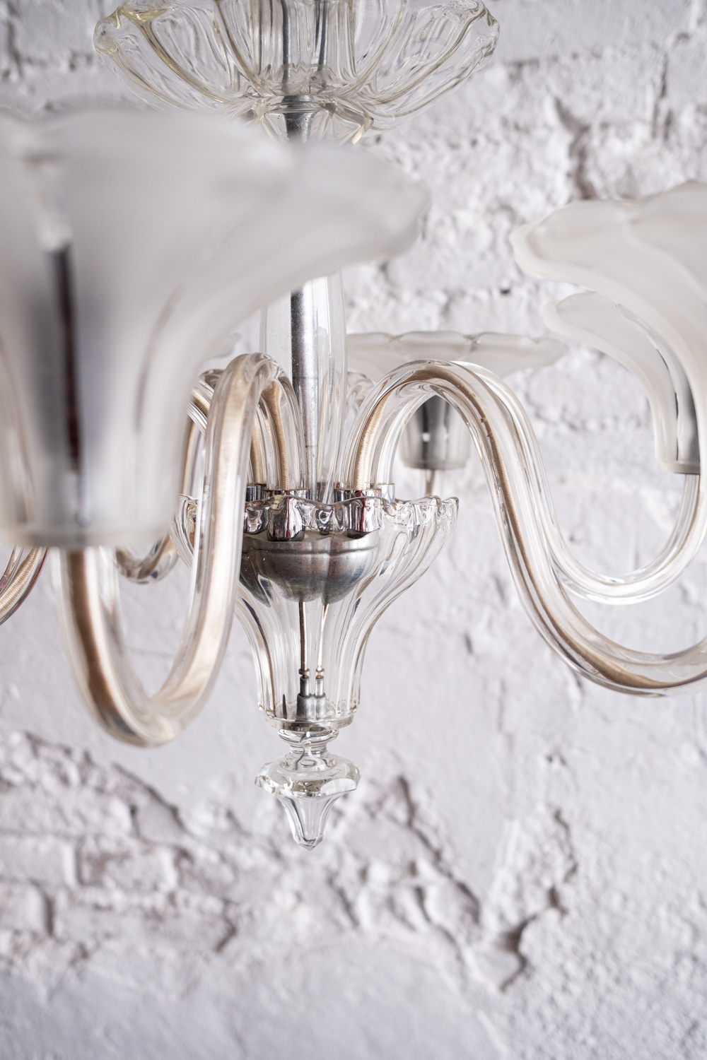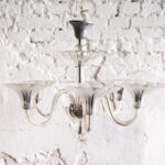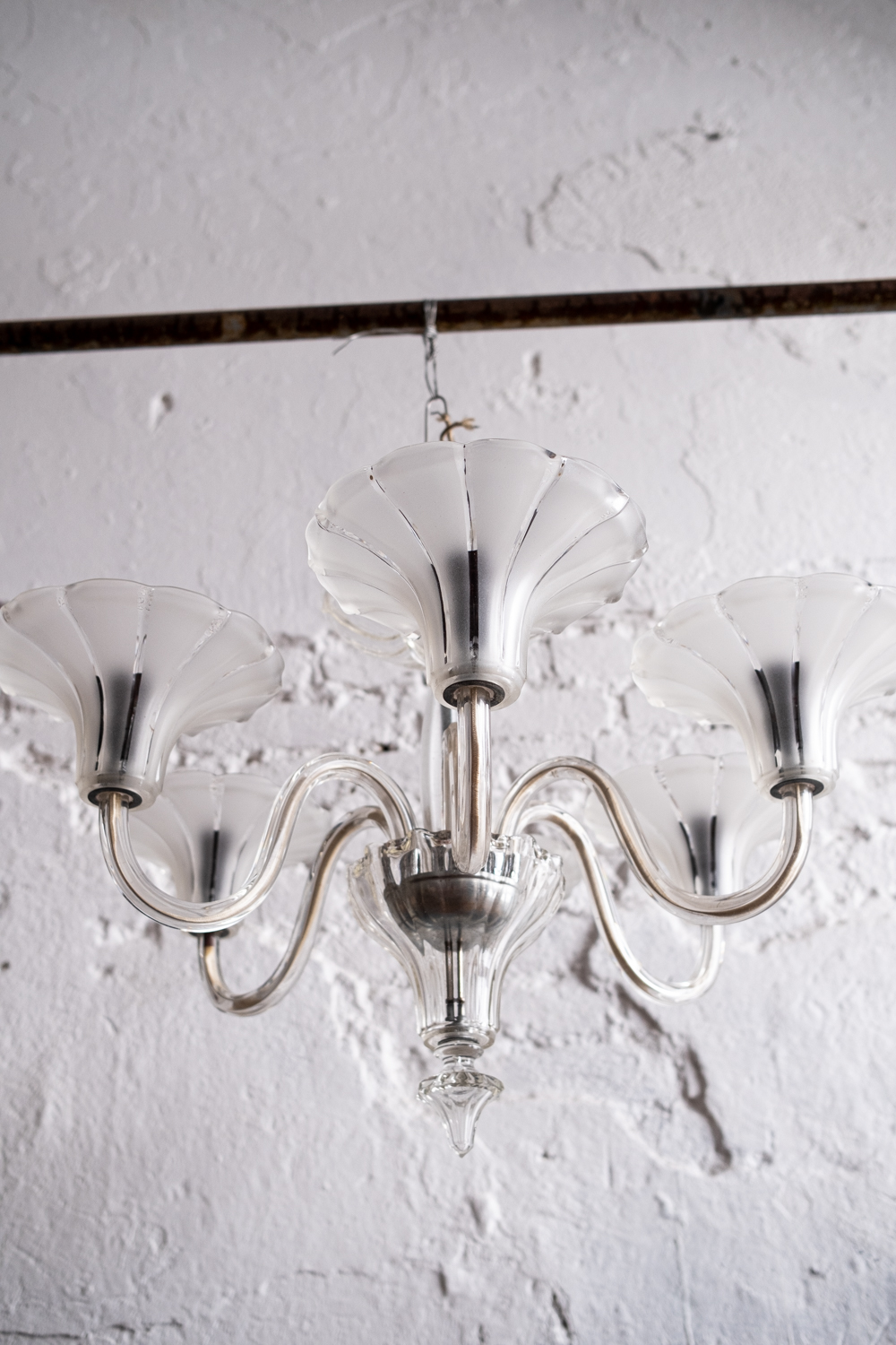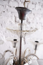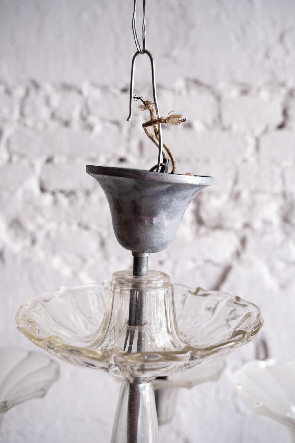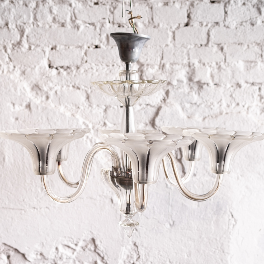 Šestiramenný celoskleněný lustr v kombinaci čirého a pískovaného skla. Šest esovitě tvarovaných ramen, nesoucích stínidla (misky) ve tvaru květu lilií. Československo 1920 – 1940. 6 x 40 W, 250 V