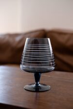 Tenká sklenička na koňak v neobvyklé šedo-midré barvě ze zaniklé sklárny v severních Čechach.