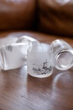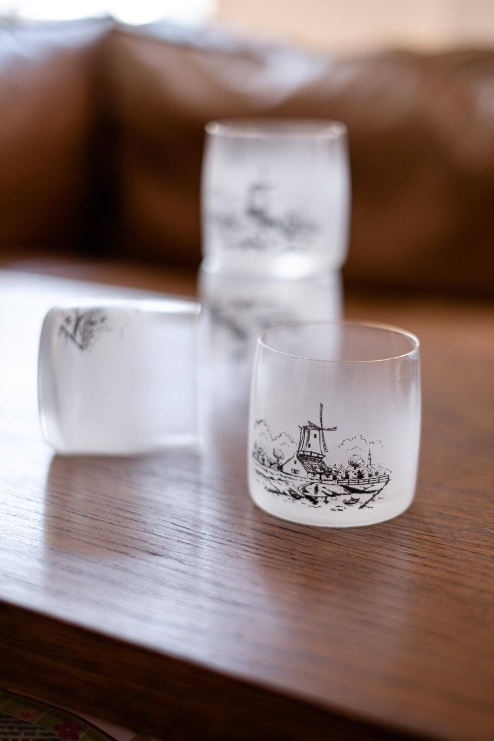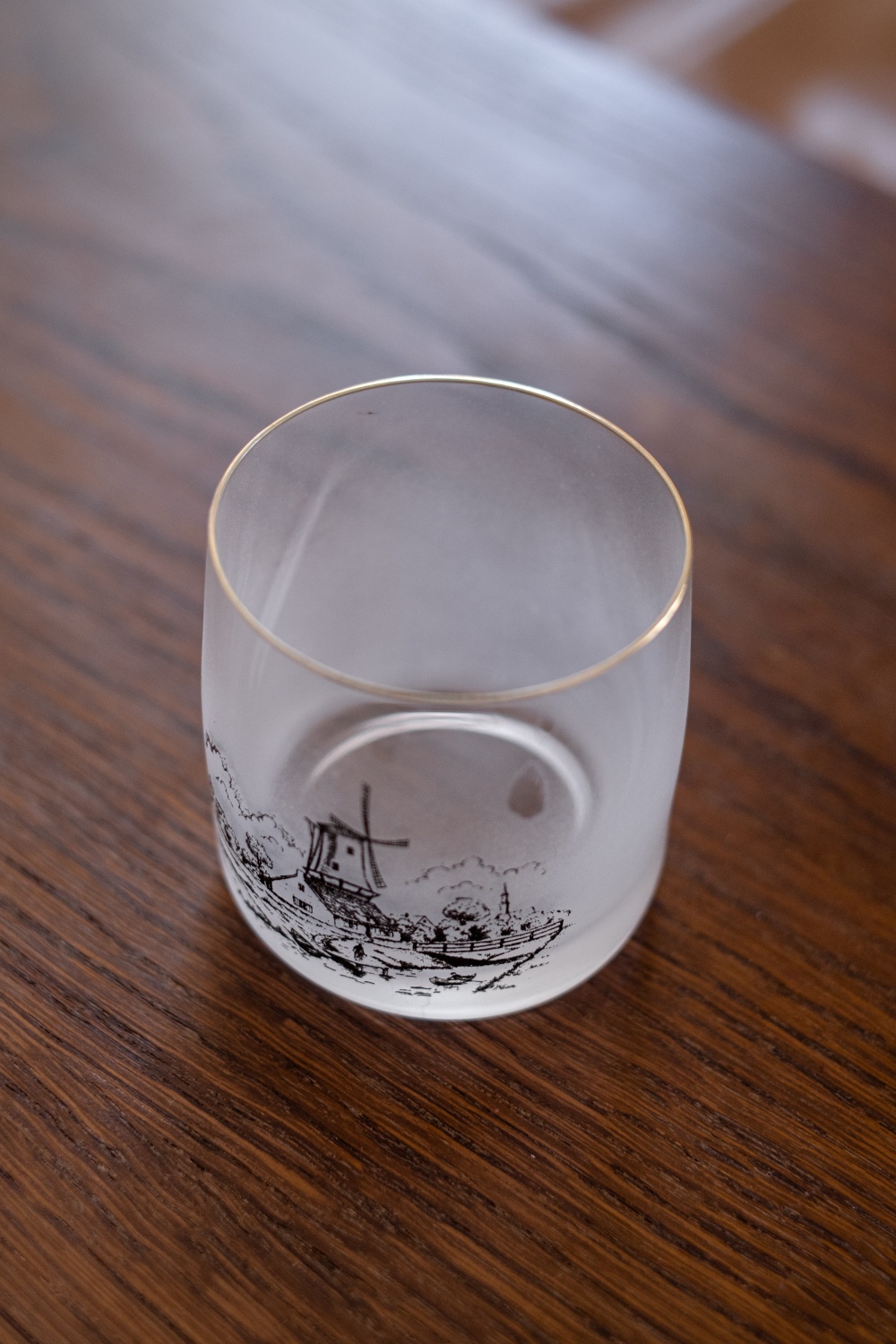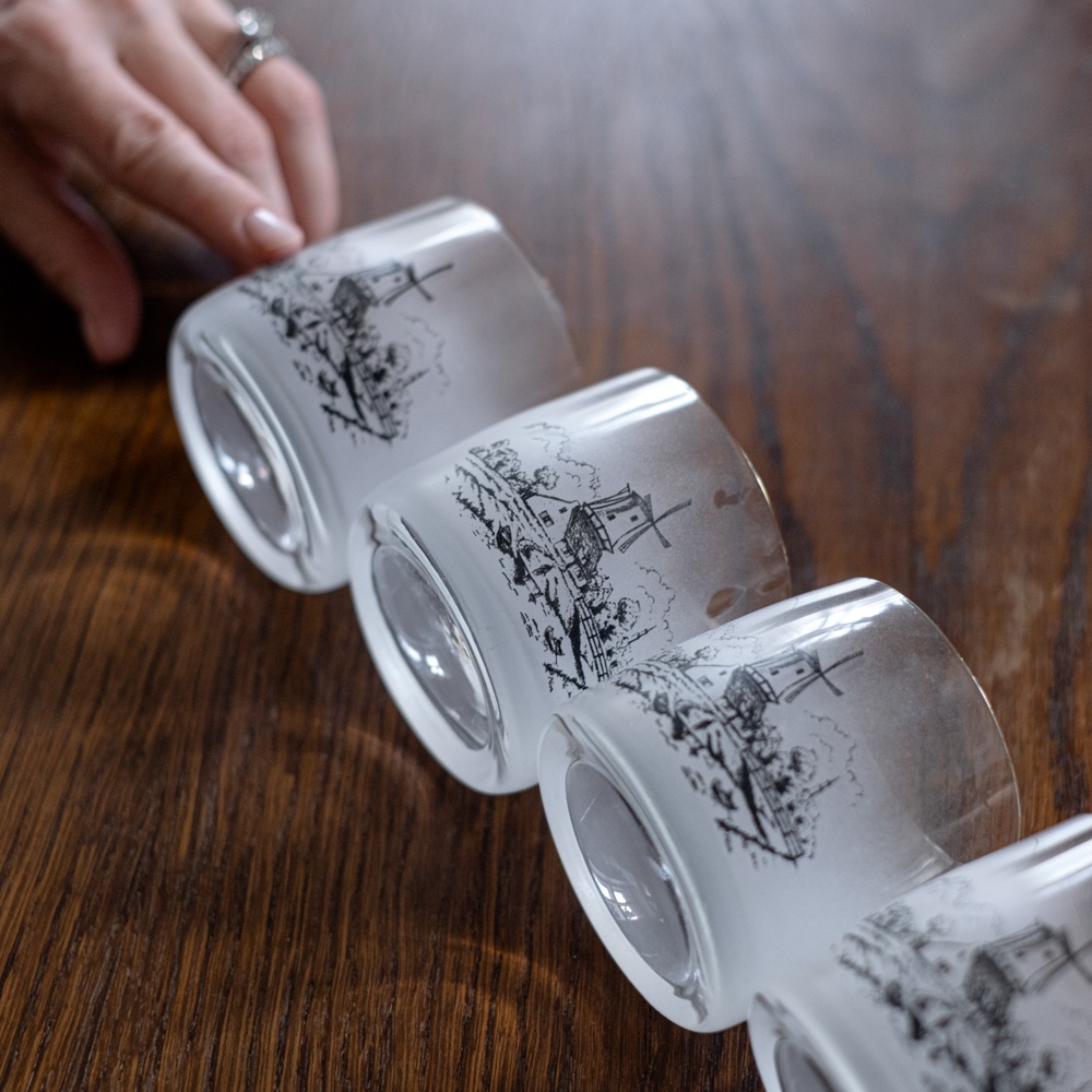 Skleničky na whisky s dekorem holandského venkova. Přibližná datace 70.-80. léta minulého století.