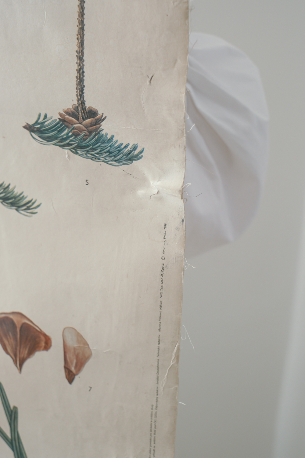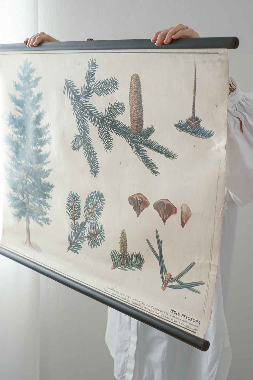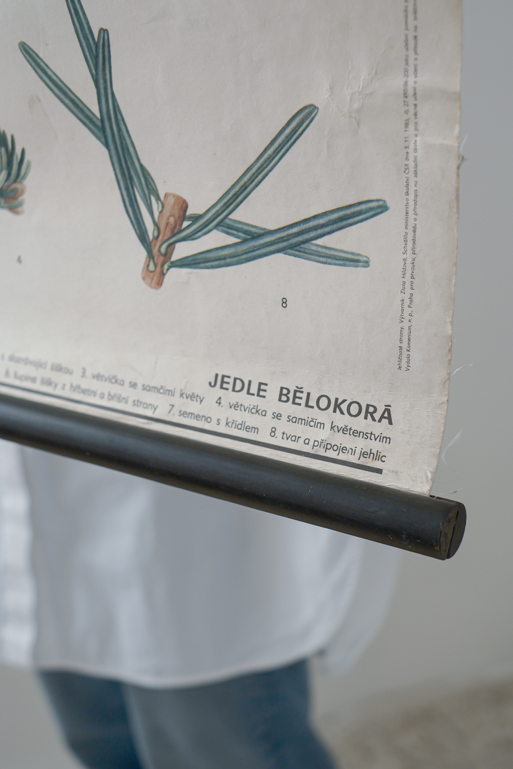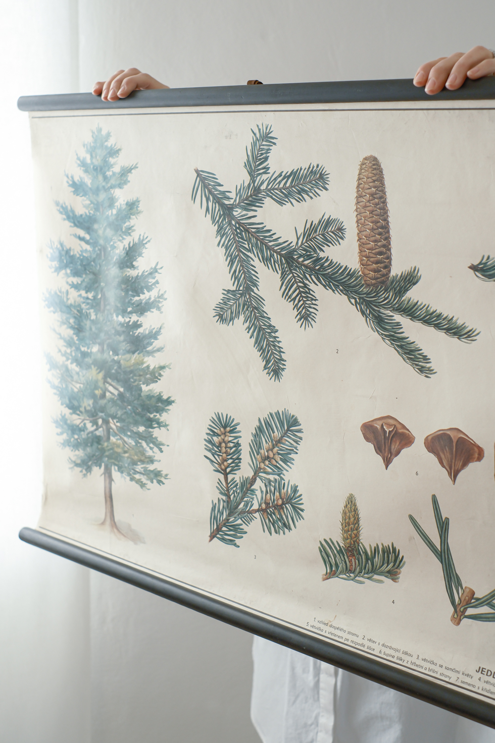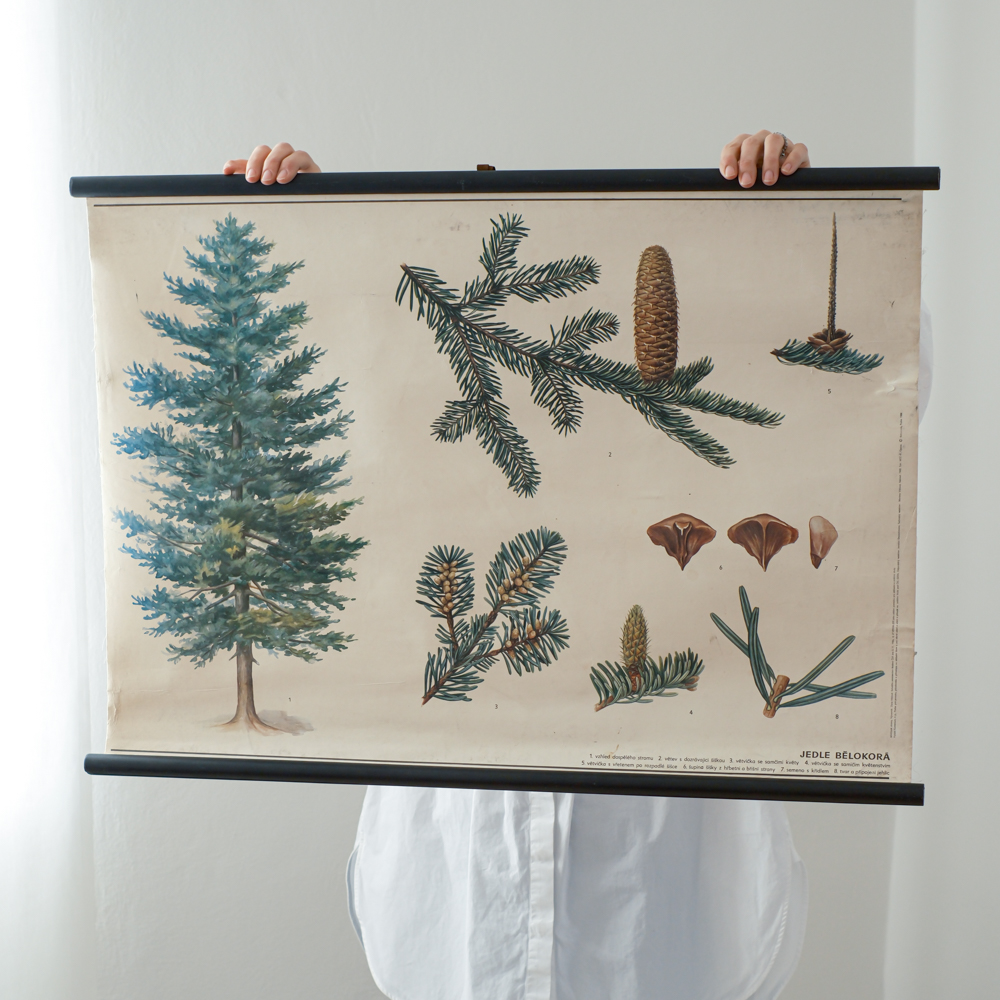Školní plakát ze série jehličnaté stromy – jedle bělokorá, výtvarník Zlata Hildová z roku 1985. Tkaloun na zavěšení.