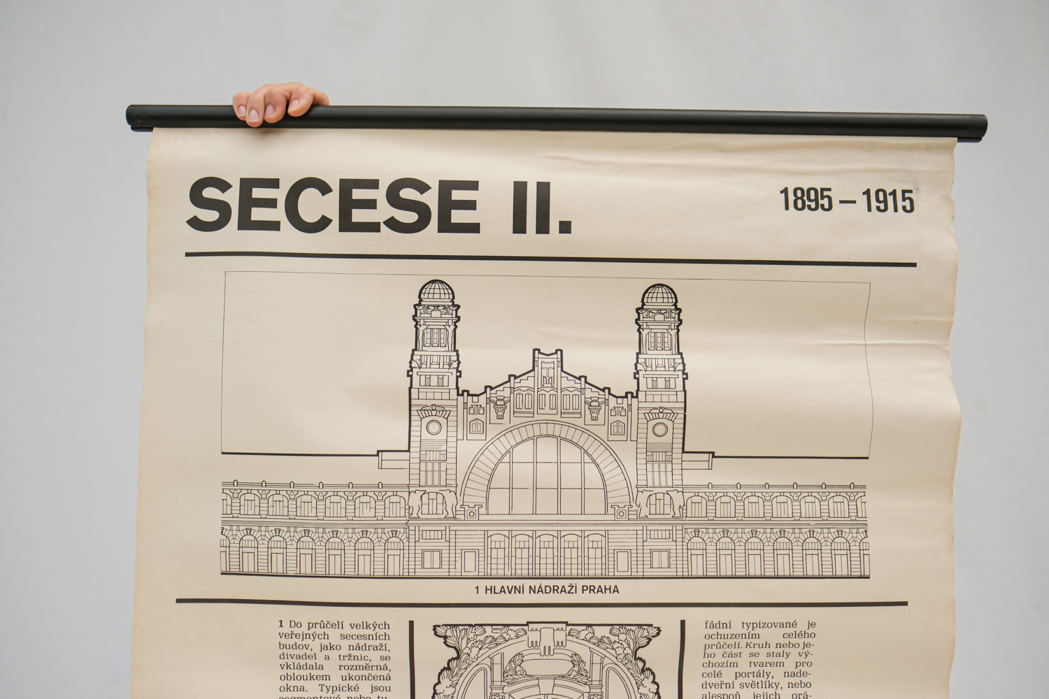 Školní plakát secese II – Hlavní nádraží. Ze zadní strany plakátu naleznete i podrobný popis tohoto slohu, navazuje na popis z plakátu secese I.