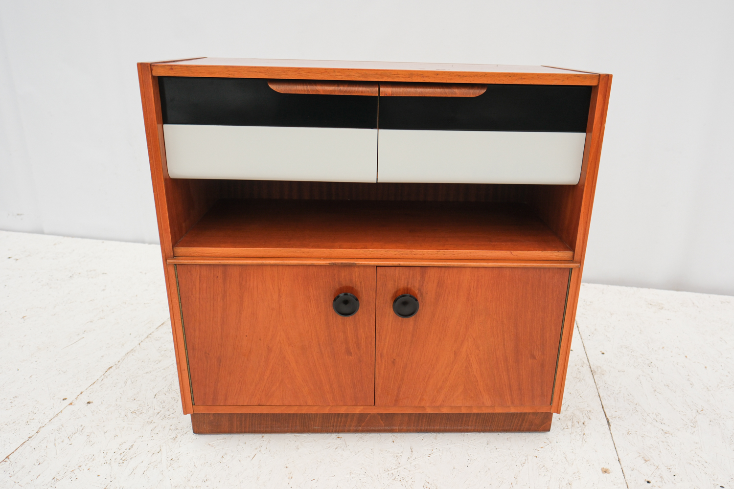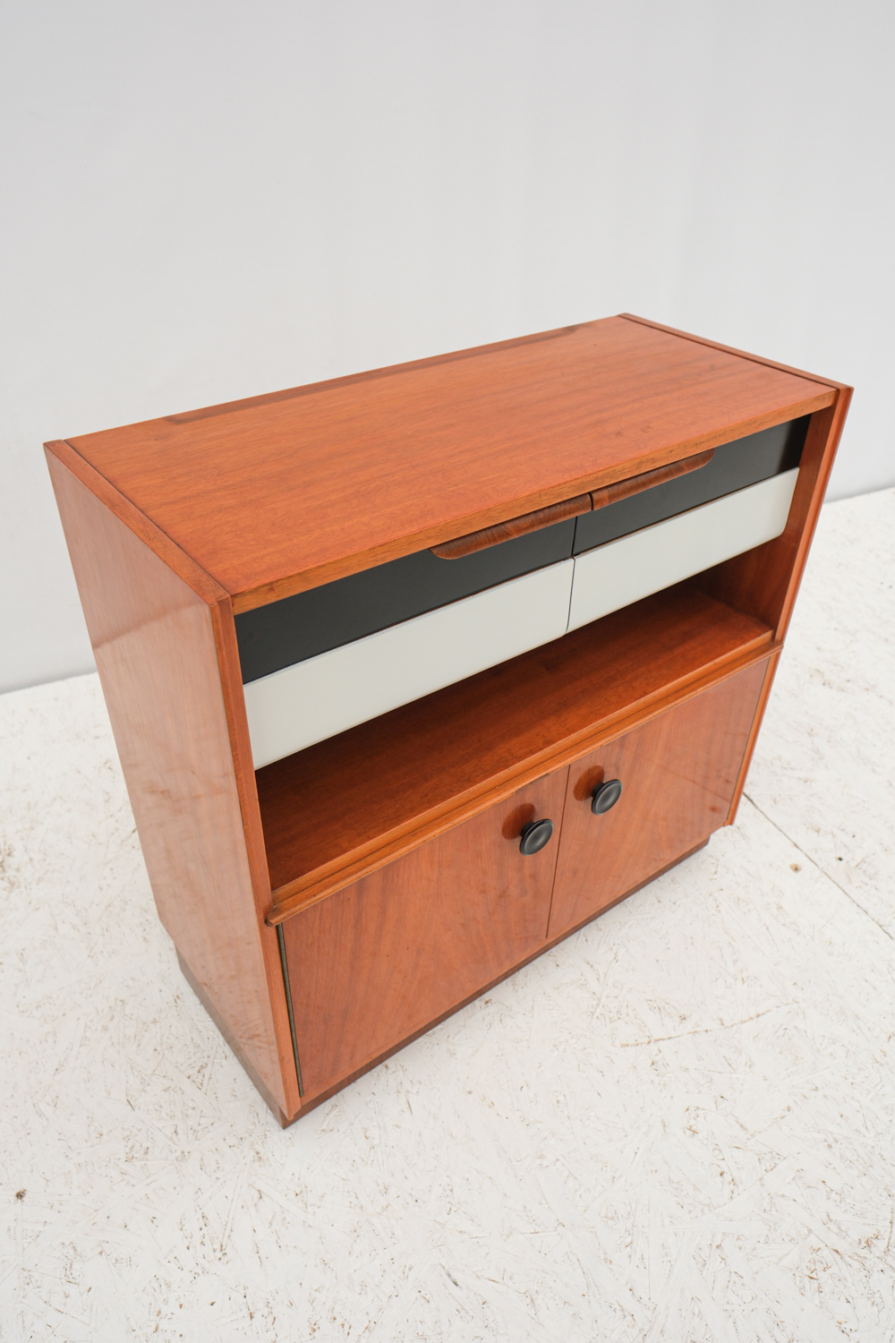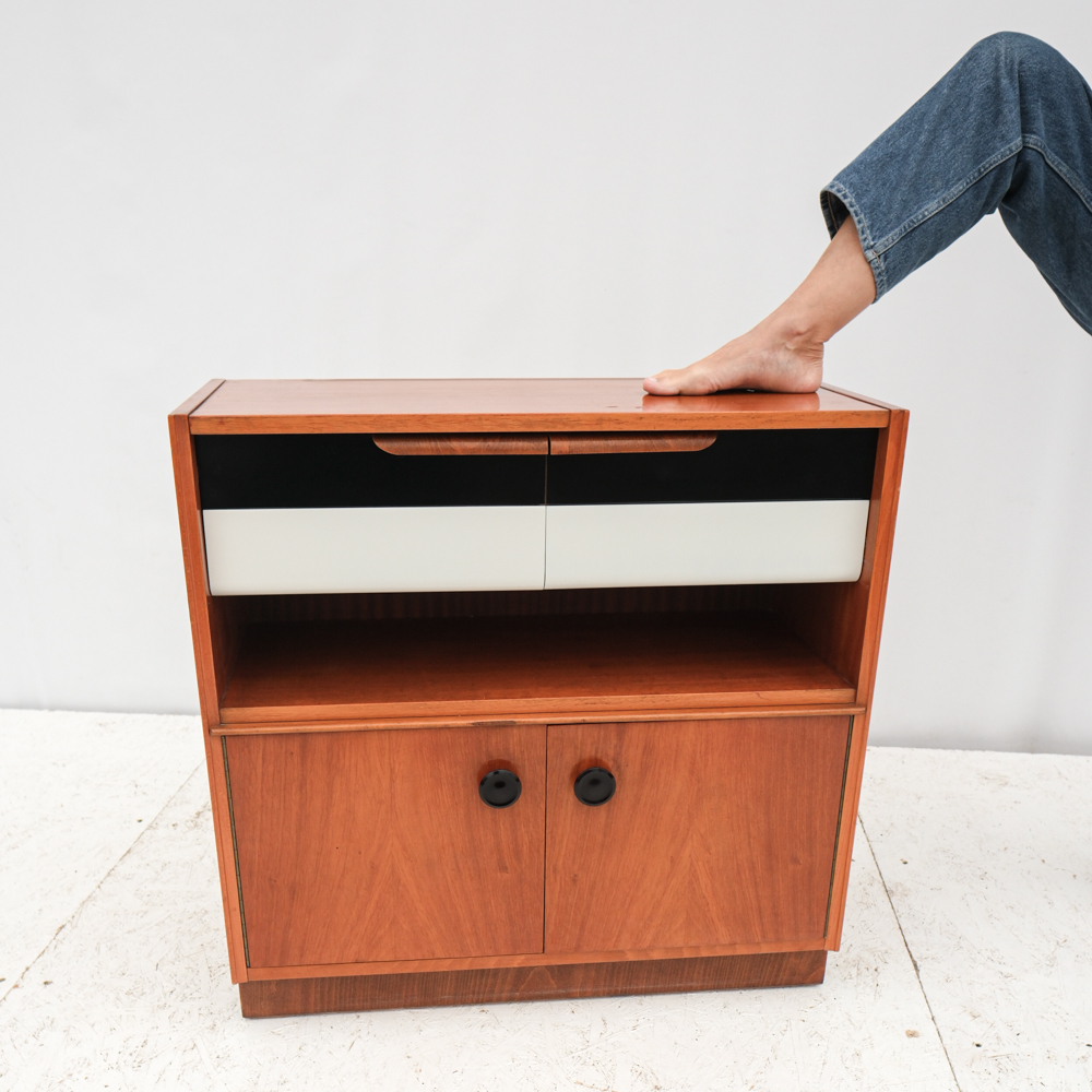 Praktická skříňka se zajímavým detailem černo-bílých šuplíků s elegantním úchytem. K dispozici ještě skříňka ze stejné série s šoupacími skleněnými dvířky.