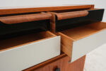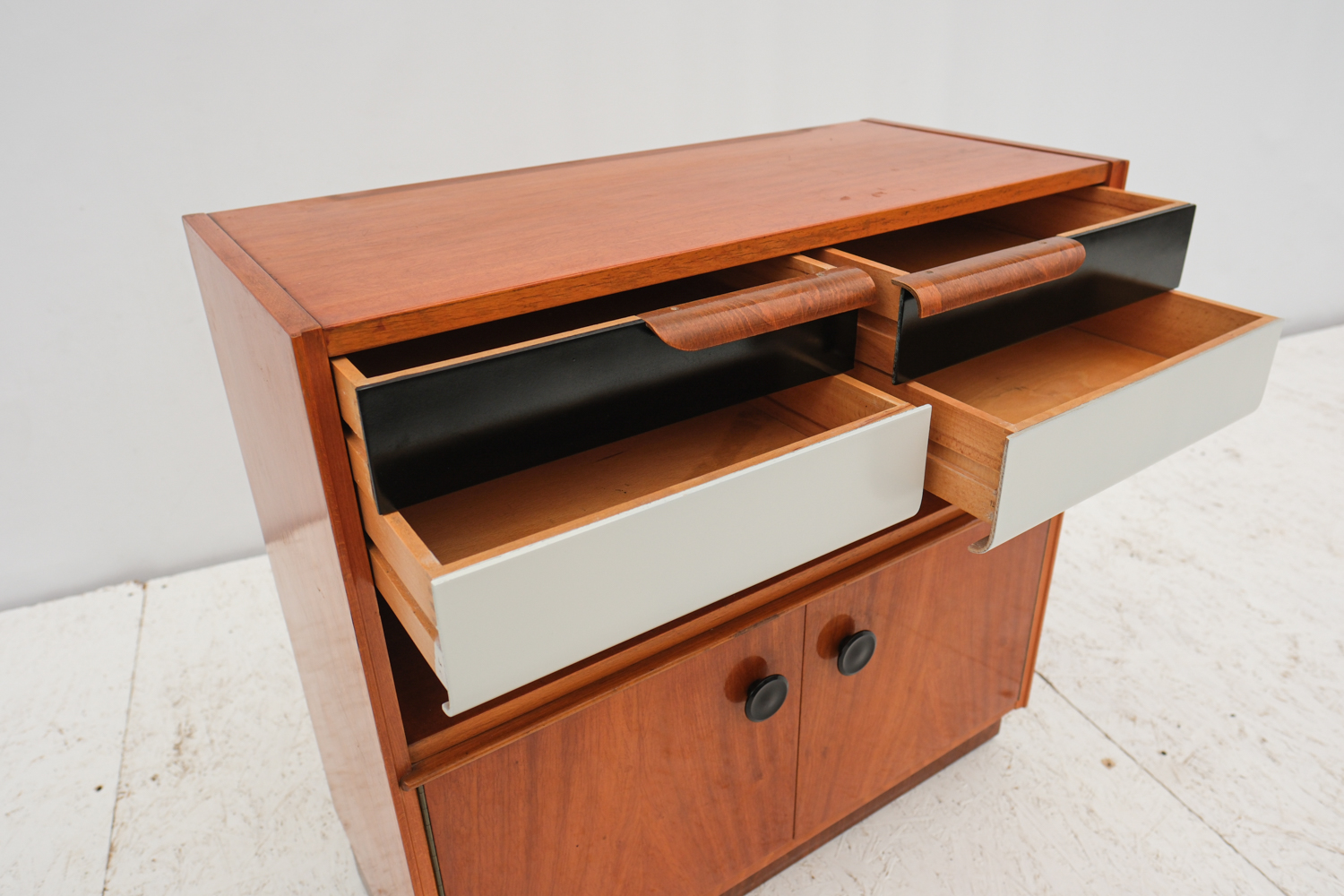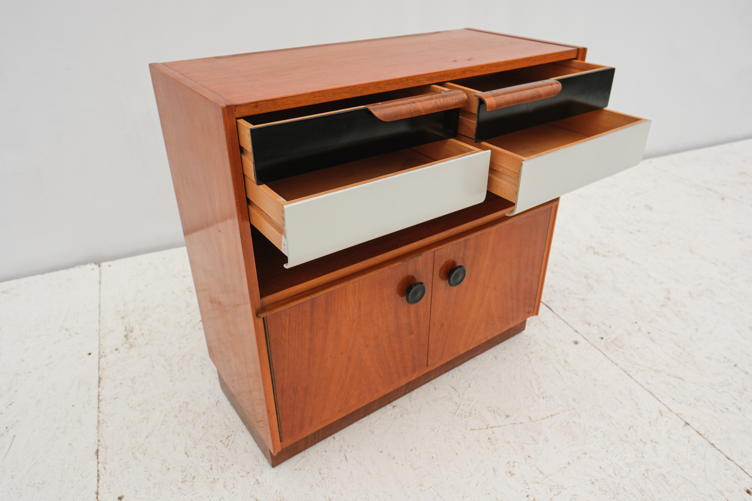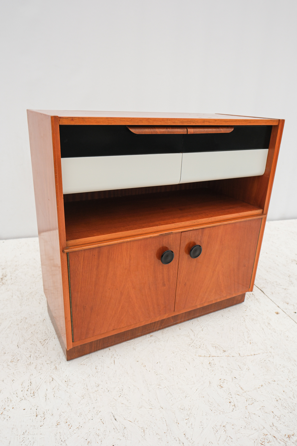 Praktická skříňka se zajímavým detailem černo-bílých šuplíků s elegantním úchytem. K dispozici ještě skříňka ze stejné série s šoupacími skleněnými dvířky.