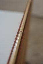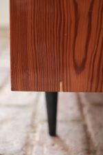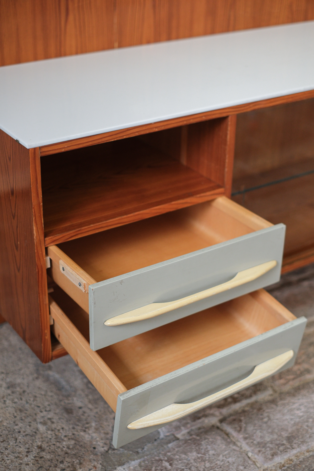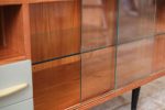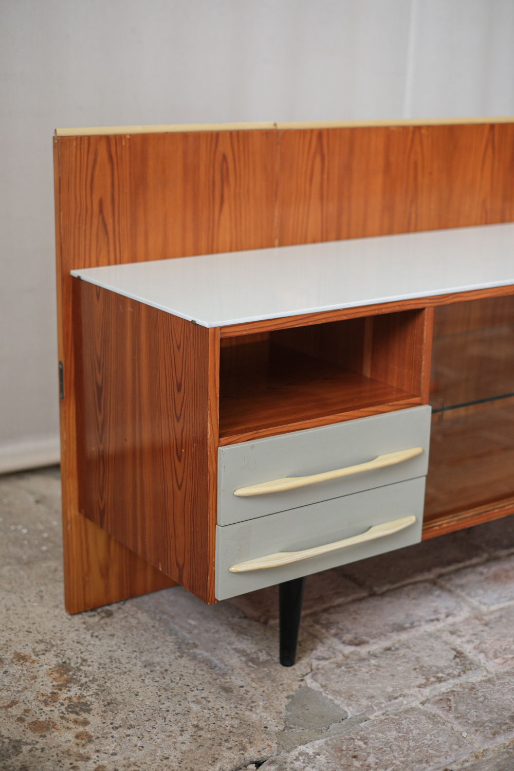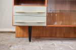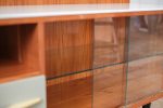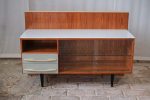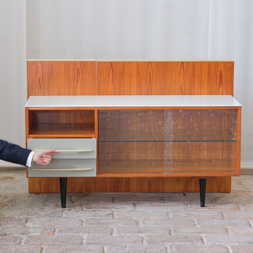 Elegantní nízká skříňka z návrhářské dílny Mojmíra Požára pro UP Závody Bučovice z 60. let minulého století. Kombinace materiálů a povrchů — horní deska z bílého opaxitového skla, dýhované tělo s výraznou kresbou dřeva a šedozelené zásuvky s plastickými úchytkami — vytváří harmonický kontrast. Pravá část se skleněnými dvířky a policí odlehčuje celkový dojem a dodává kusu vizuální lehkost. Požárův rukopis je patrný v důrazu na proporce, funkčnost a střídmou eleganci. Skříňka je ideální jako bar, knihovna nebo televizní stolek.