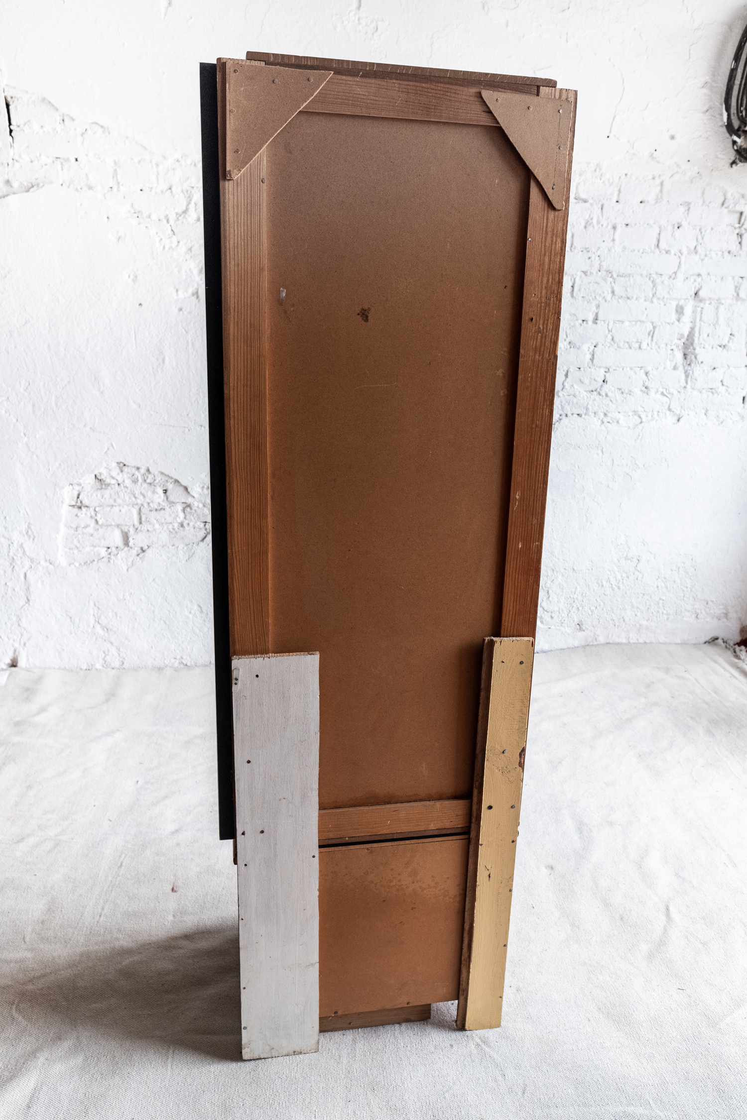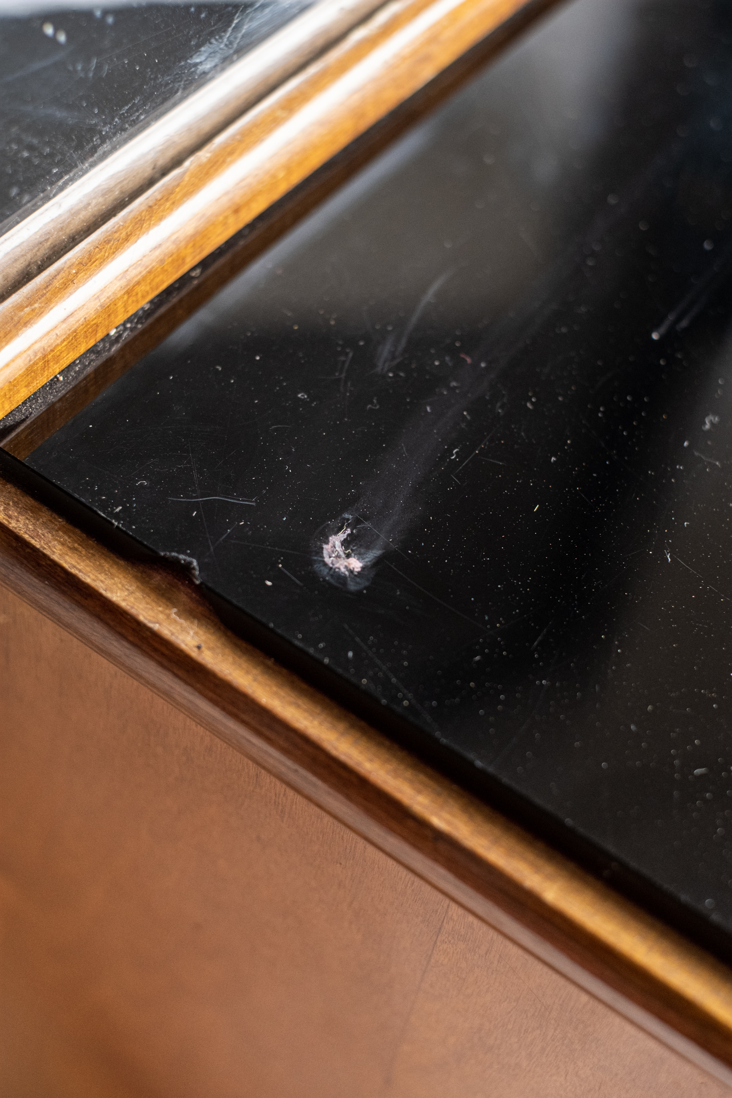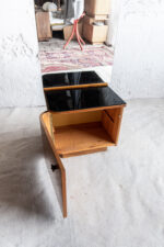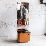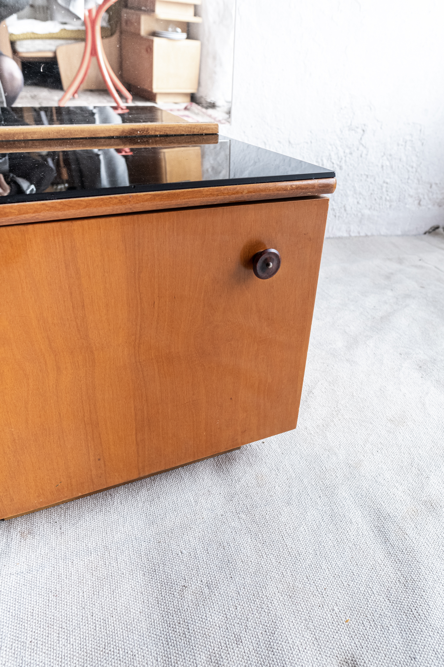 Malá skříňka s černým opaxitovým sklem se zrcadlem pochází z poloviny minulého století. Bude ideální třeba do chodby nebo předsíně. Před odchodem se vzrcadle ještě zkontrolujete a boty přeleštíte kartáčem, který můžete mít uložený uvnitř skříňky. Skříňka se otvírá vlevo.
