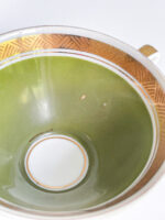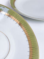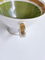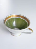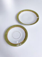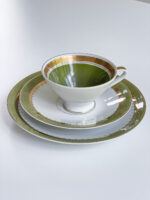Snídaňová sada pravděpodobně z Rakouska z období 60. let minulého století v neobvykle zelené barvě v kombinaci se zlatým geometrickým zdobením.