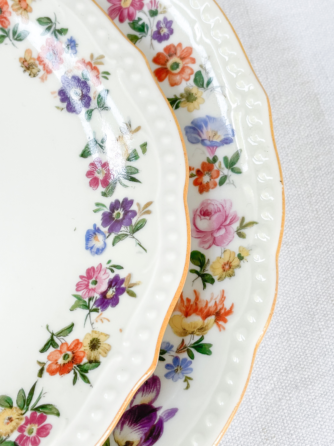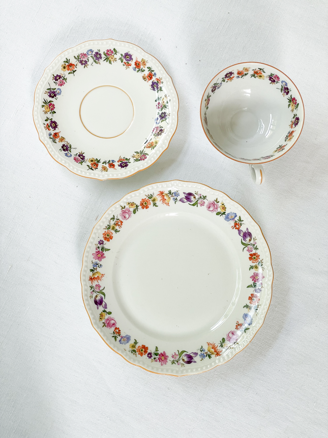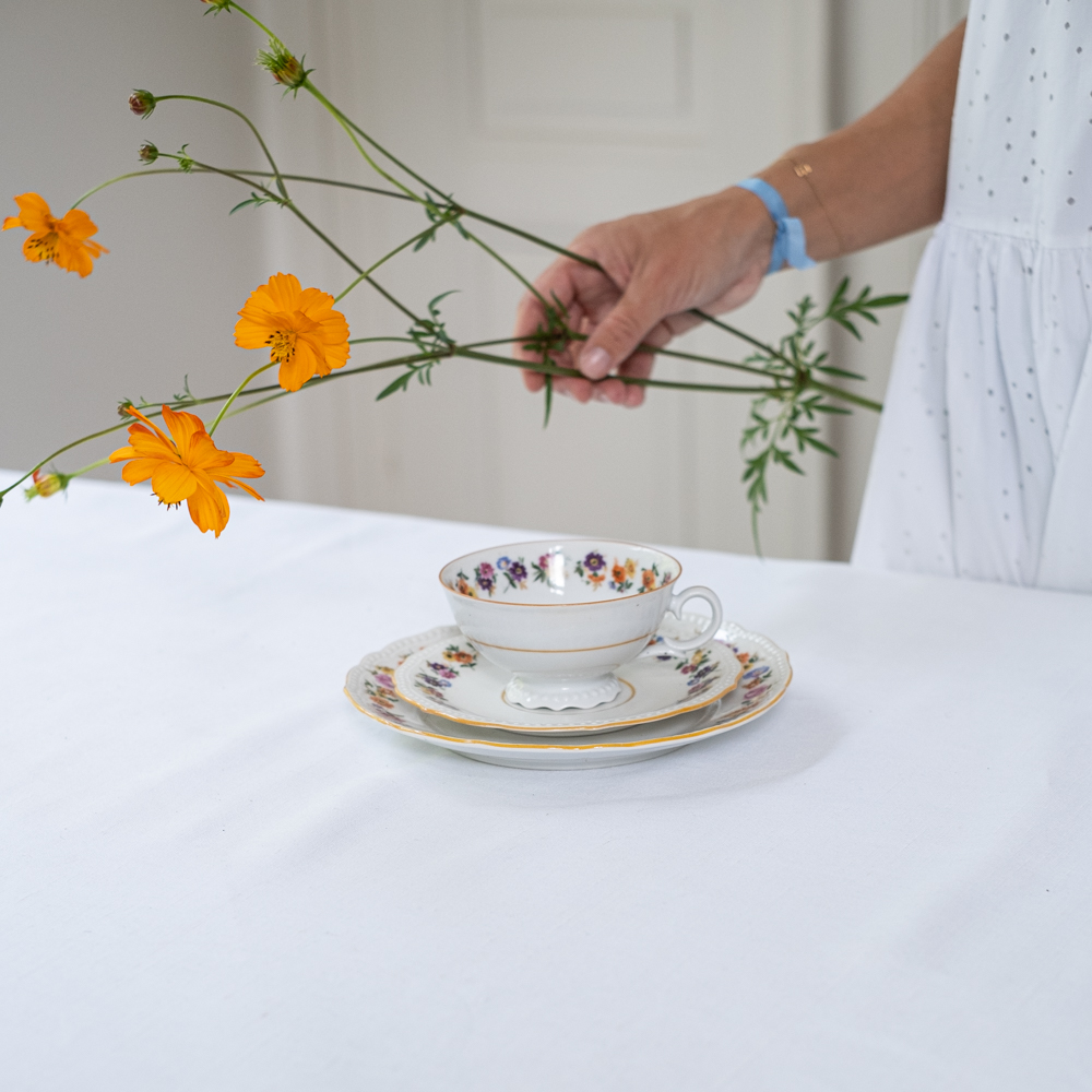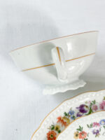 Krásná romantická snídaňová sada zdobená nejen malovanými květy, ale i plastickým dekorem po obvodu potěší každou romantickou duši.