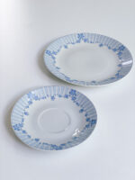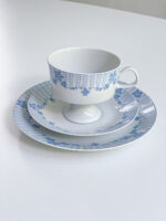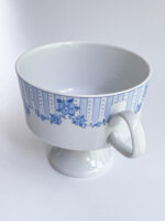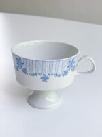 Snídaňová sada německé porcelánky Lichte s něžným dekorem v modrých odstínech. Hrneček má zvláštní tvar na nožičce.
