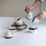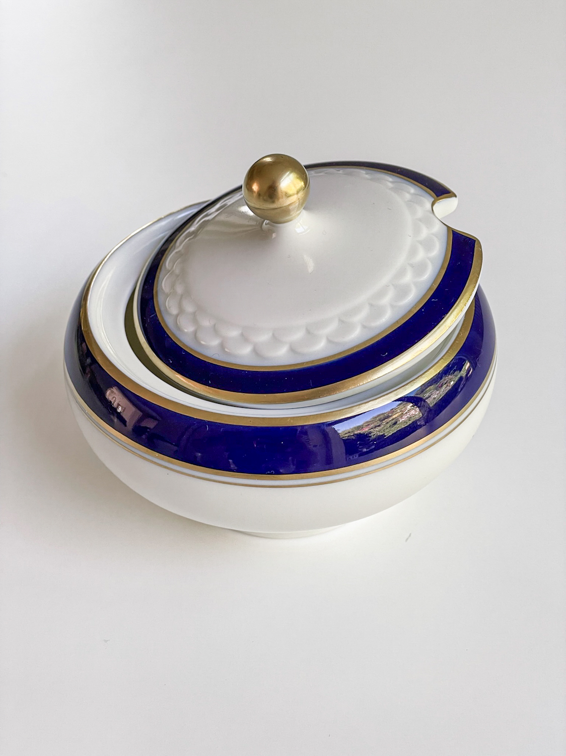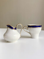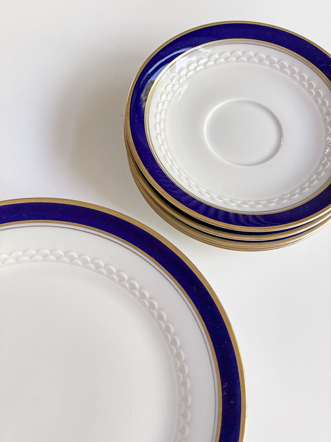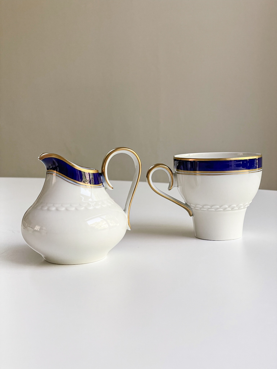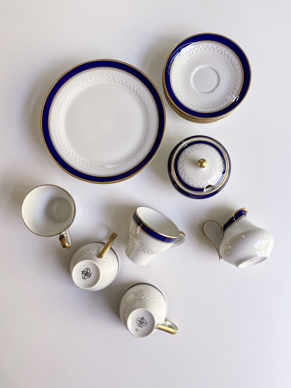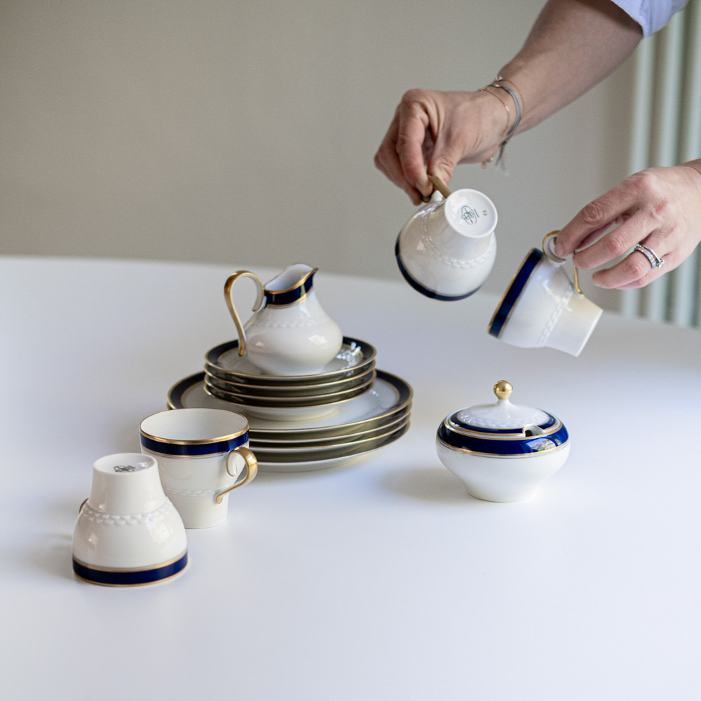 Snídaňová sada klasického tvaru a tenkého střepu v elegantní kombinaci kobaltové modré a ručně malovaného zlatého proužku. Na vznešenosti dodává porcelánu i plastické zdobení v podobě šupinek.