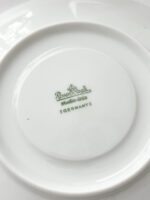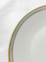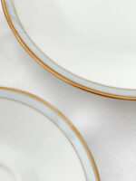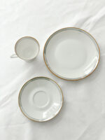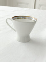 Snídaňová sada od exkluzivní německé porcelánky Rosenthal z tenkého střepu s promyšleným dekorem, který tvoří širší zlatý proužek v kombinaci s šedo-fialkovým perleťovým pruhem zakončeným tenkou zlatou linkou. Tento dekor působí velmi elegantně a nadčasově stejně jako tvar hrnečku. Některá sada má perleťový pruh více do šeda, jiná více do modra.