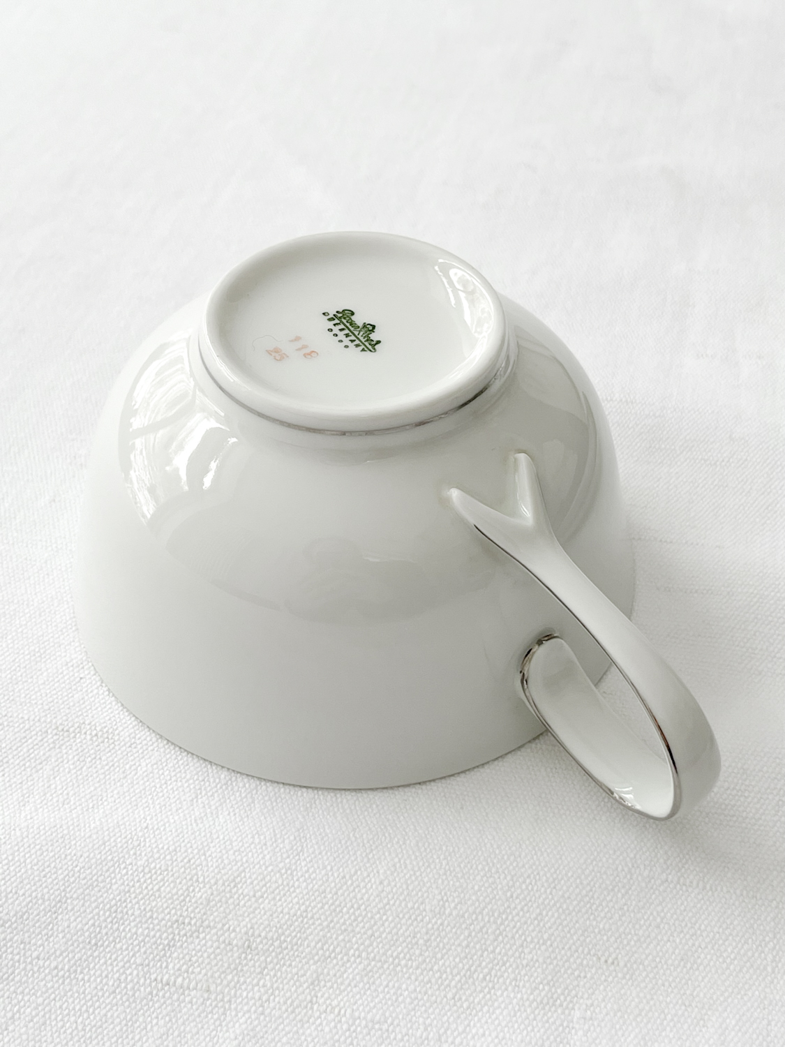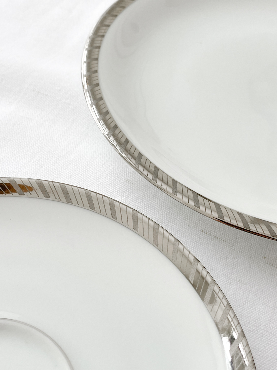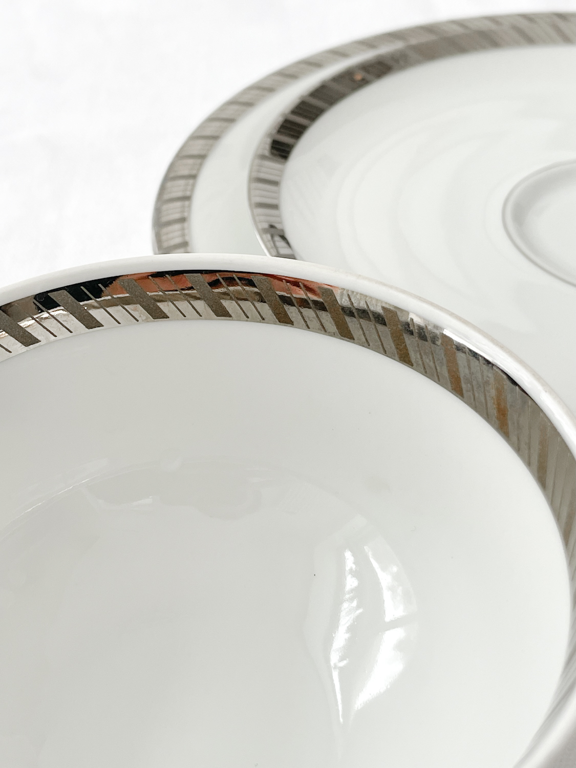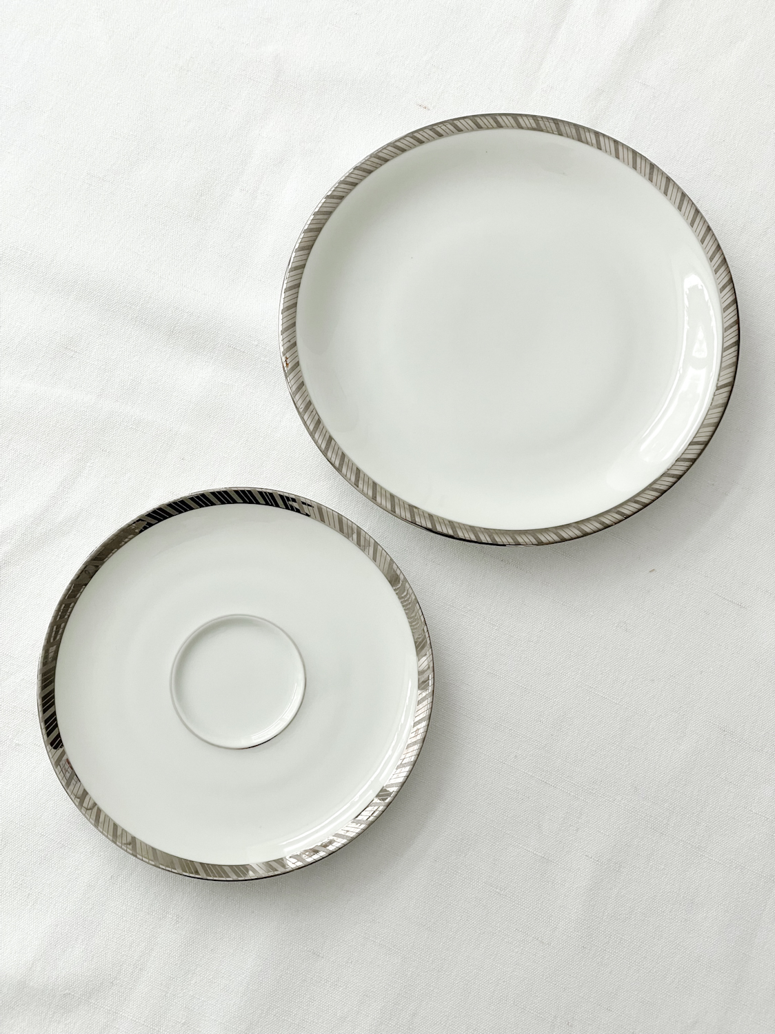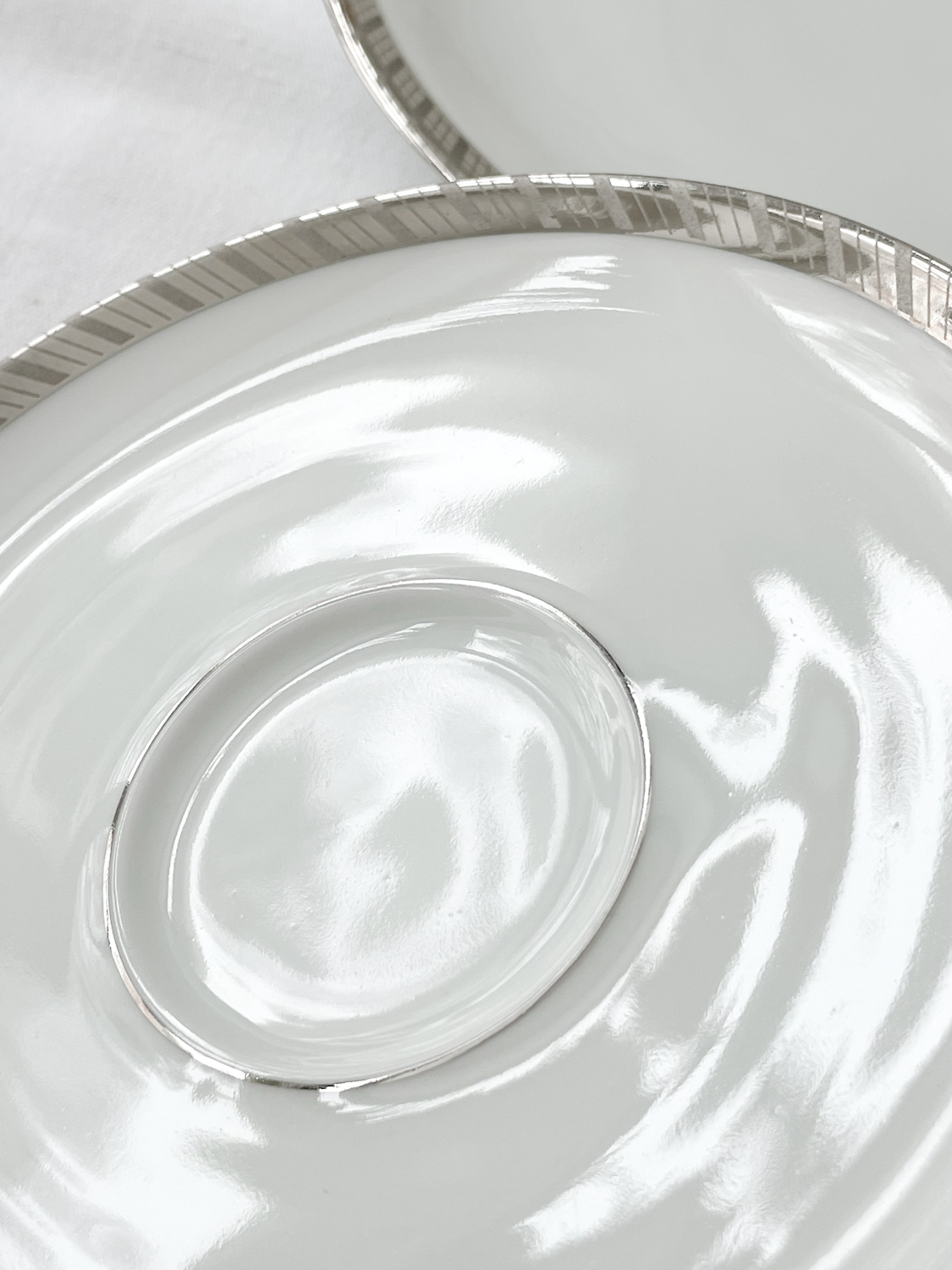 Exkluzivní snídaňová sada od věhlasné porcelánky Rosenthal s širším platinovým prouškem na kterém se ještě střídají matné a lesklé plochy. Tato sada je velmi nadčasová a vhodná i do moderního interiéru.