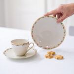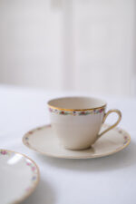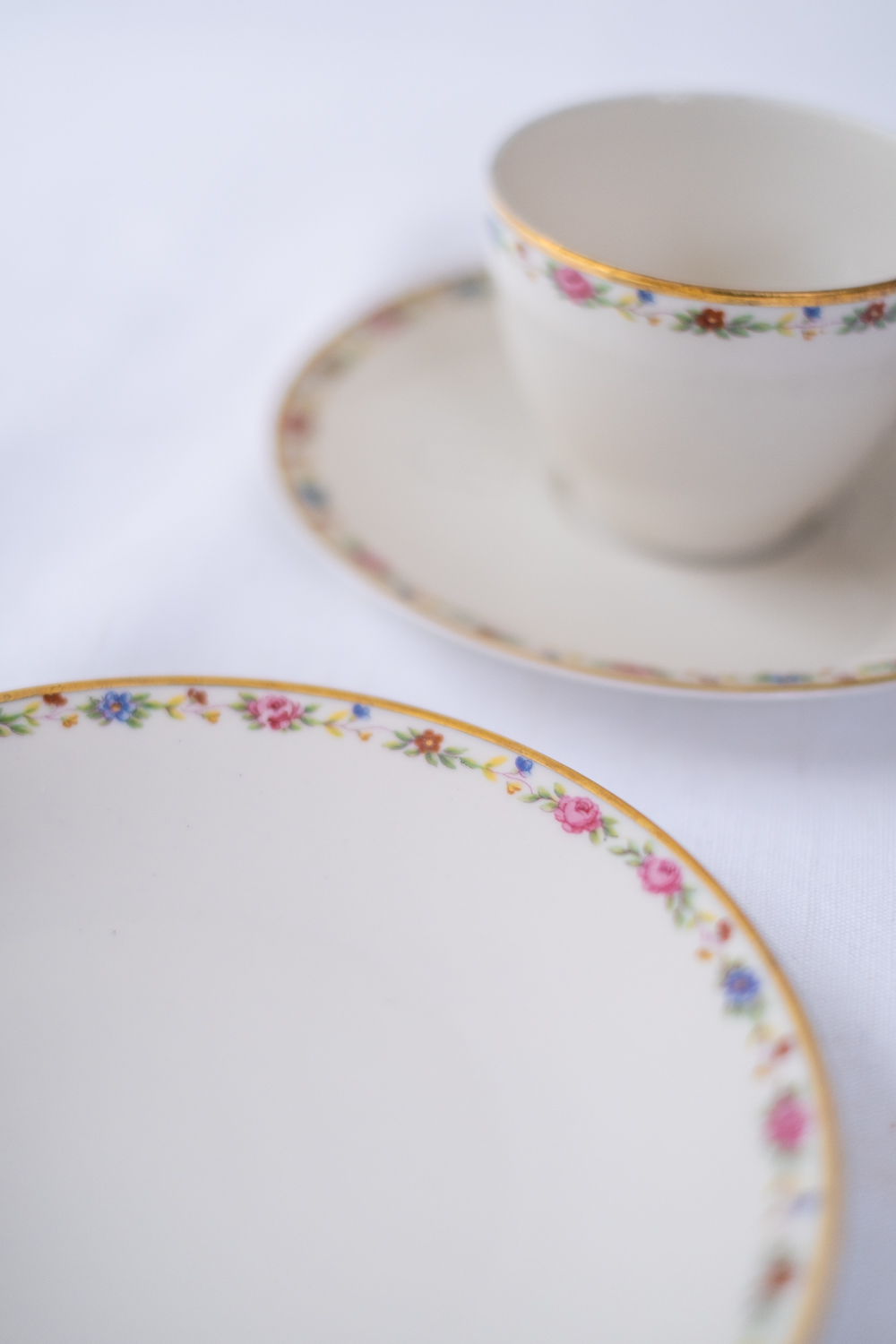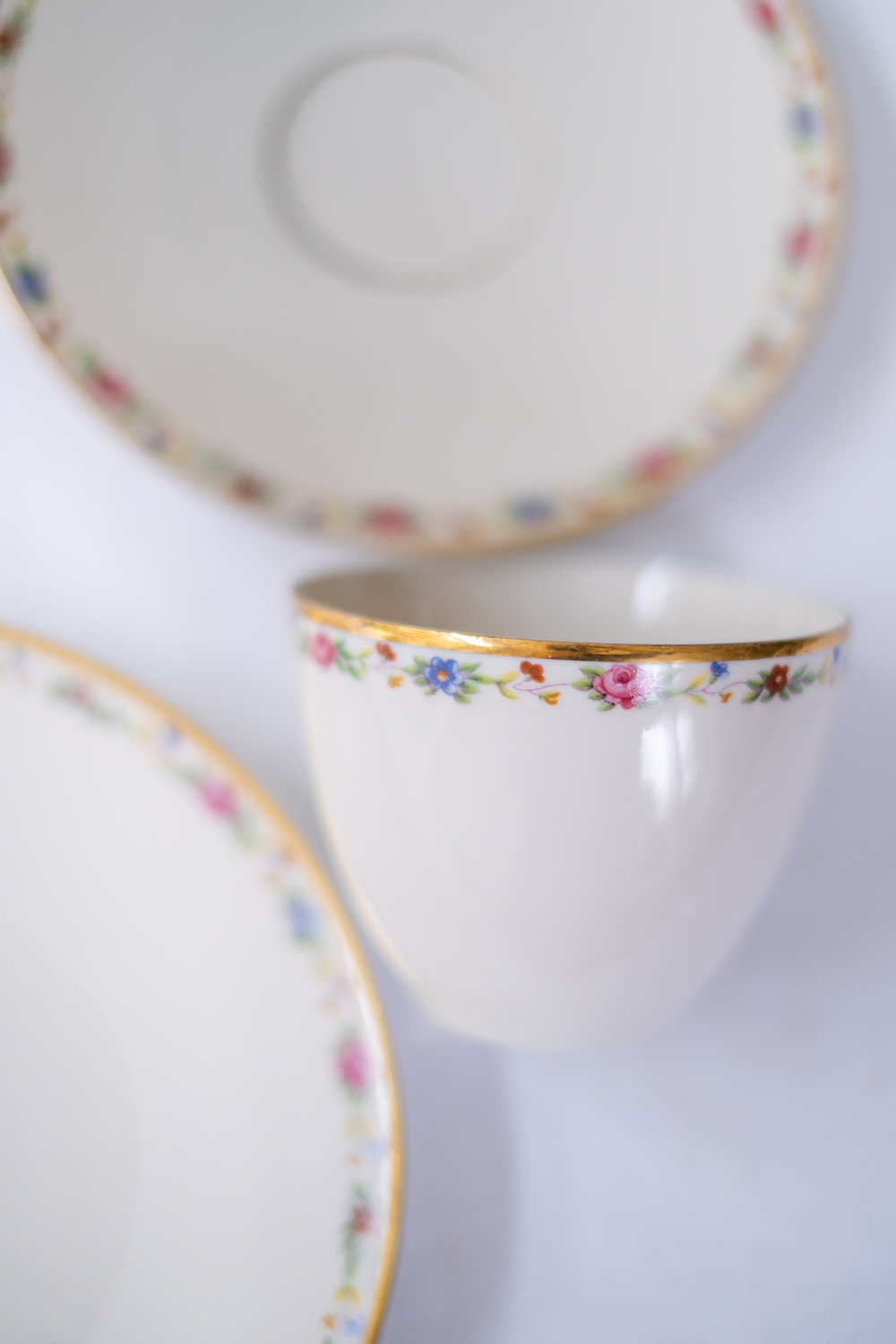 Snídaňový set v barvě slonové kosti s bordurou tvořenou drobnými kvítky pro romantické duše. Dle značení pochází z let 1960 a dále. Set je možné doplnit i o hrneček na espresso ve stejném dekoru. Pak už chybí jen čaj, sušenky a dobrá nálada.