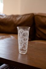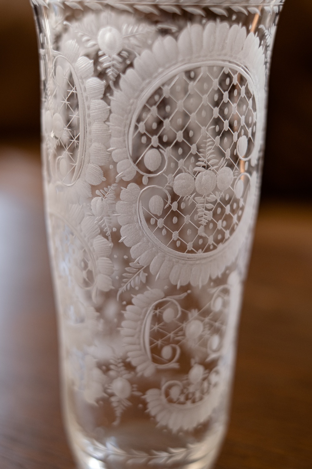 Sklenice Egermann s řezaným motivem. Vyrobená přibližně v roce 1900. Od 40. let užíval Fridrich Egermann titul privilegovaného císařského a královského výrobce s oprávněním prodávat sklo po celé monarchii.