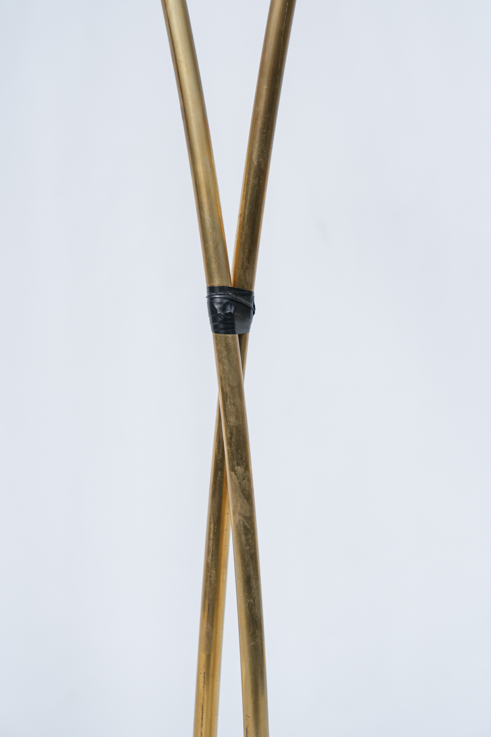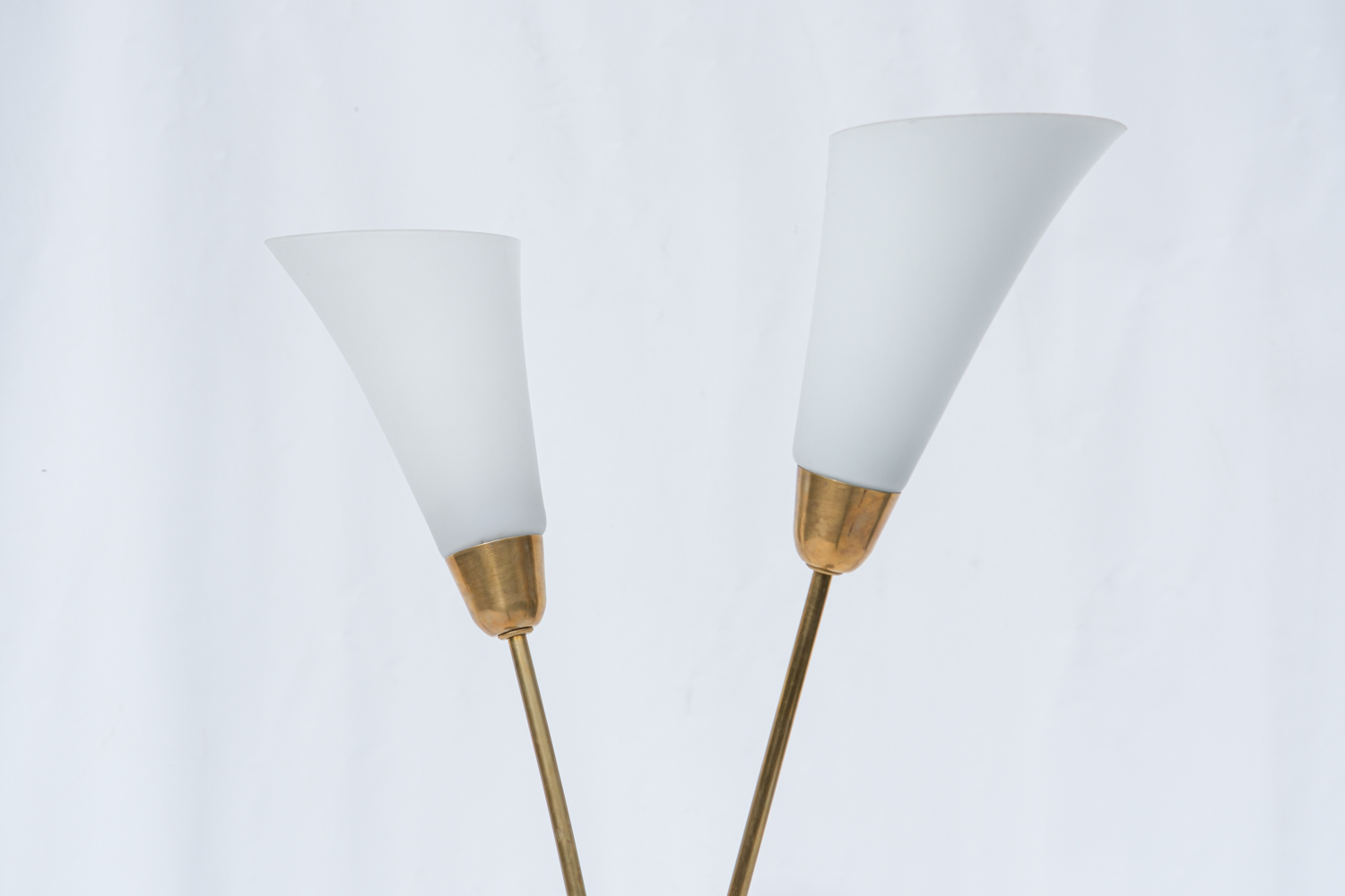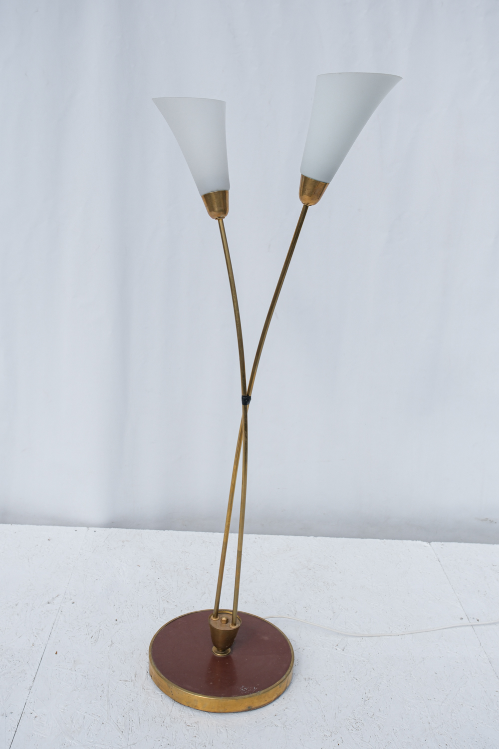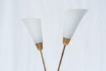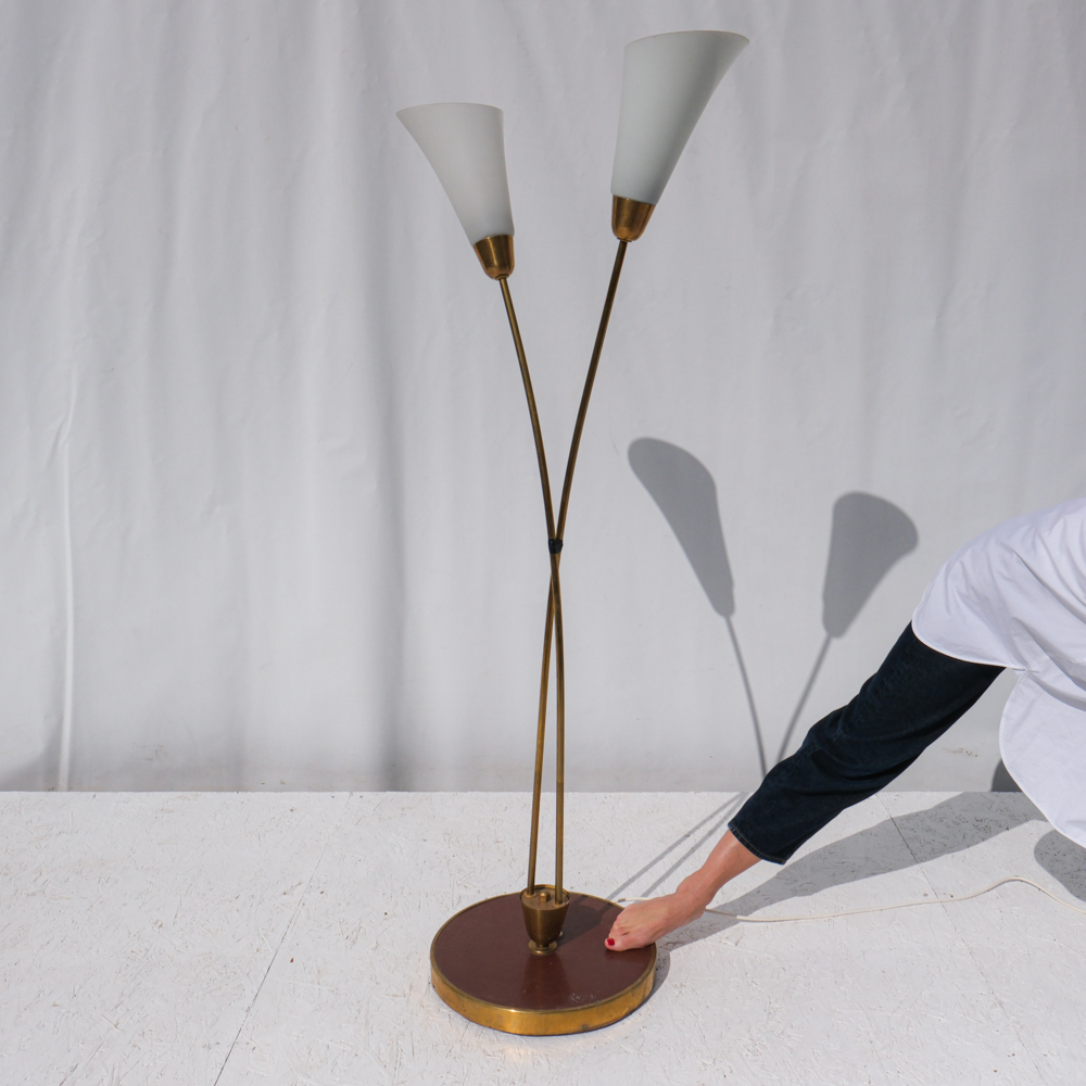 Stojací lampa z 60. let minulého století v oblíbeném bruselském stylu. Vysoká a elegantní jako květina se dvěma stonky. Pravděpodobně pochází z proslulé sklářské oblasti Kamenický Šenov, která je známá precizními svítidly i poctivým řemeslem. Minimalistický, a přitom poetický doplněk do interiéru, který bude ideálním společníkem k večerní četbě.