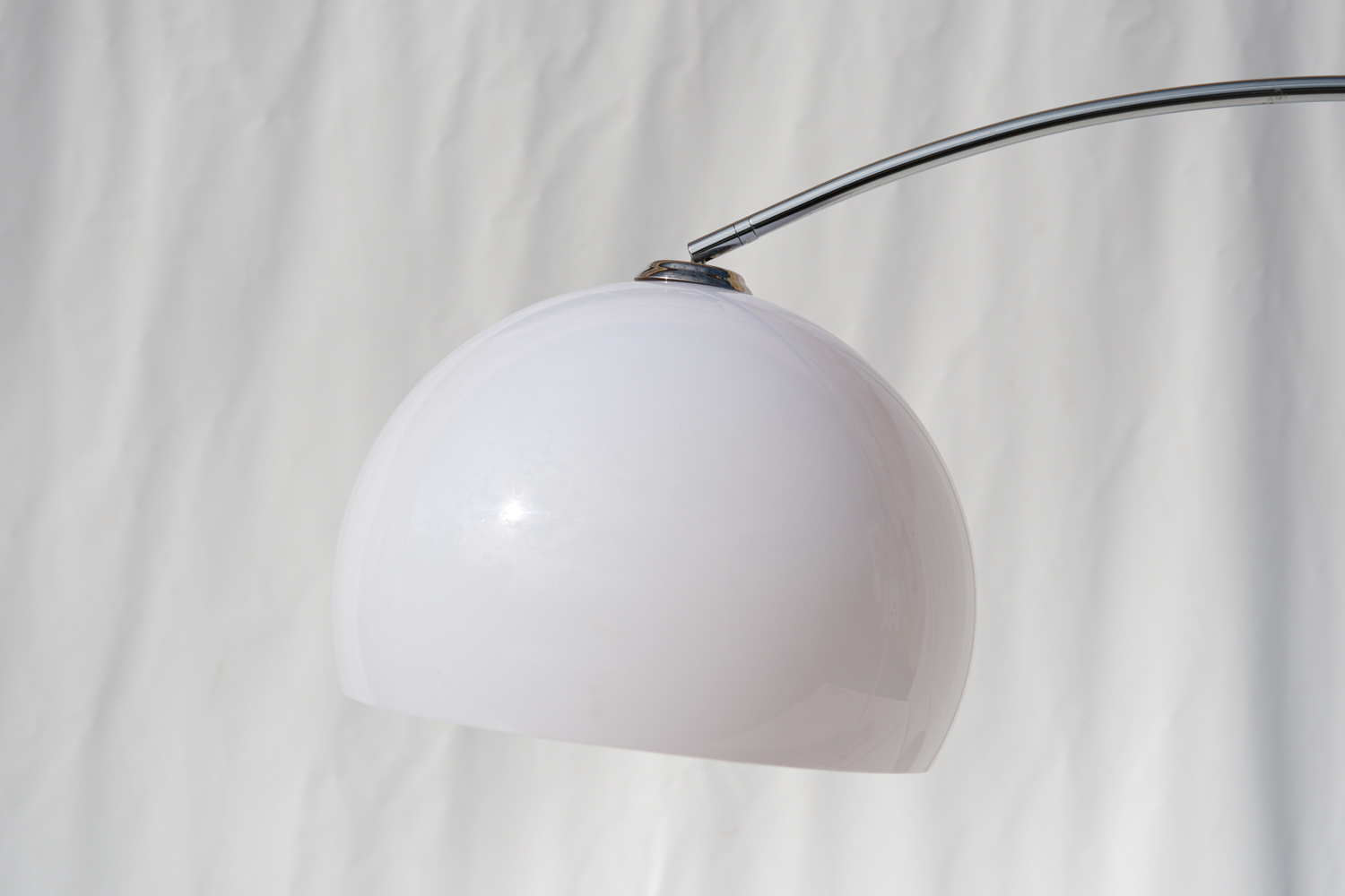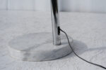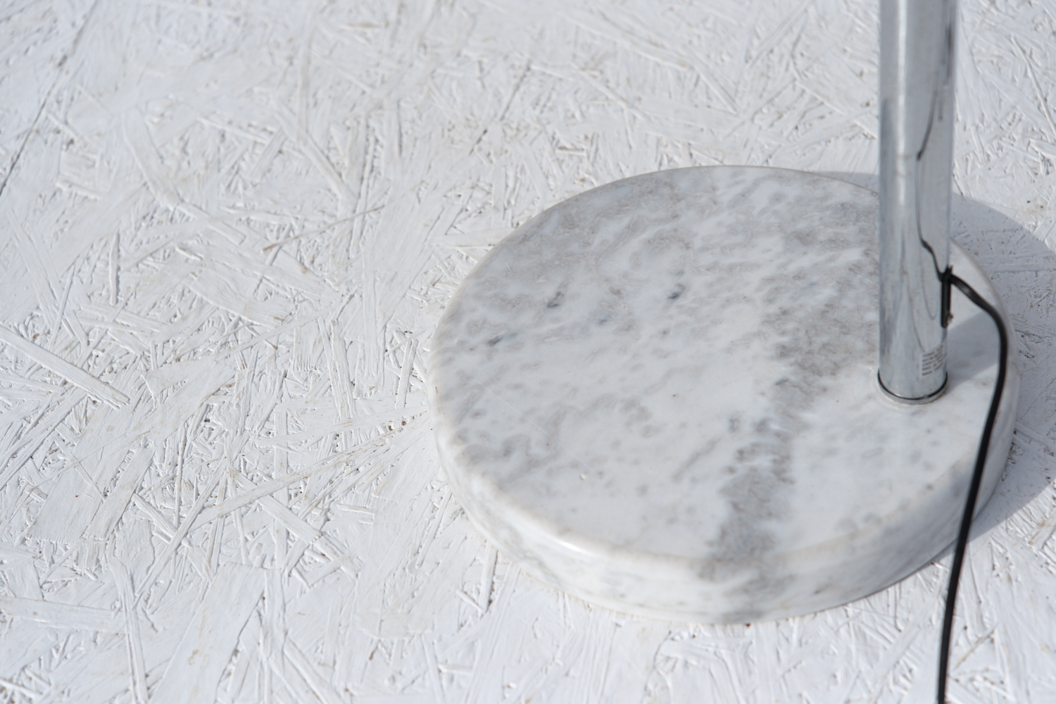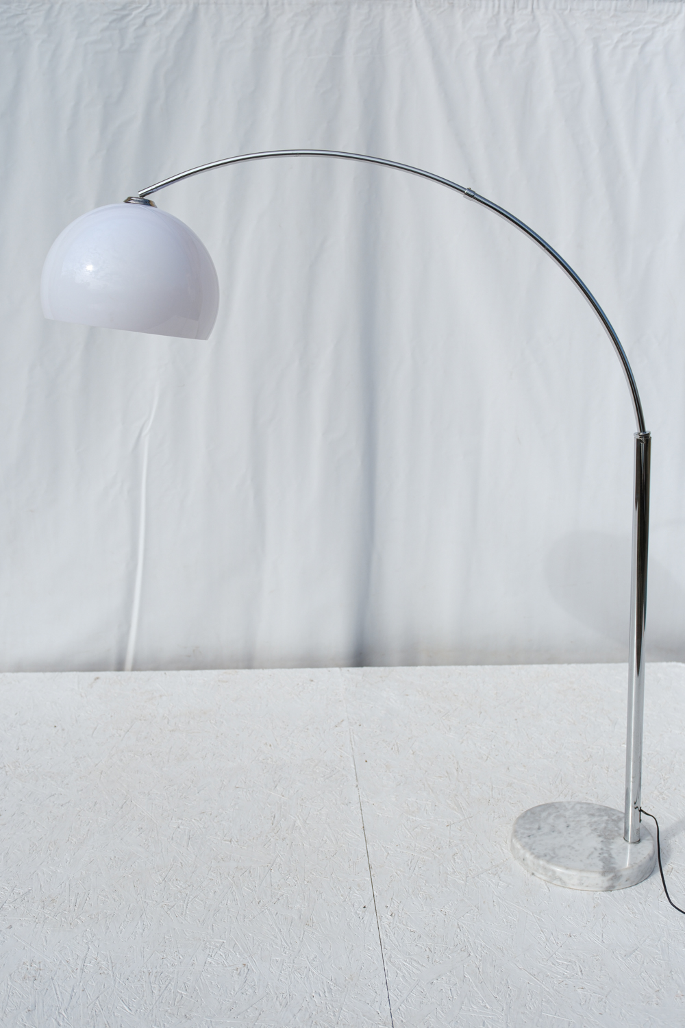 Stojací lampa s obloukovým ramenem, která vychází z ikonických návrhů 60. a 70. let. Jednoduchá chromovaná konstrukce doplněná mramorovou podstavou nese polokulové stínidlo, které směruje světlo přesně tam, kde je potřeba.