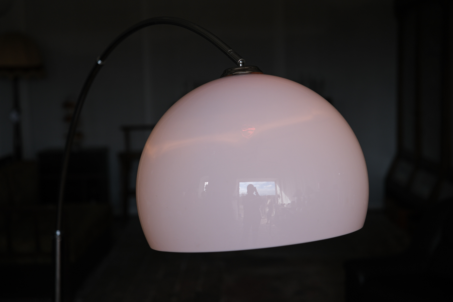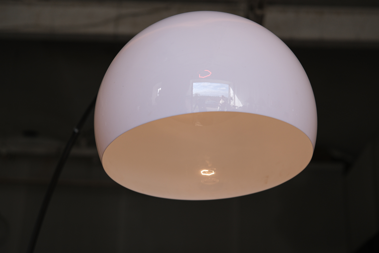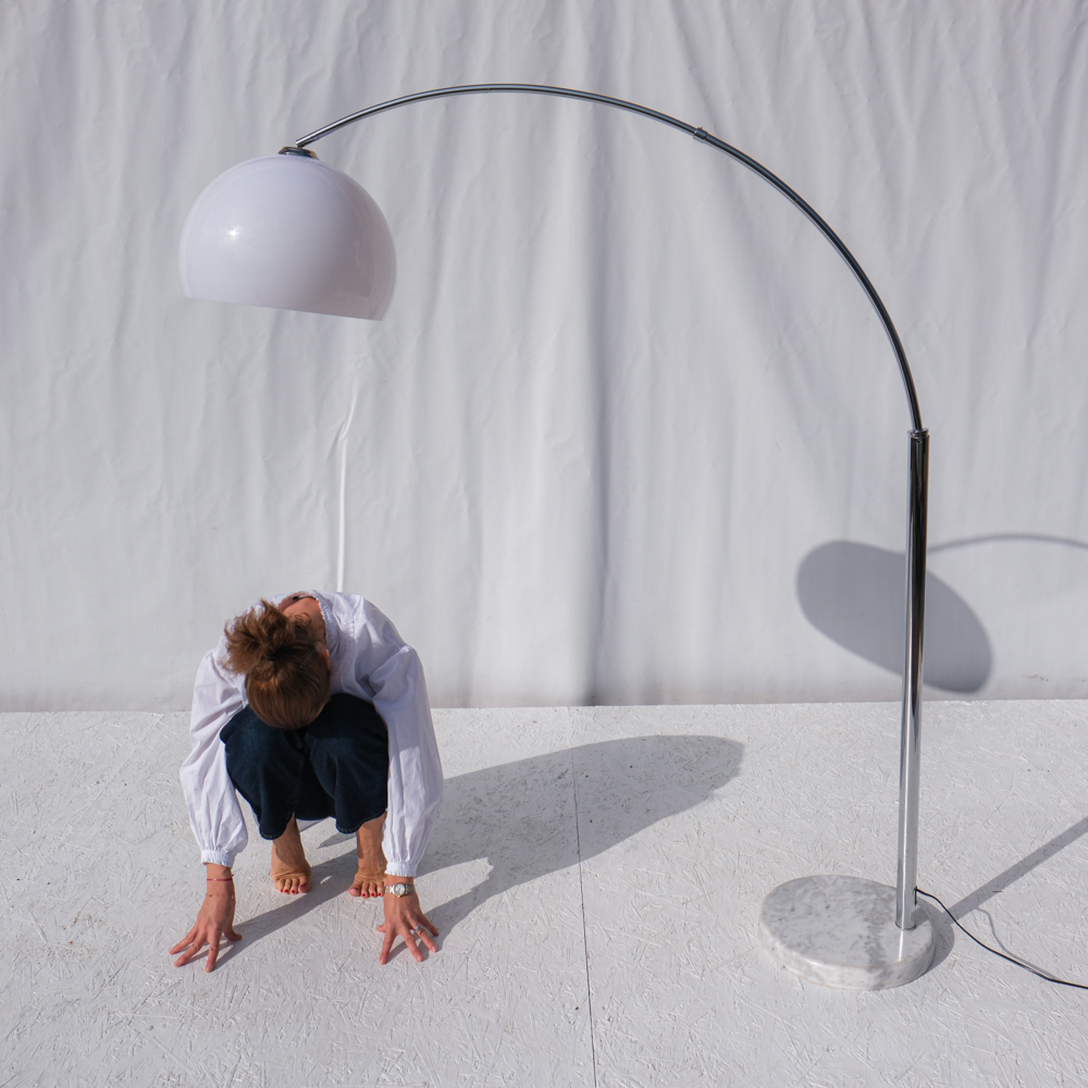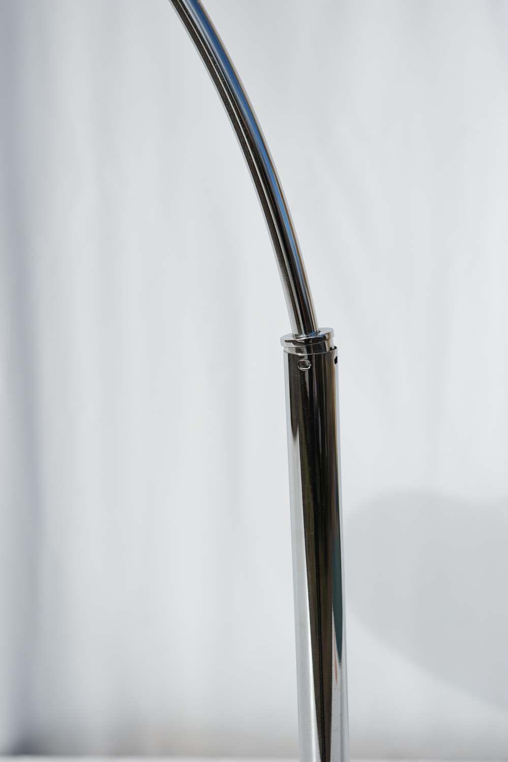 Stojací lampa s obloukovým ramenem, která vychází z ikonických návrhů 60. a 70. let. Jednoduchá chromovaná konstrukce doplněná mramorovou podstavou nese polokulové stínidlo, které směruje světlo přesně tam, kde je potřeba.