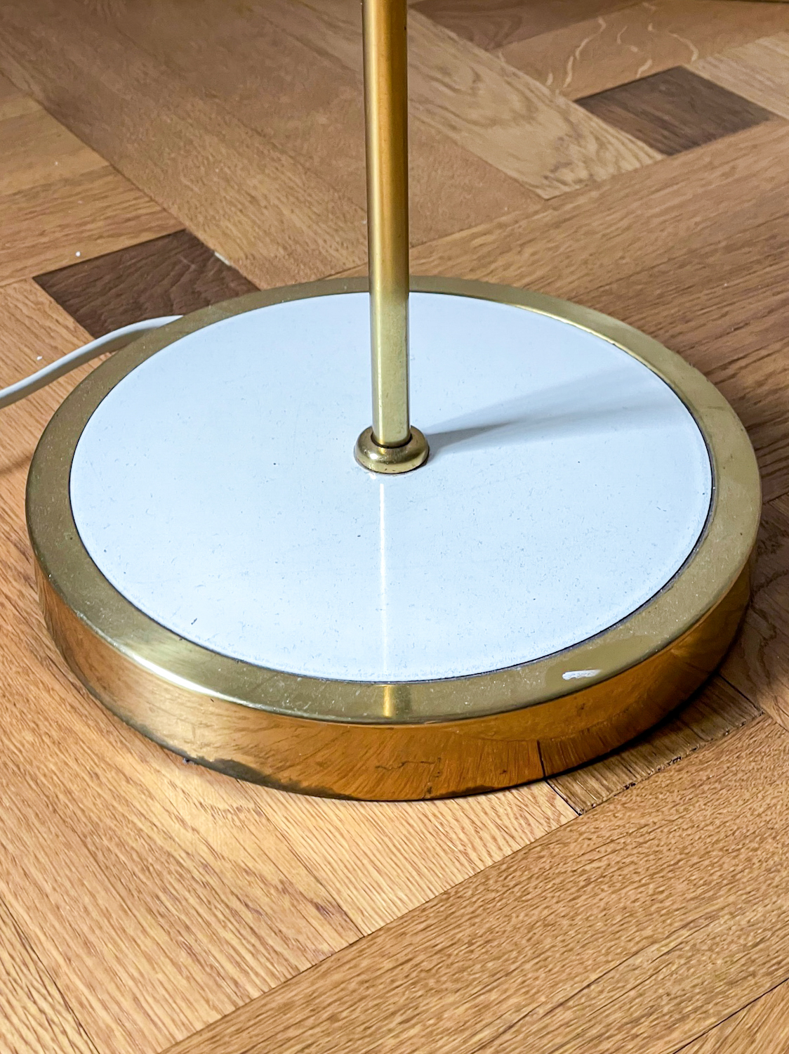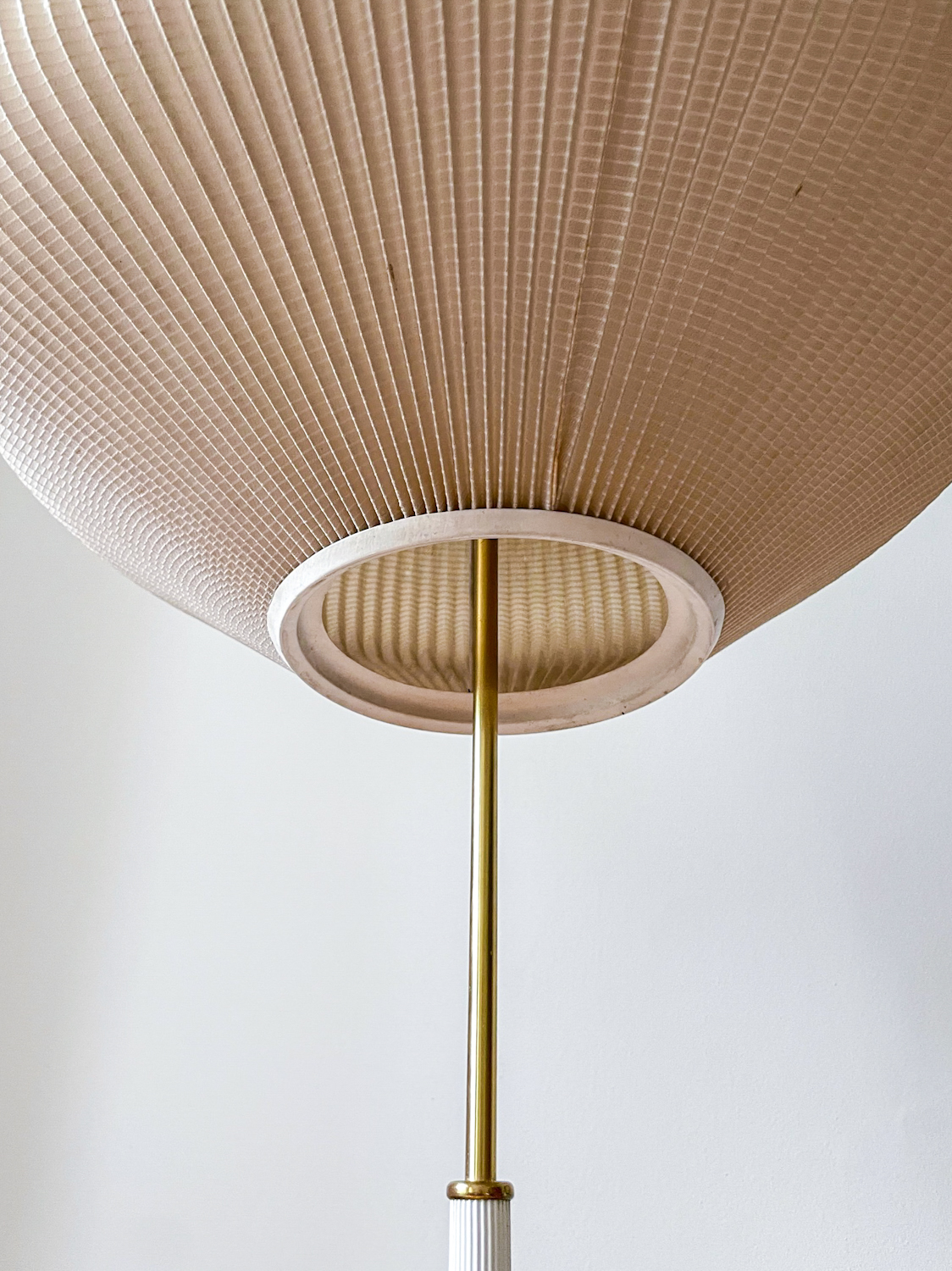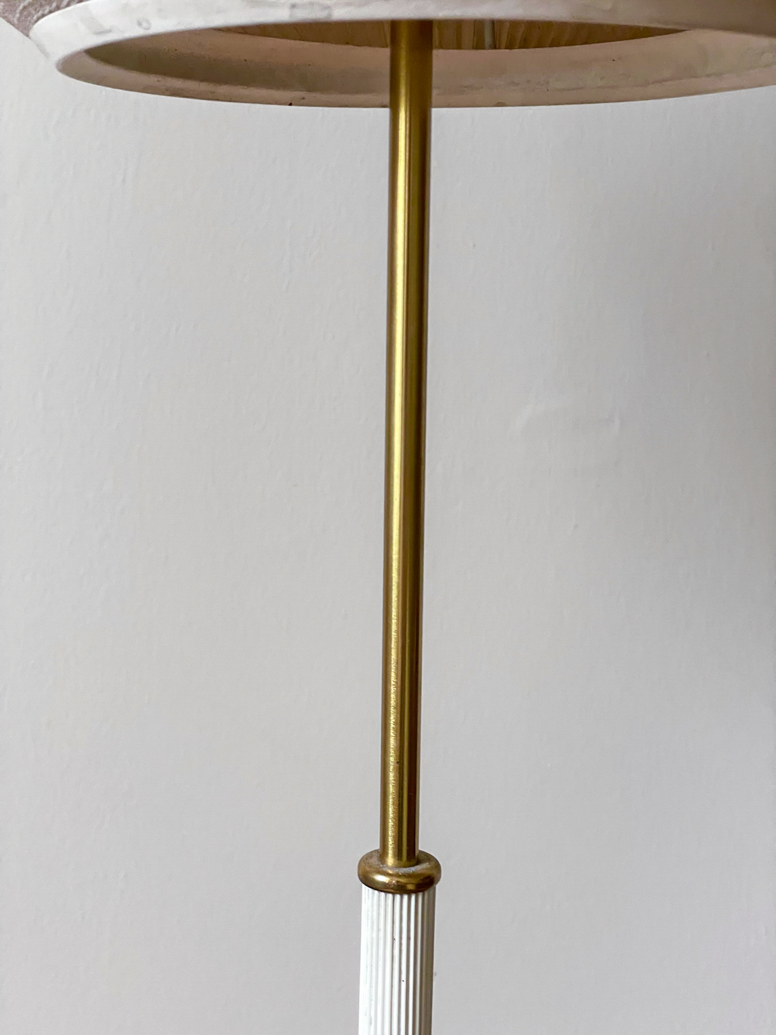 Krásná elegantní stojací lampa z poloviny minulého století. Stínidlo je z plisované látky, noha kov v kombinaci s bílým plastem.