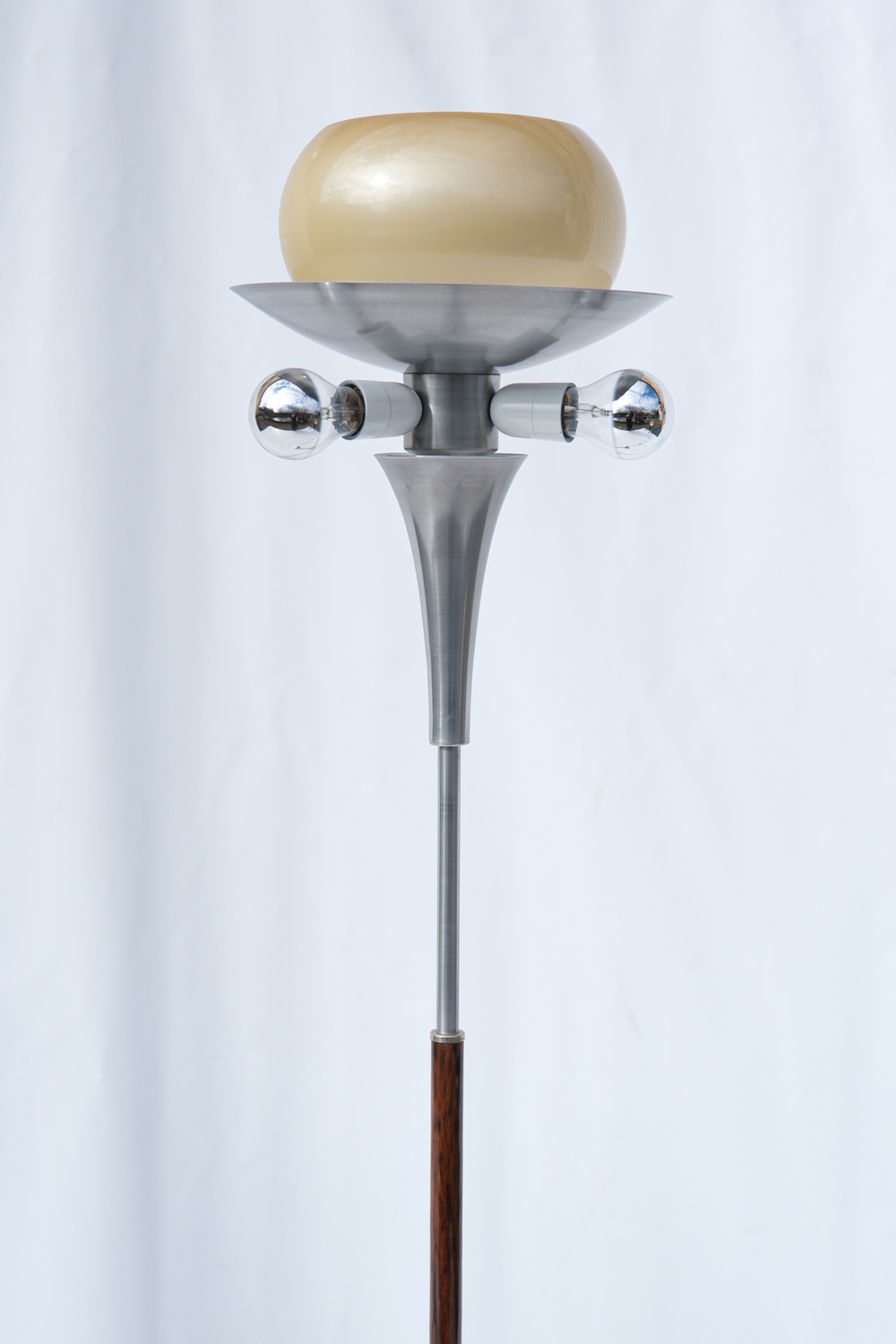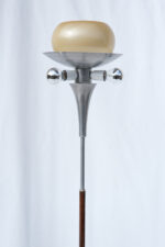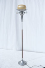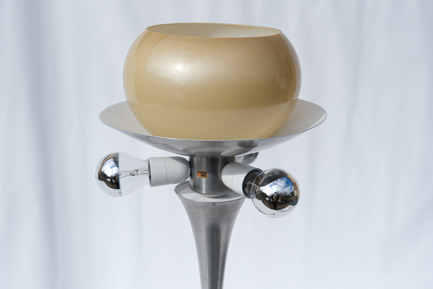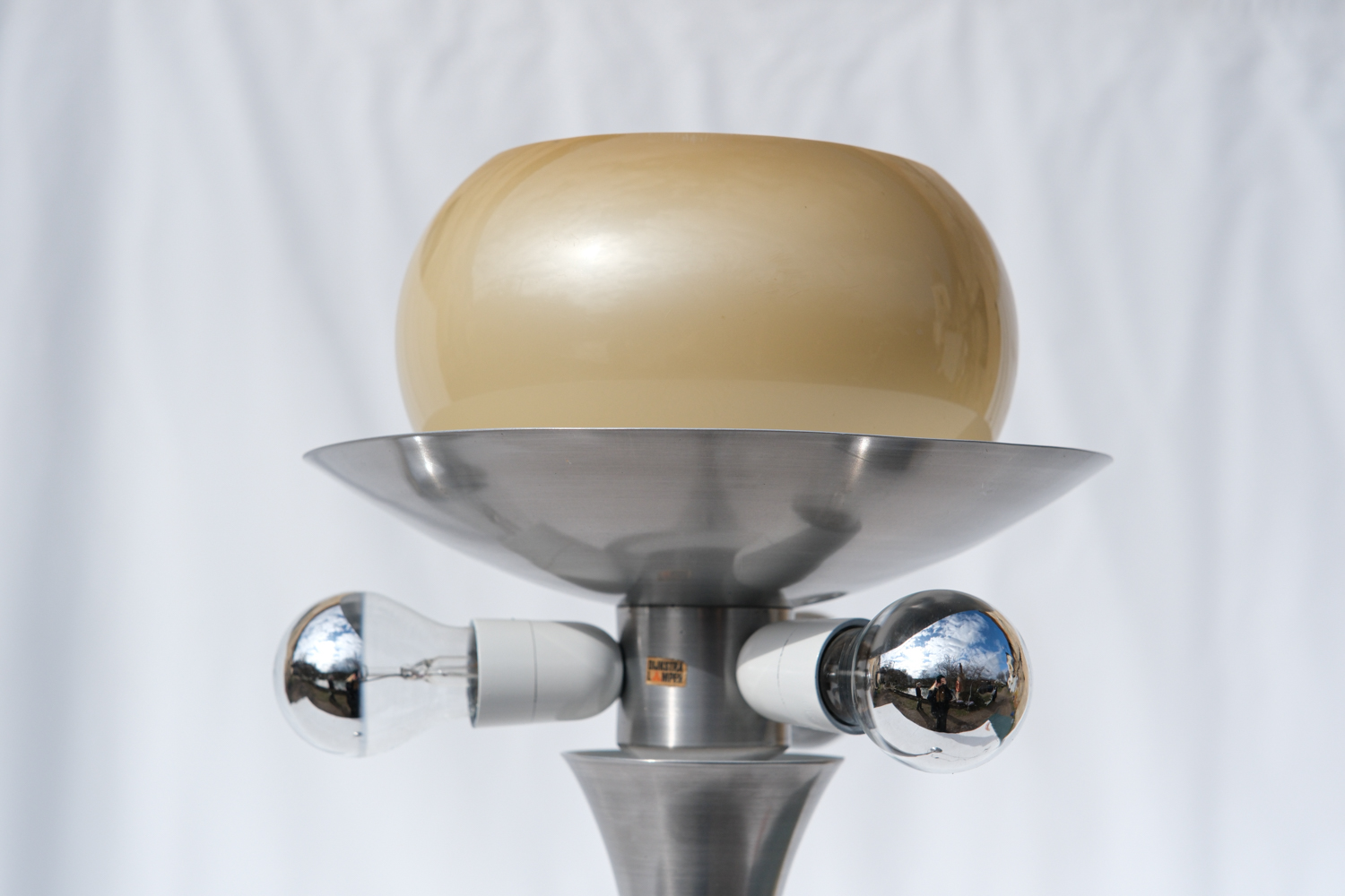 Lampa pochází z produkce nizozemské značky Dijkstra Lampen, pro kterou byla v 70. letech charakteristická práce s kombinací kovu, skla a dřeva. Skleněné stínidlo má tlumený okrově-slonovinový odstín, který působí klidně a přirozeně a dobře kontrastuje s chladnějším kovem konstrukce.