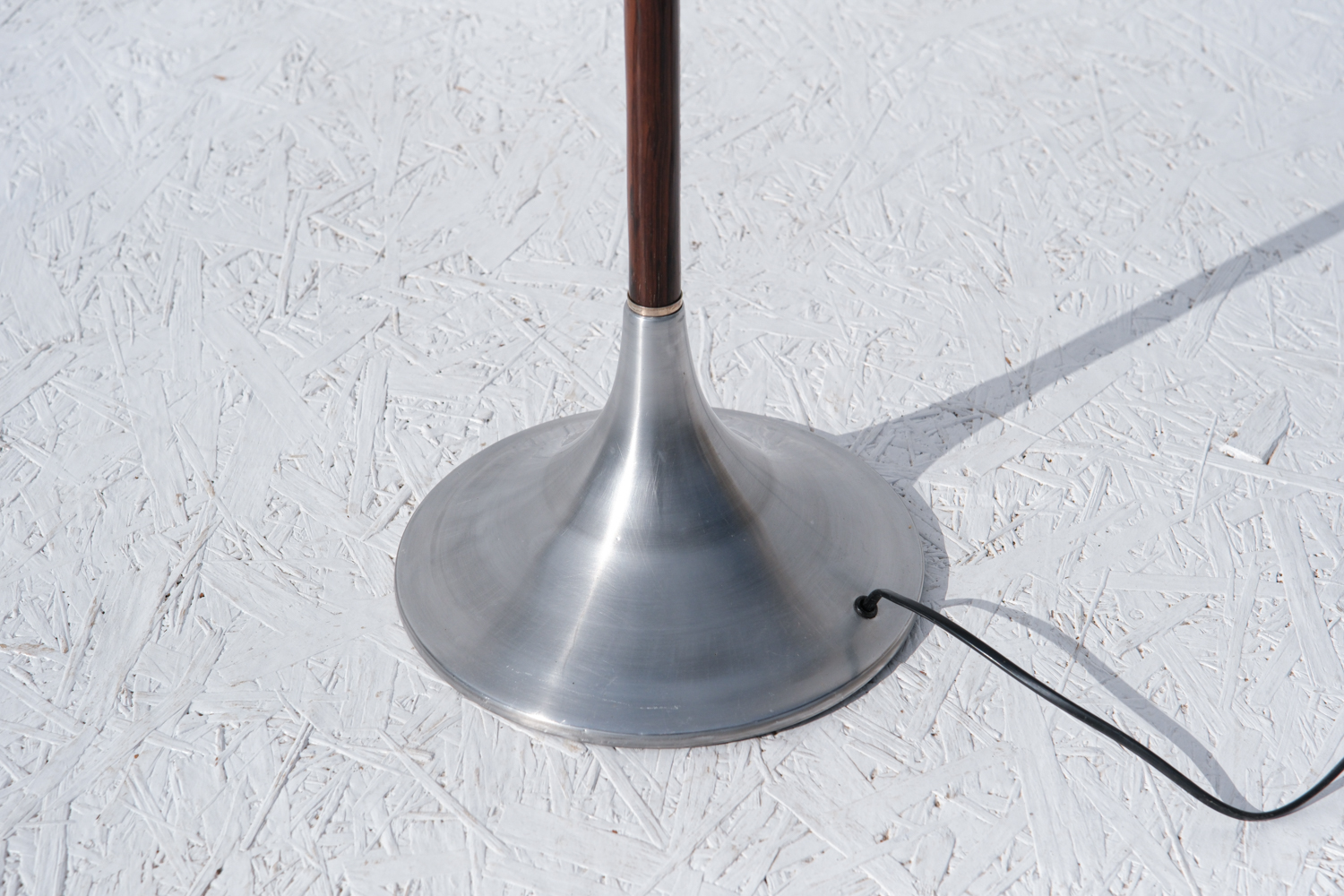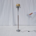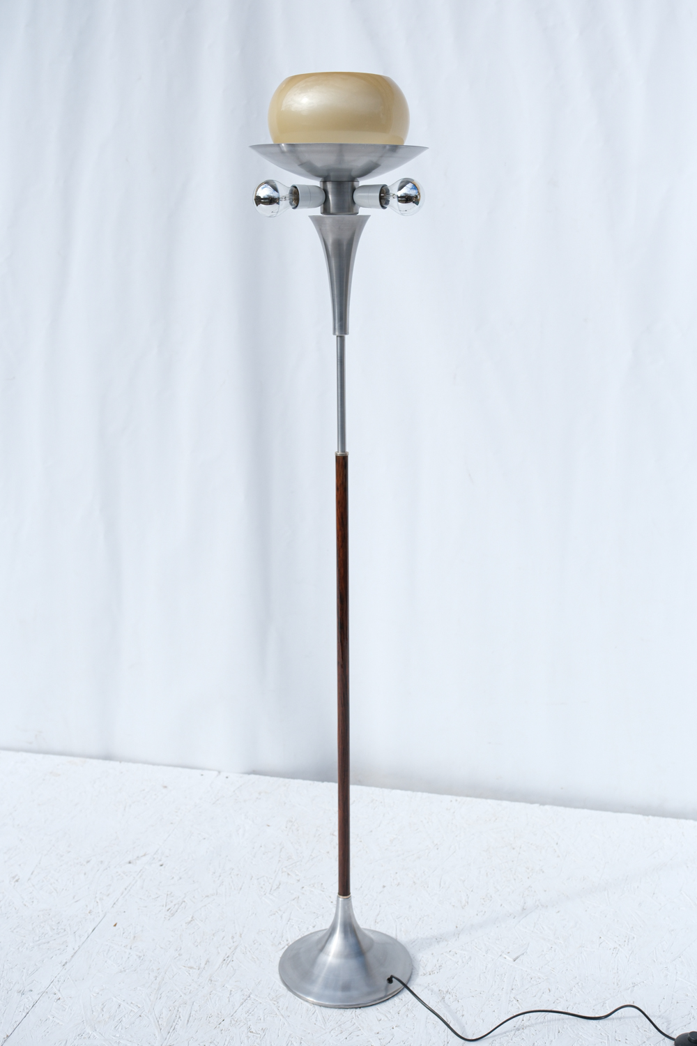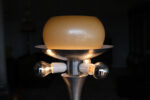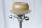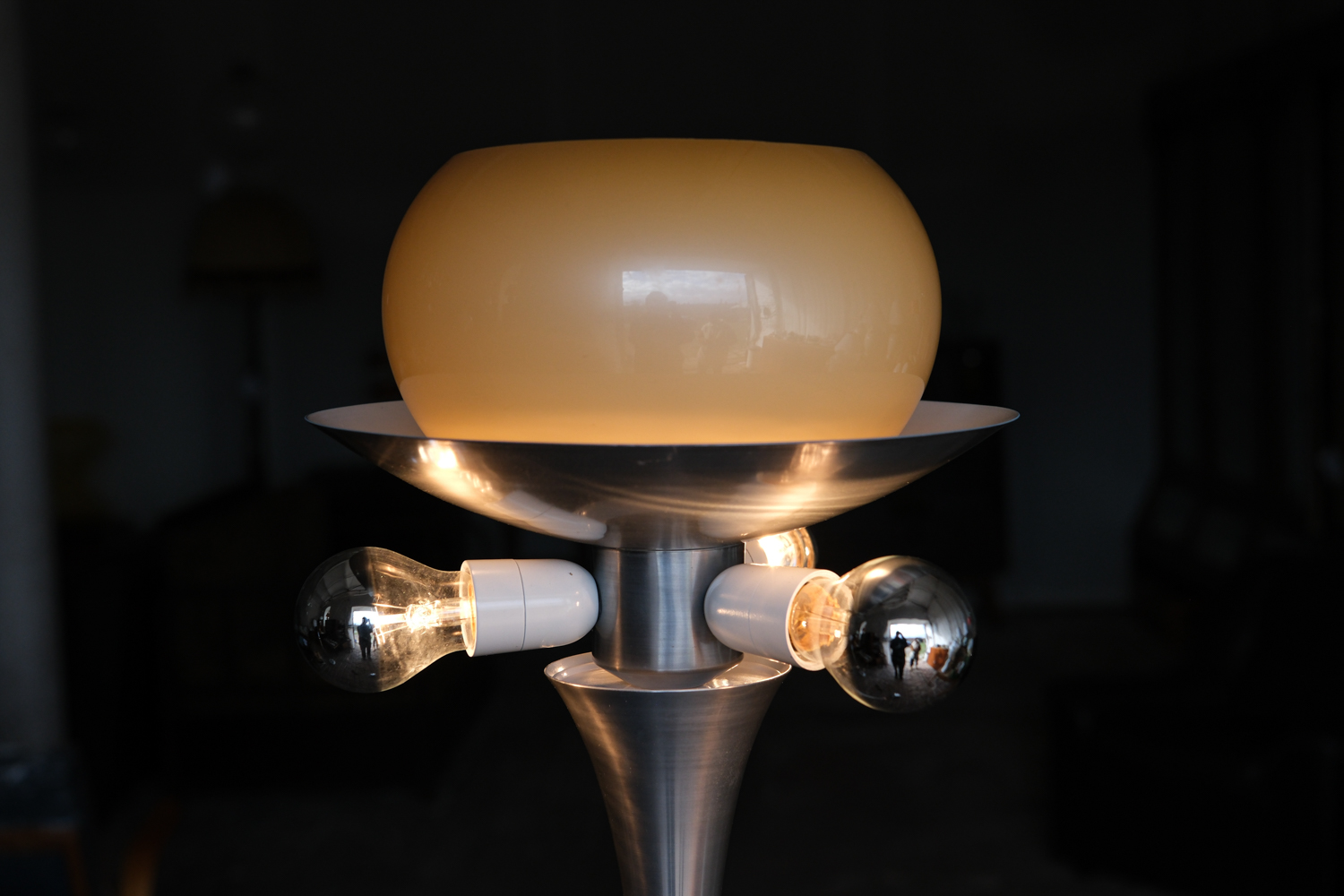 Lampa pochází z produkce nizozemské značky Dijkstra Lampen, pro kterou byla v 70. letech charakteristická práce s kombinací kovu, skla a dřeva. Skleněné stínidlo má tlumený okrově-slonovinový odstín, který působí klidně a přirozeně a dobře kontrastuje s chladnějším kovem konstrukce.