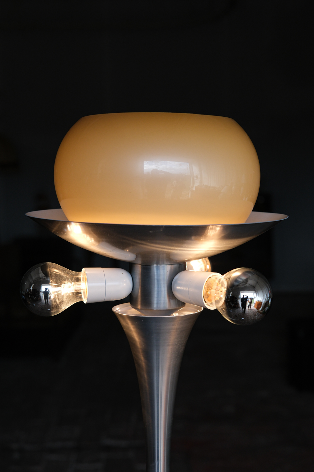 Spíš objekt než jen lampa. Neobvyklá kompozice centrálního kovového „talíře“, opálového skla a trojice bočních světelných bodů vytváří výrazný celek, který okamžitě přitáhne pozornost.