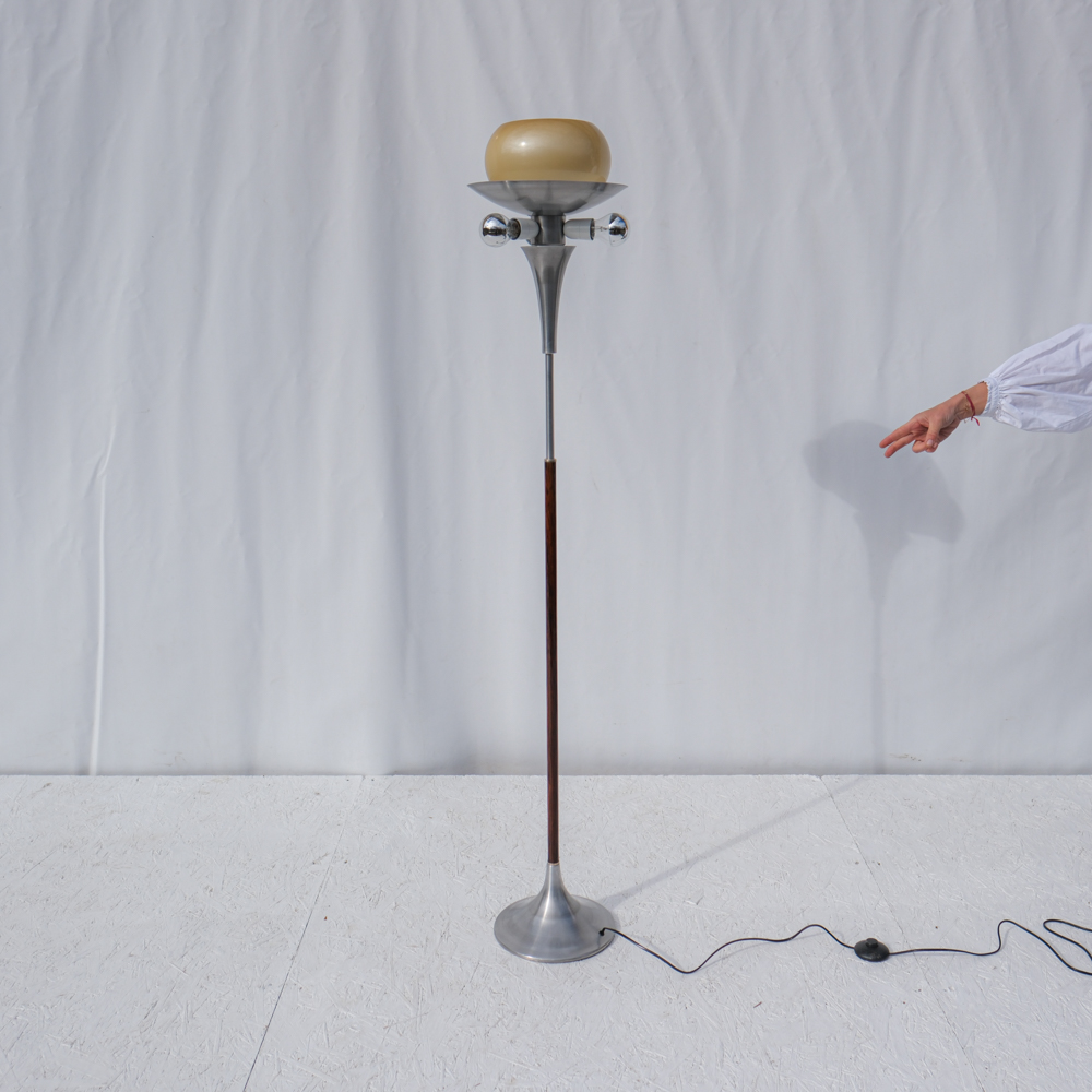 Celek má lehce futuristický výraz, ale nepůsobí chladně – technický základ vyvažuje měkké sklo i dřevěný prvek ve stojině. Lampa tak funguje nejen jako zdroj světla, ale i jako výrazný solitér v interiéru.