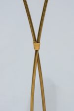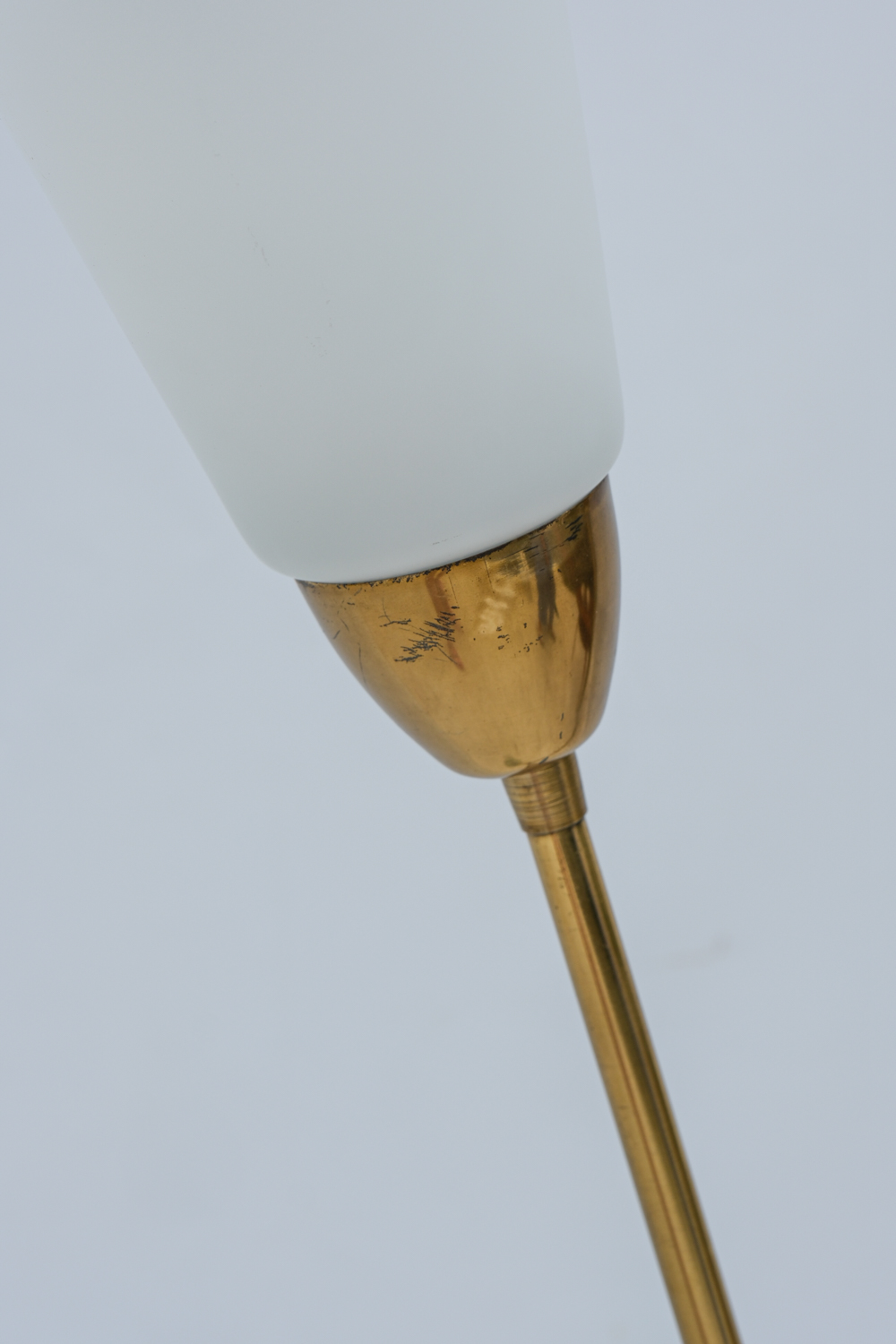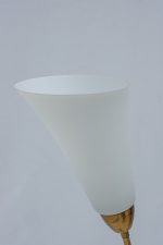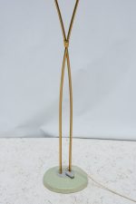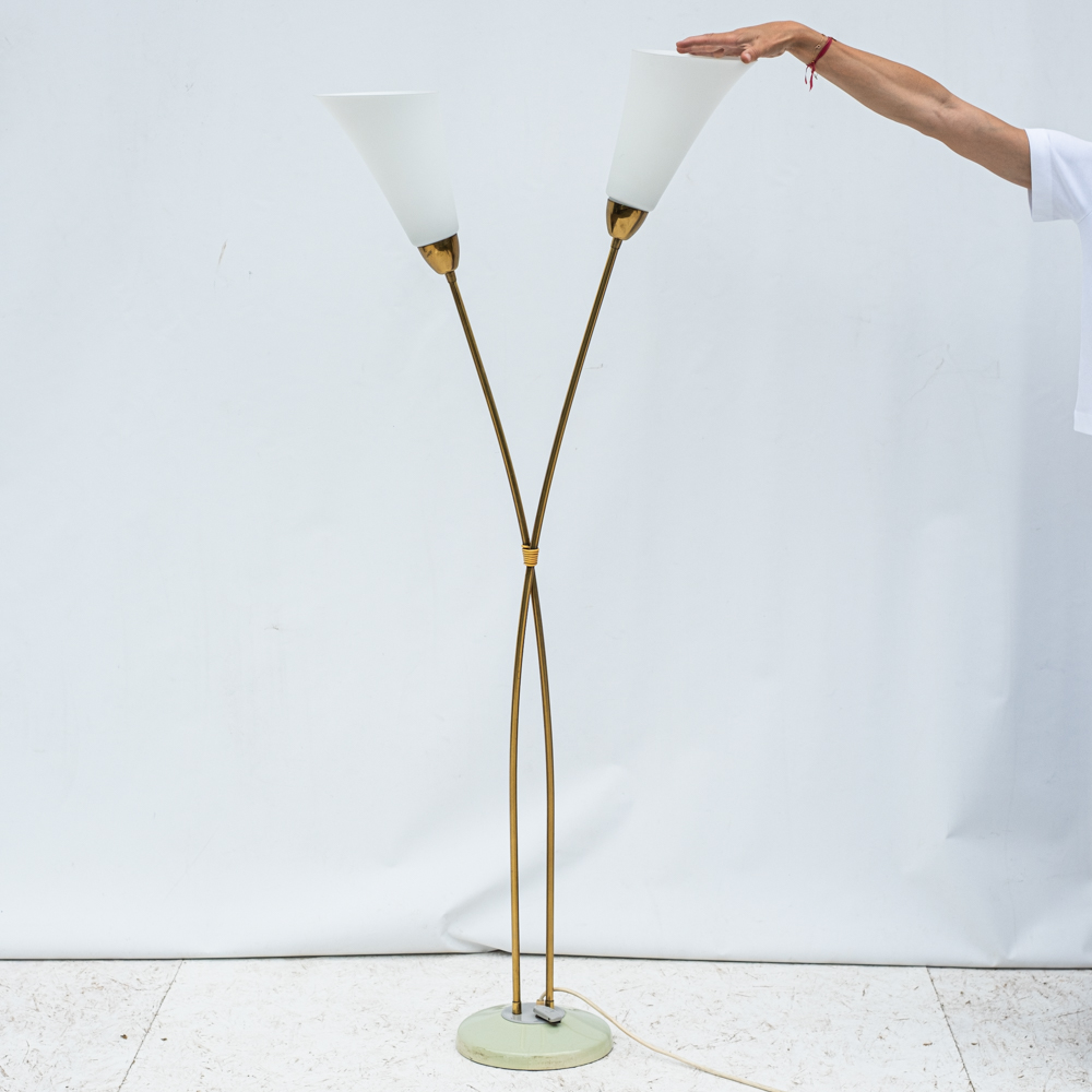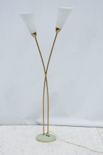 Stojací lampa z 60. let minulého století v oblíbenem bruselském stylu. Vysoká a elegantní jako květina se dvěma stonky. Pavděpodobně pochází z proslulé sklářské oblasti Kamenický Šenov, která je známá precizními svítidly i poctivým řemeslem. Minimalistický, a přitom poetický doplněk do interiéru, který bude ideálním společníkem k večerní četbě.