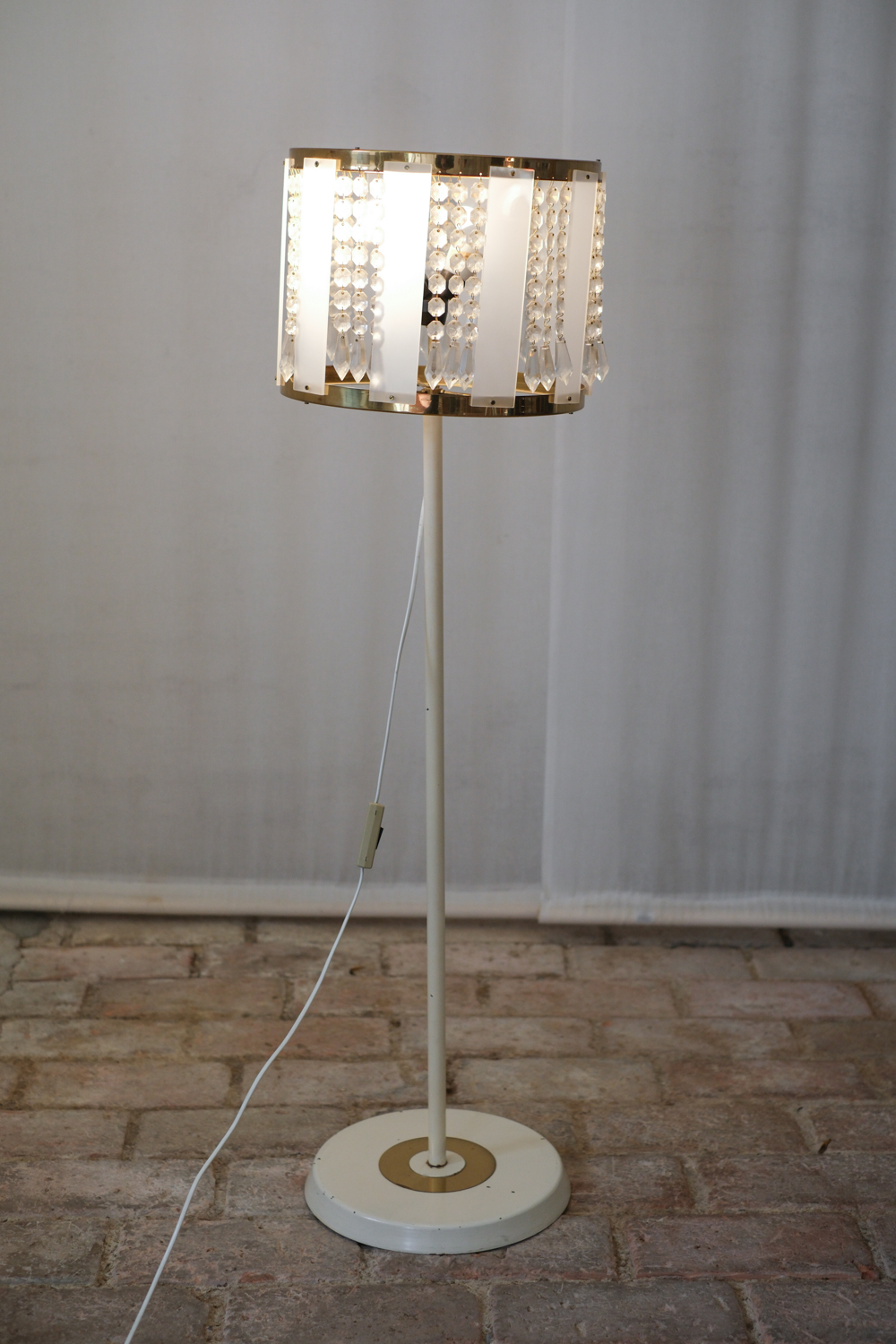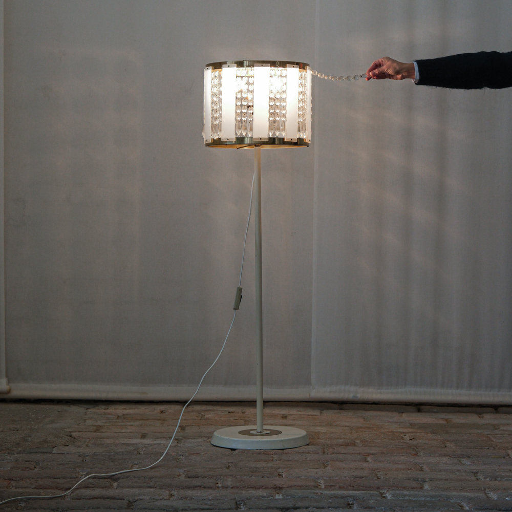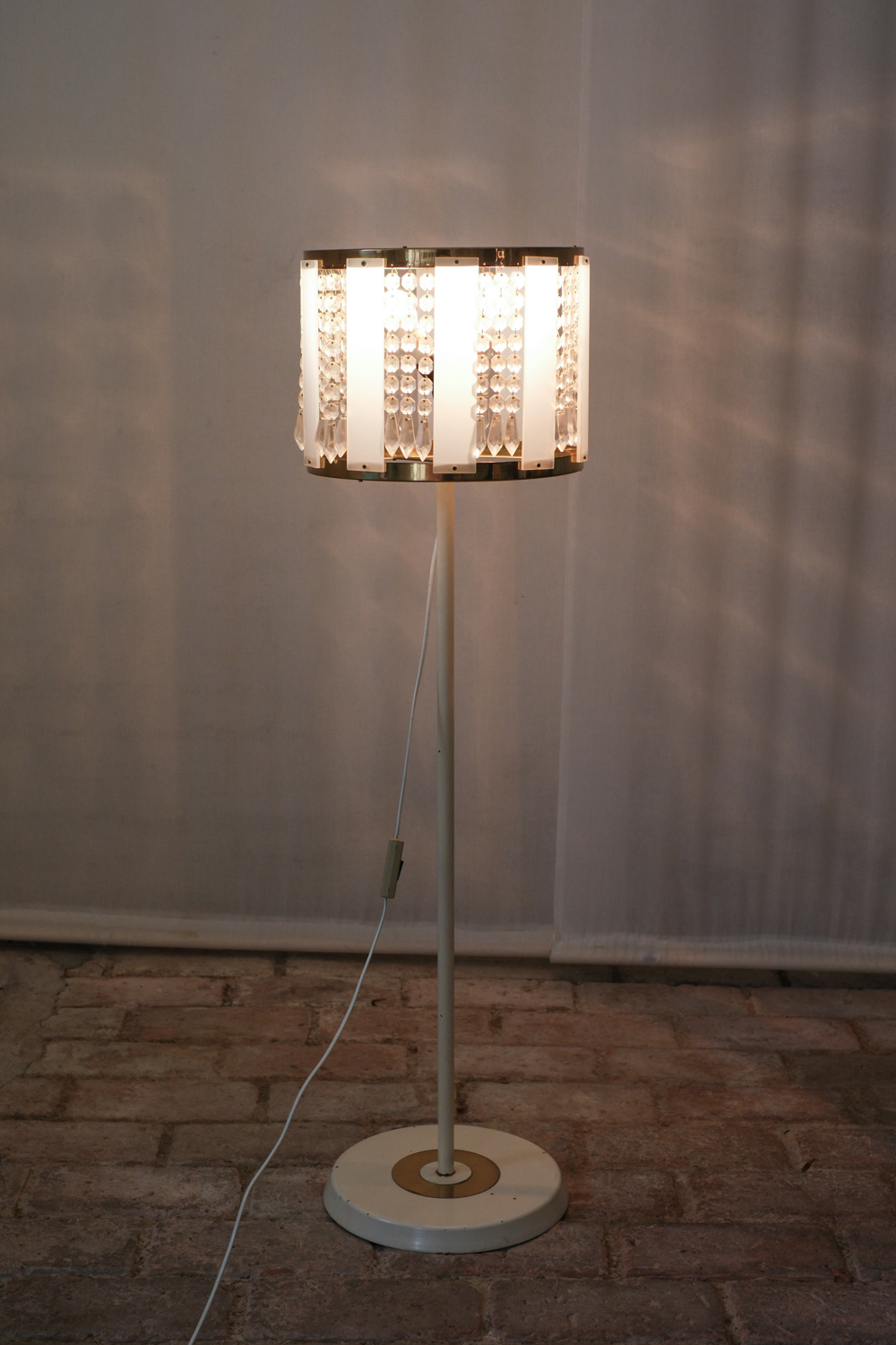 Lehkost, lesk a jemná nostalgie 70. let min. století. Stojací lampa s kovovou konstrukcí v krémovém laku a válcovým stínidlem, které tvoří střídající se akrylátové pásky a závěsné krystaly na mosazném rámu. Světlo se mezi nimi láme a rozptyluje do prostoru s hrou drobných odlesků – působí téměř filmově.