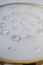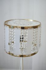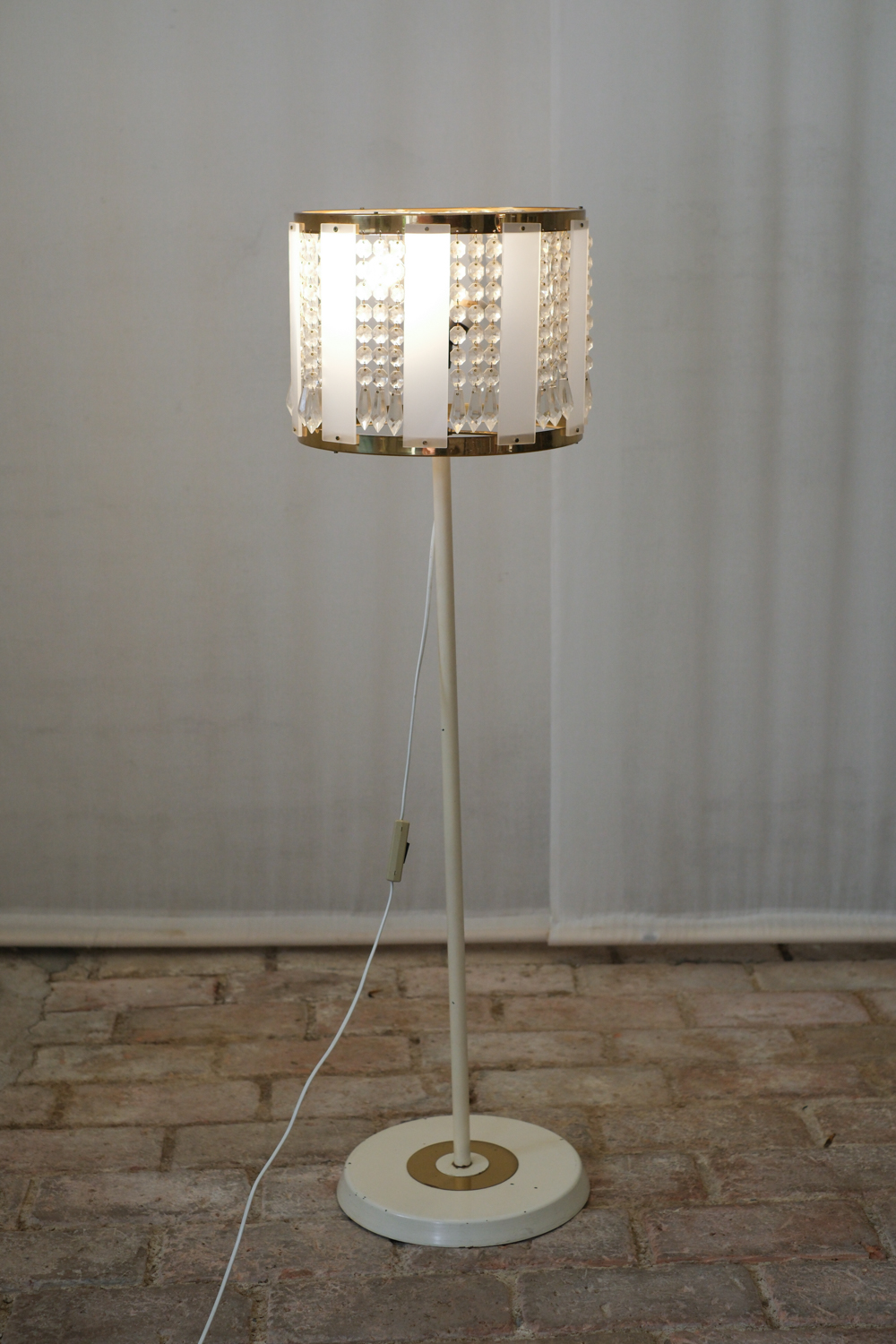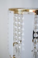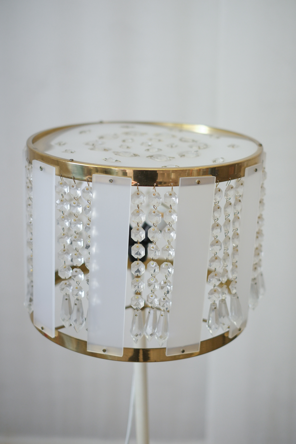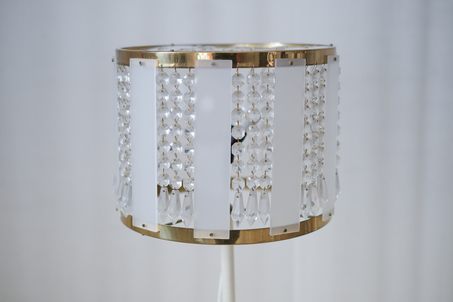 Lehkost, lesk a jemná nostalgie 70. let min. století. Stojací lampa s kovovou konstrukcí v krémovém laku a válcovým stínidlem, které tvoří střídající se akrylátové pásky a závěsné krystaly na mosazném rámu. Světlo se mezi nimi láme a rozptyluje do prostoru s hrou drobných odlesků – působí téměř filmově.